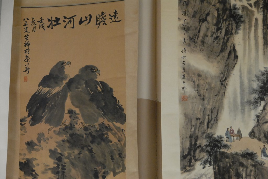 Lot 621: Two Oriental scrolls: Watercolor on paper of waterfall landscape. 43 1/2 x 14 Black and white of two birds in a tree. 38 x 17