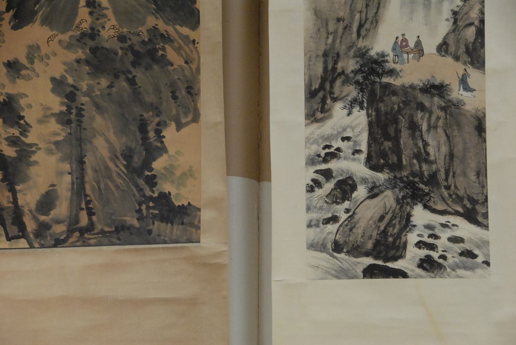 Two Oriental scrolls: Watercolor on paper of waterfall landscape. 43 1/2 x 14 Black and white of two birds in a tree. 38 x 17