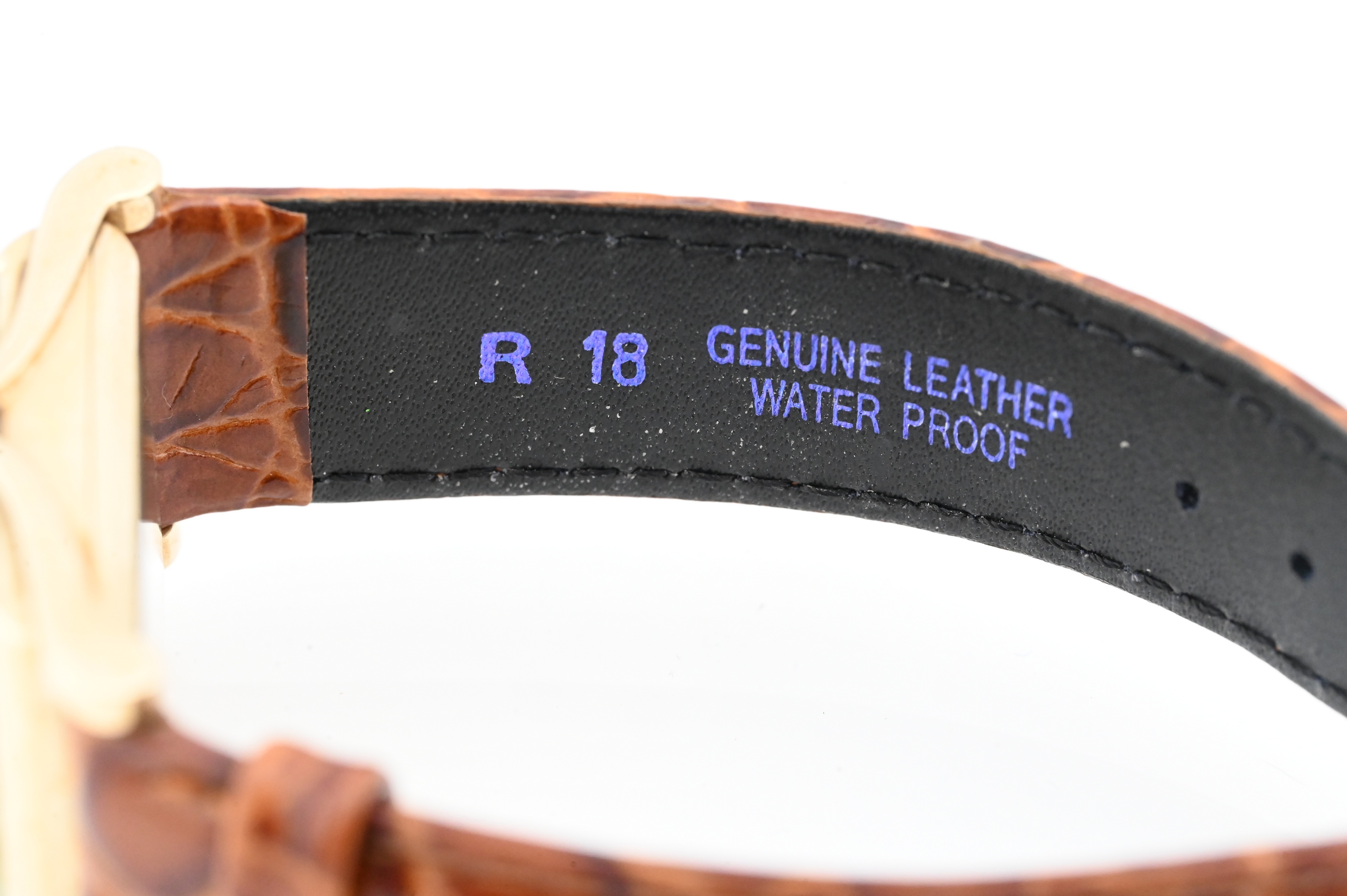 off-white dial with baton markers and Arabic 12; subsidiary seconds, 14K gold case with hooded lugs; brown strap, manual-wind