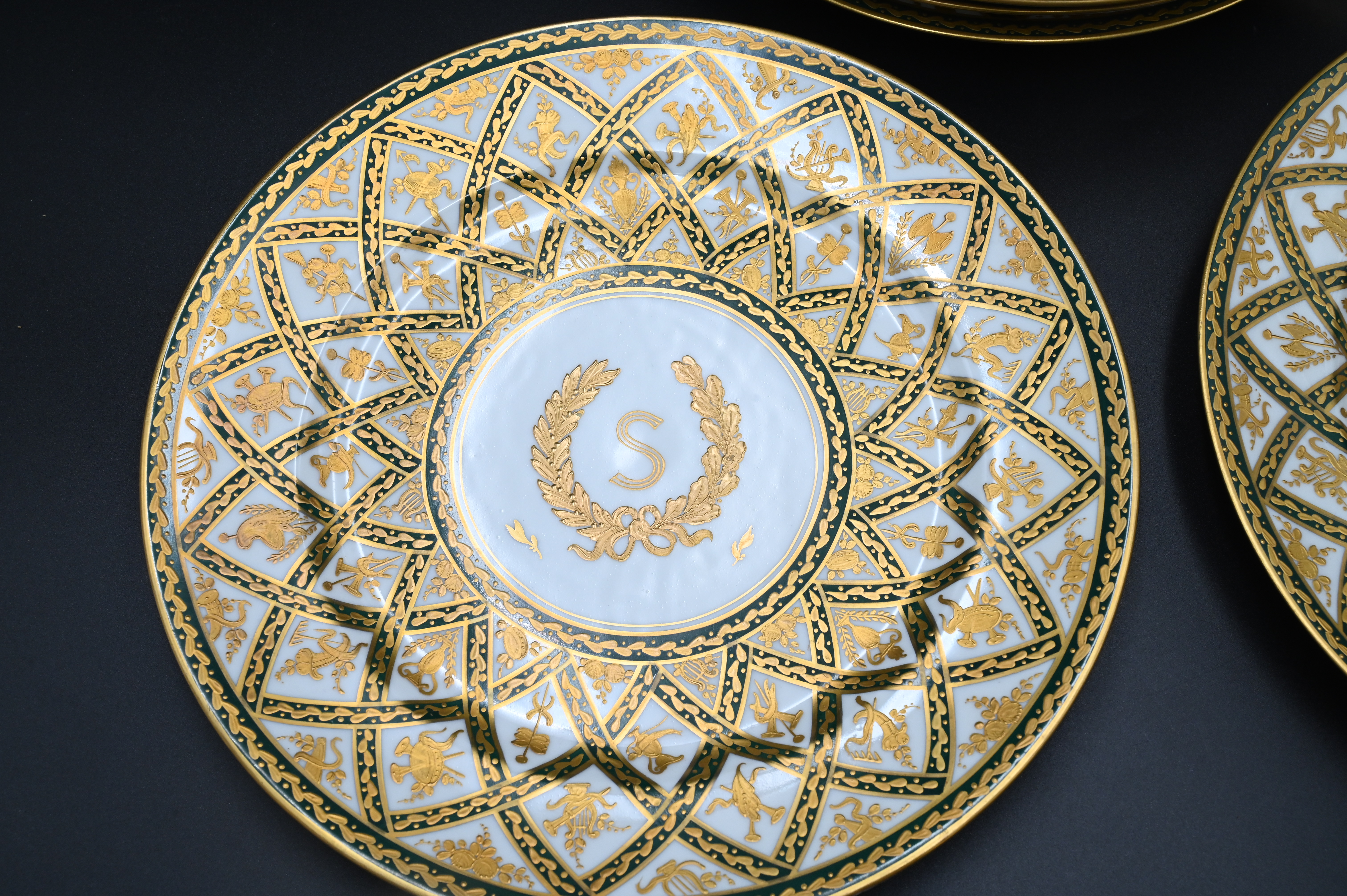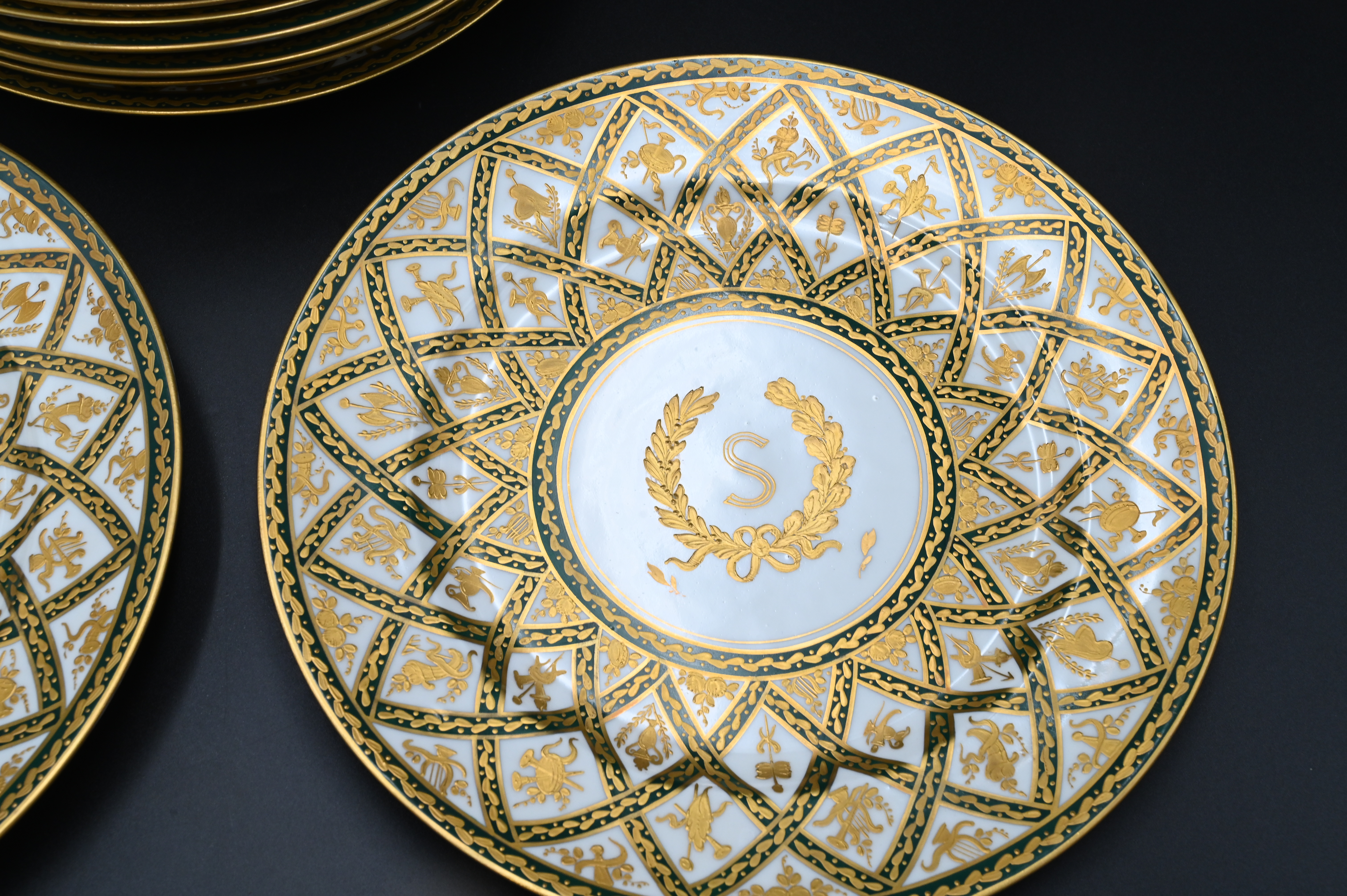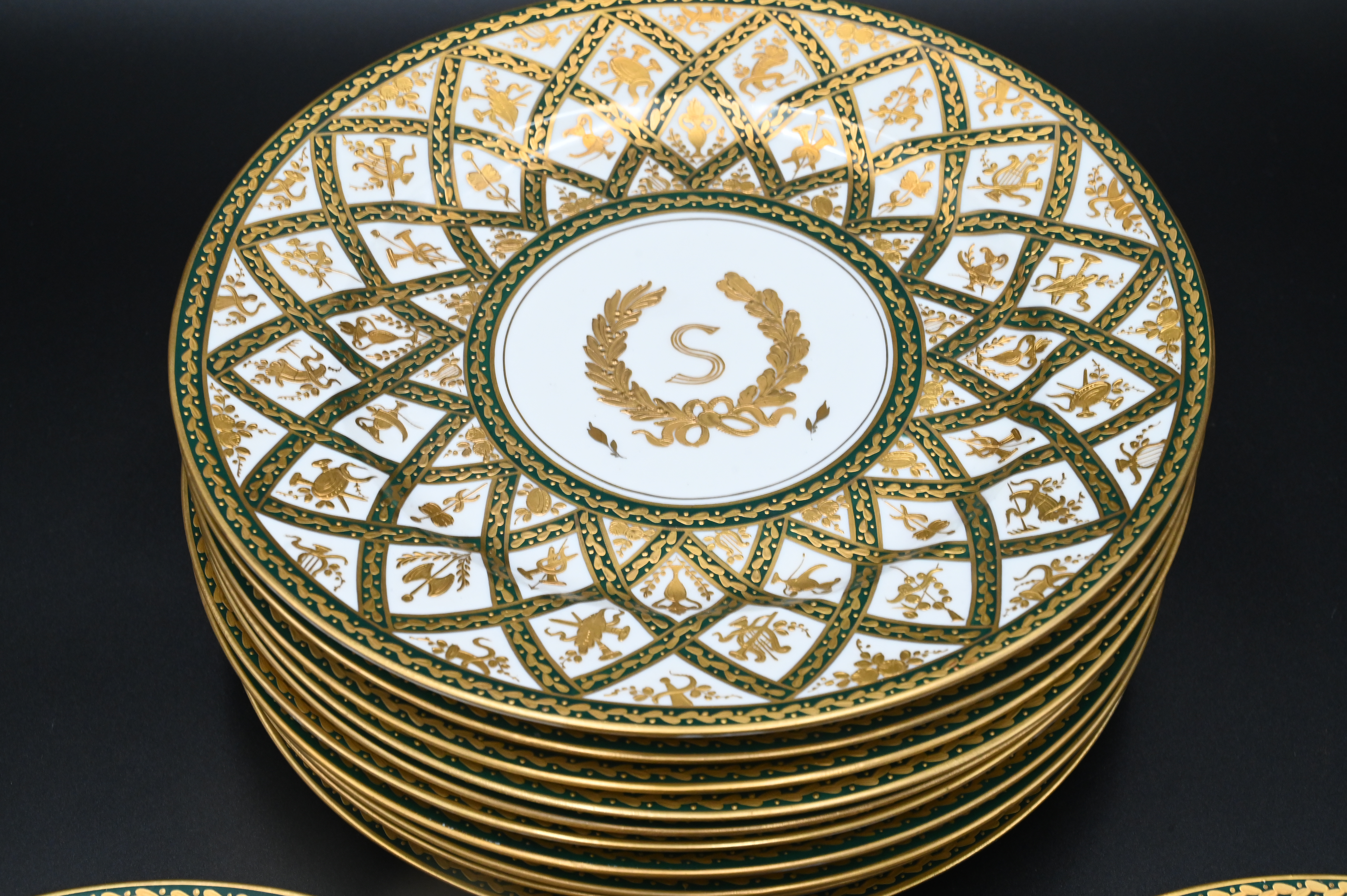 having painted heavy gilt, gold and green basket decoration, border and wreath around “S” center
