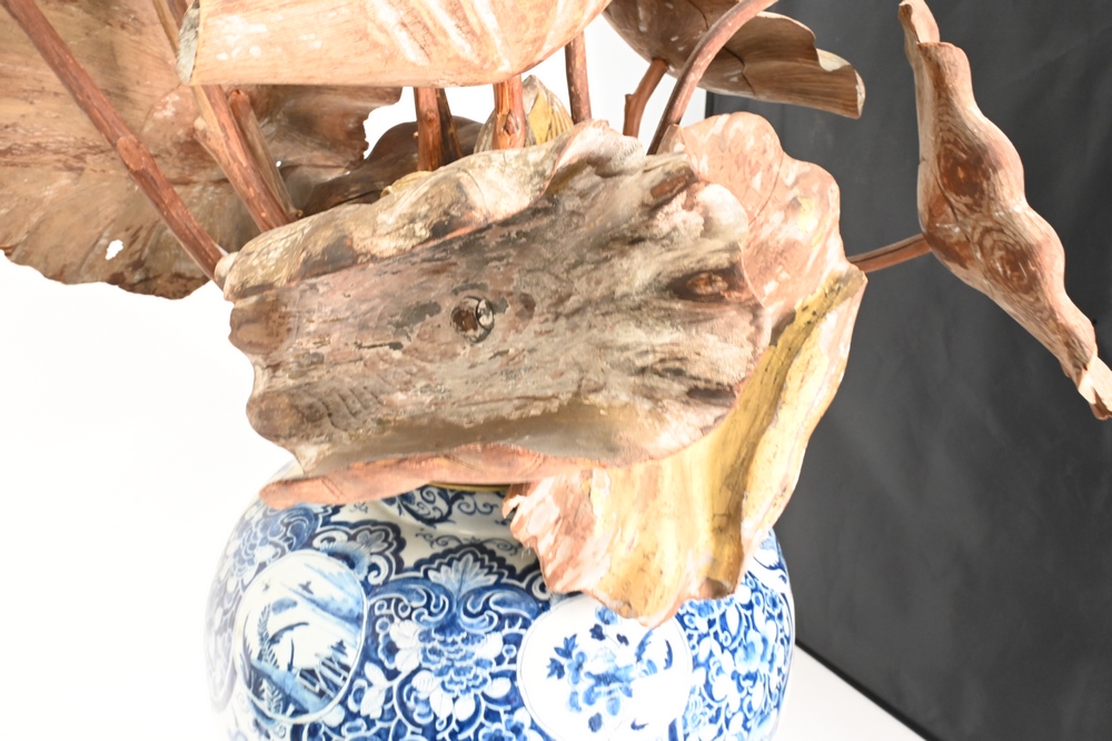 Group of Carved Giltwood Models of Blossoming Lotus Flowers, to include 14 flowers and buds, most paint and gilt is worn, largest 38 inches.