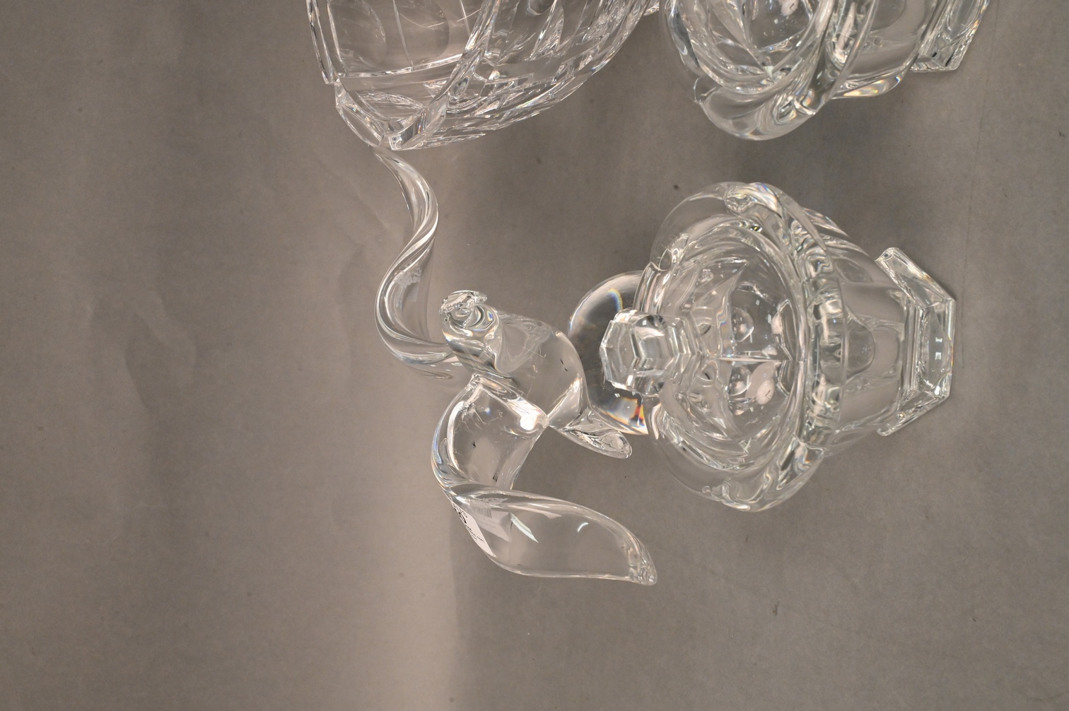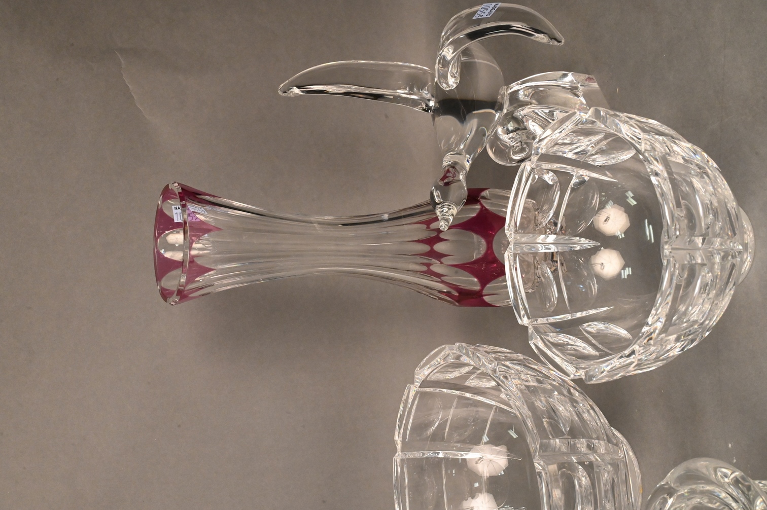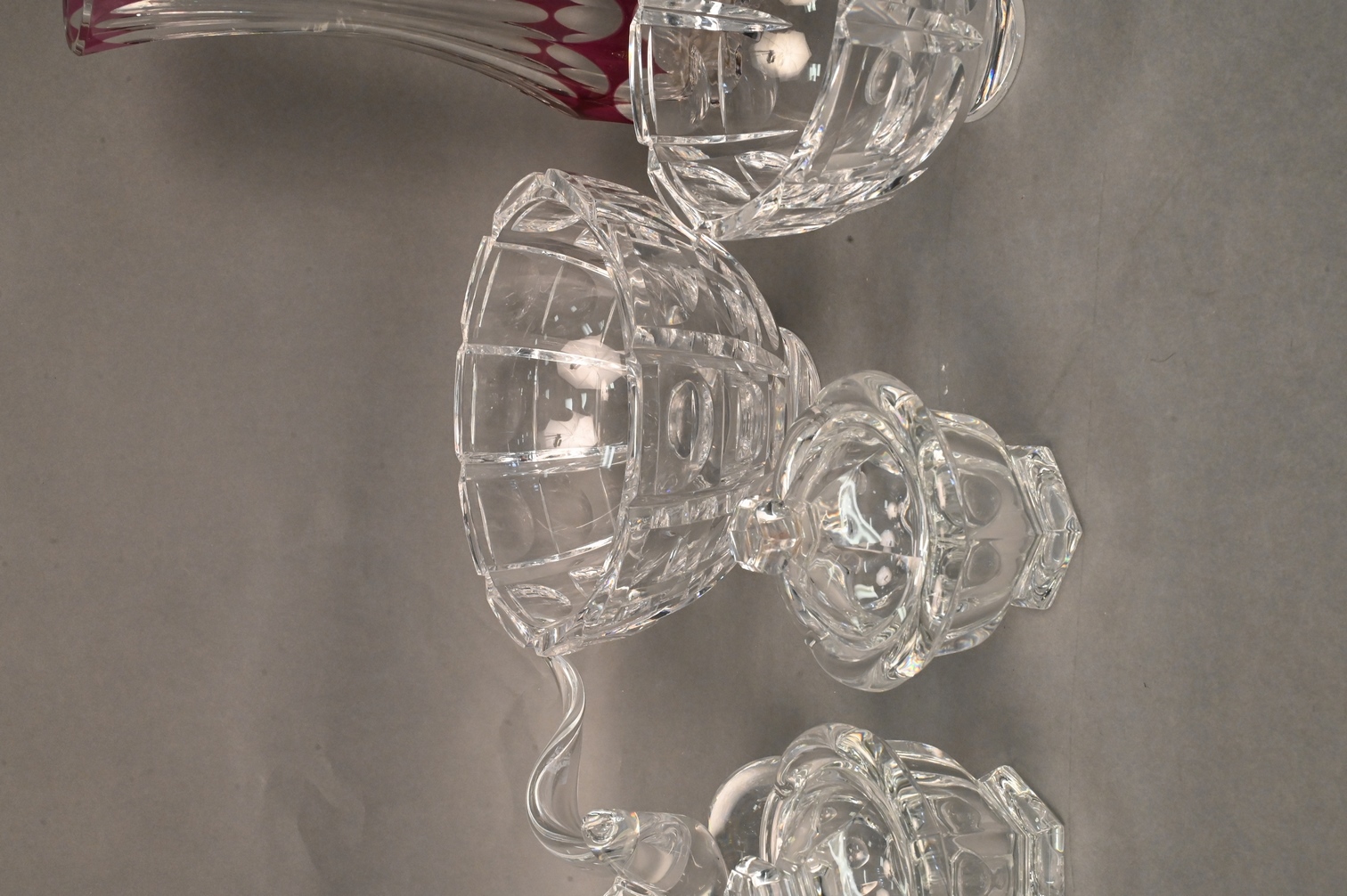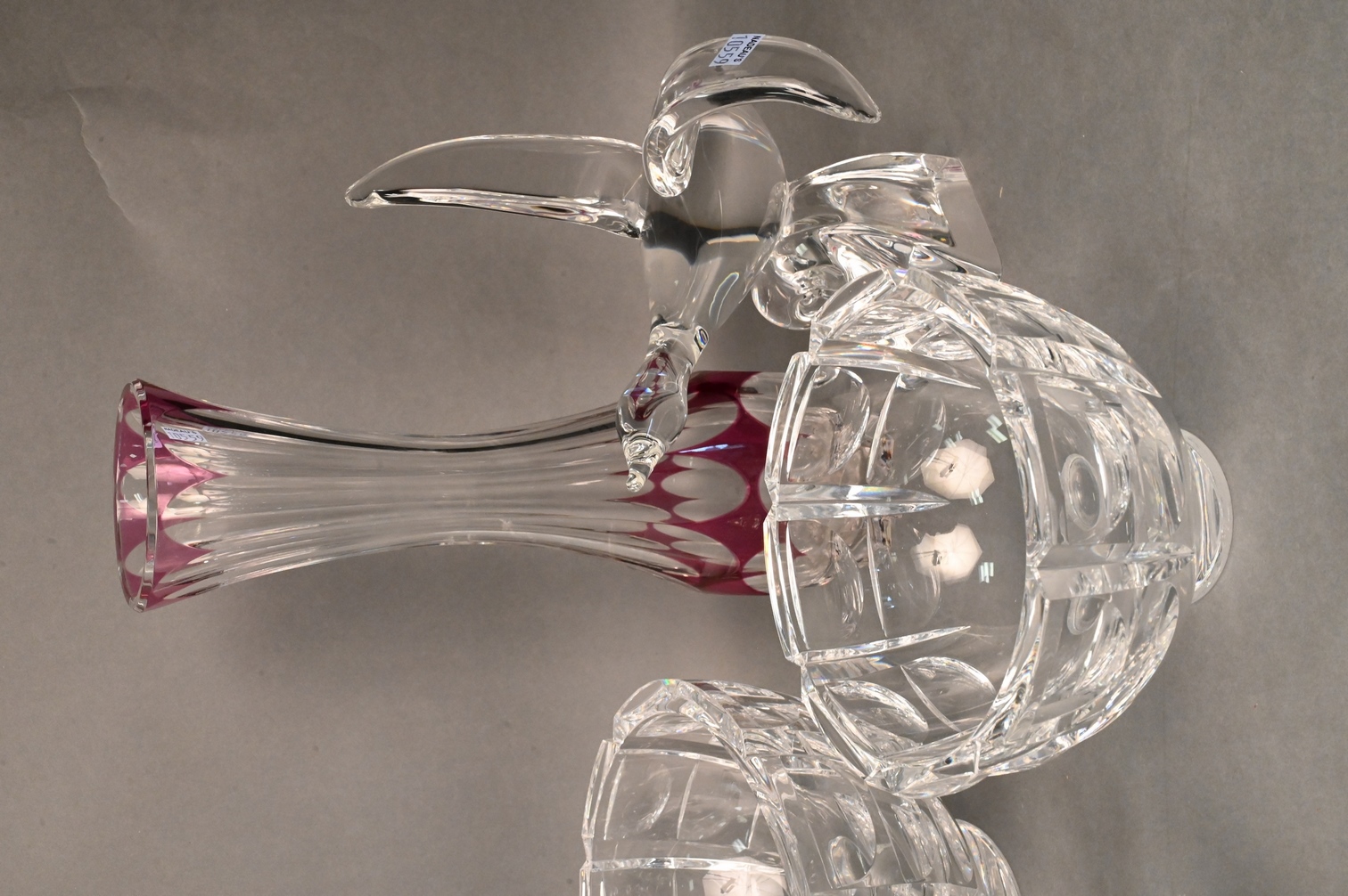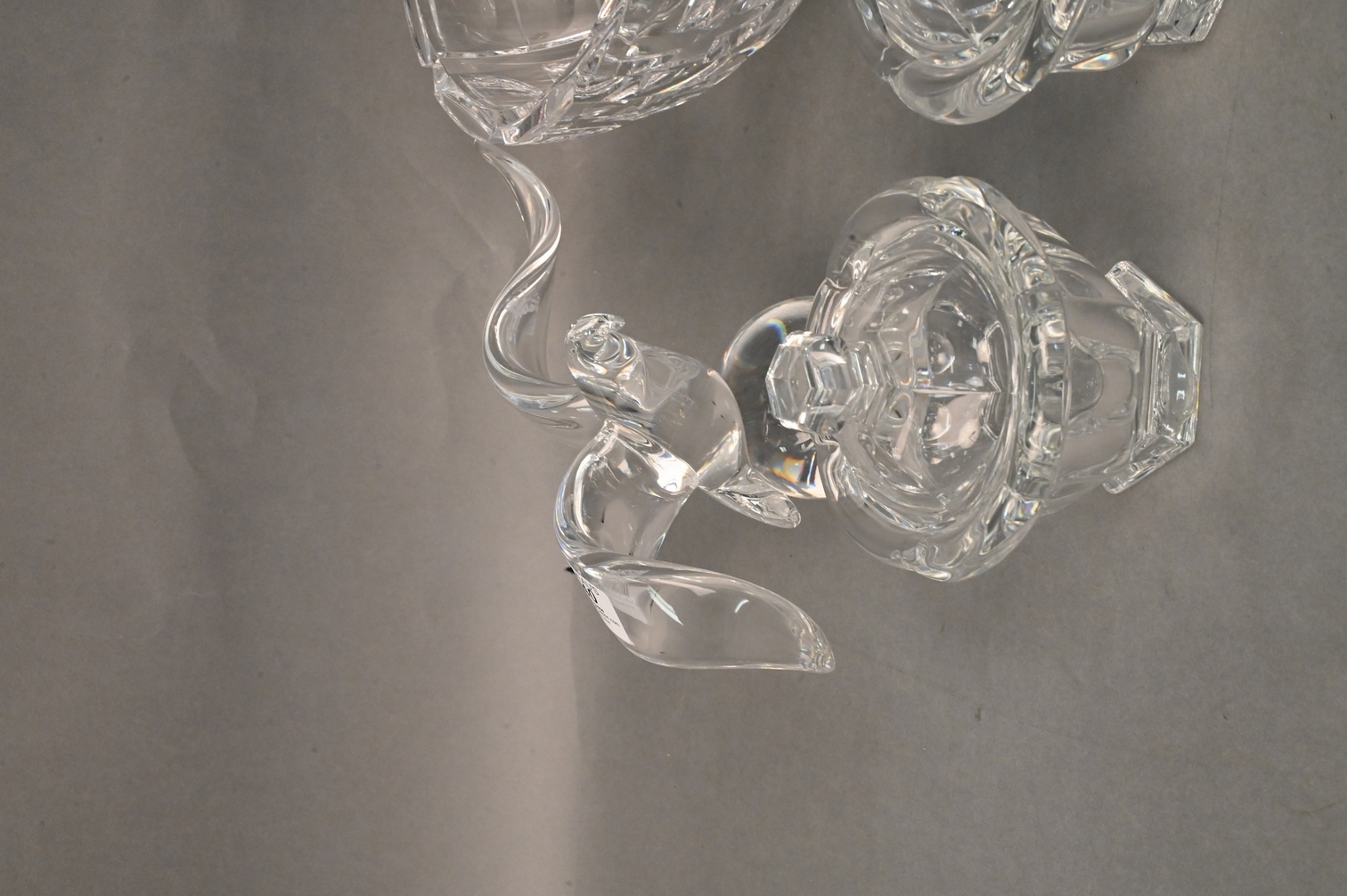 to include St. Louis cut crystal case having ruby accents, two Steuben birds, one duck (repaired), one bird on orb, pair of Baccarat sweetmeats / covered candy dishes, two Orrefors “Thousand Window” footed bowls