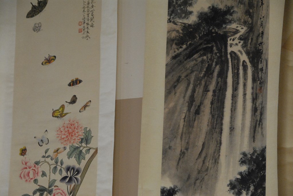Lot 623: Two Oriental scrolls: watercolor on paper waterfall landscape. 43 x 14 scroll with butterflies and flowers. 37 x 12 1/2