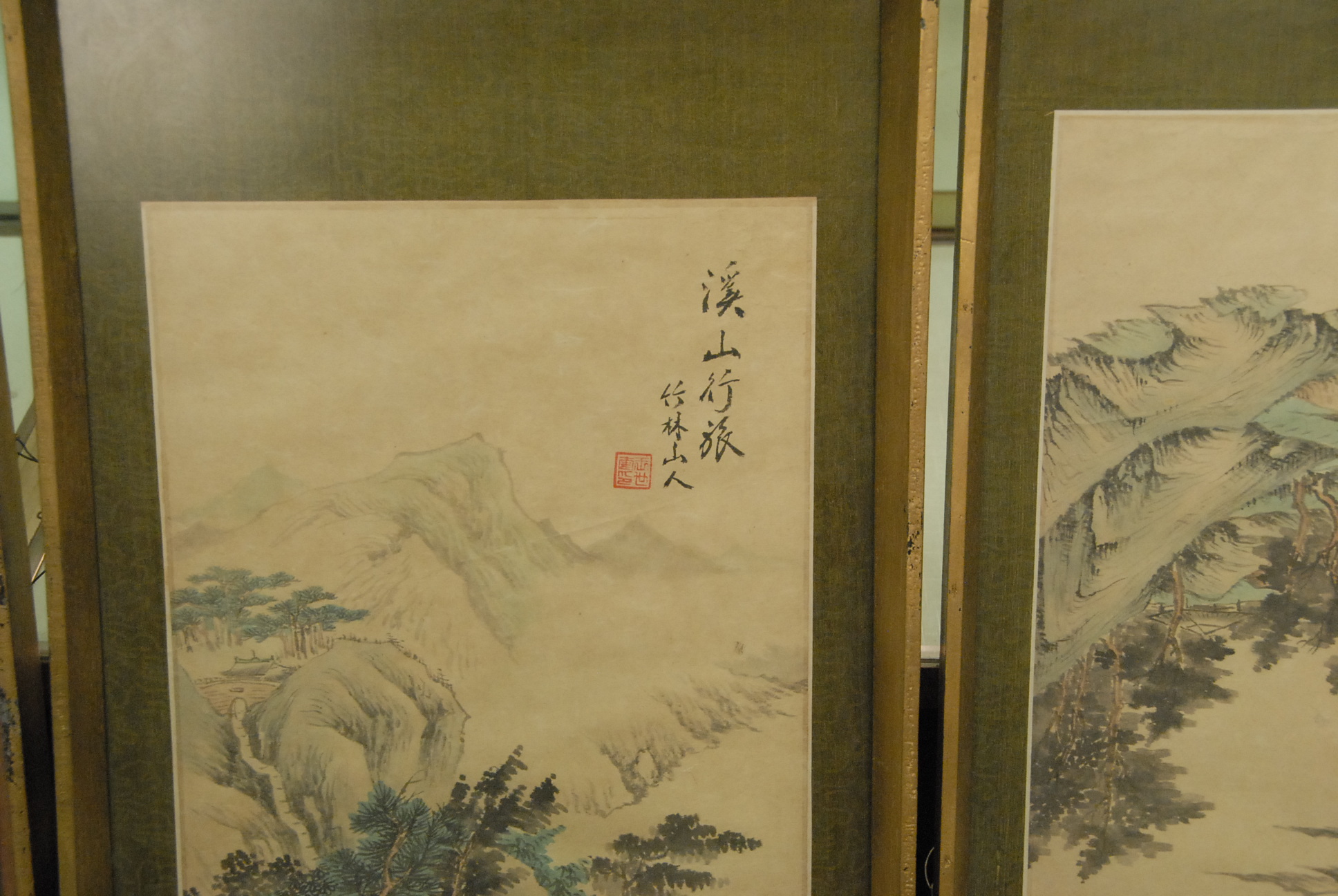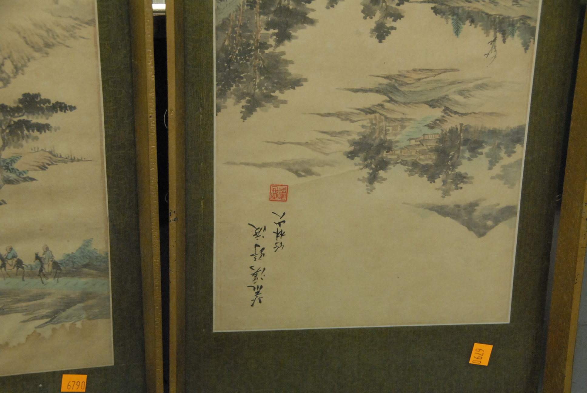 Three Oriental watercolor on paper framed landscapes. sight size: 19 1/2 x 10