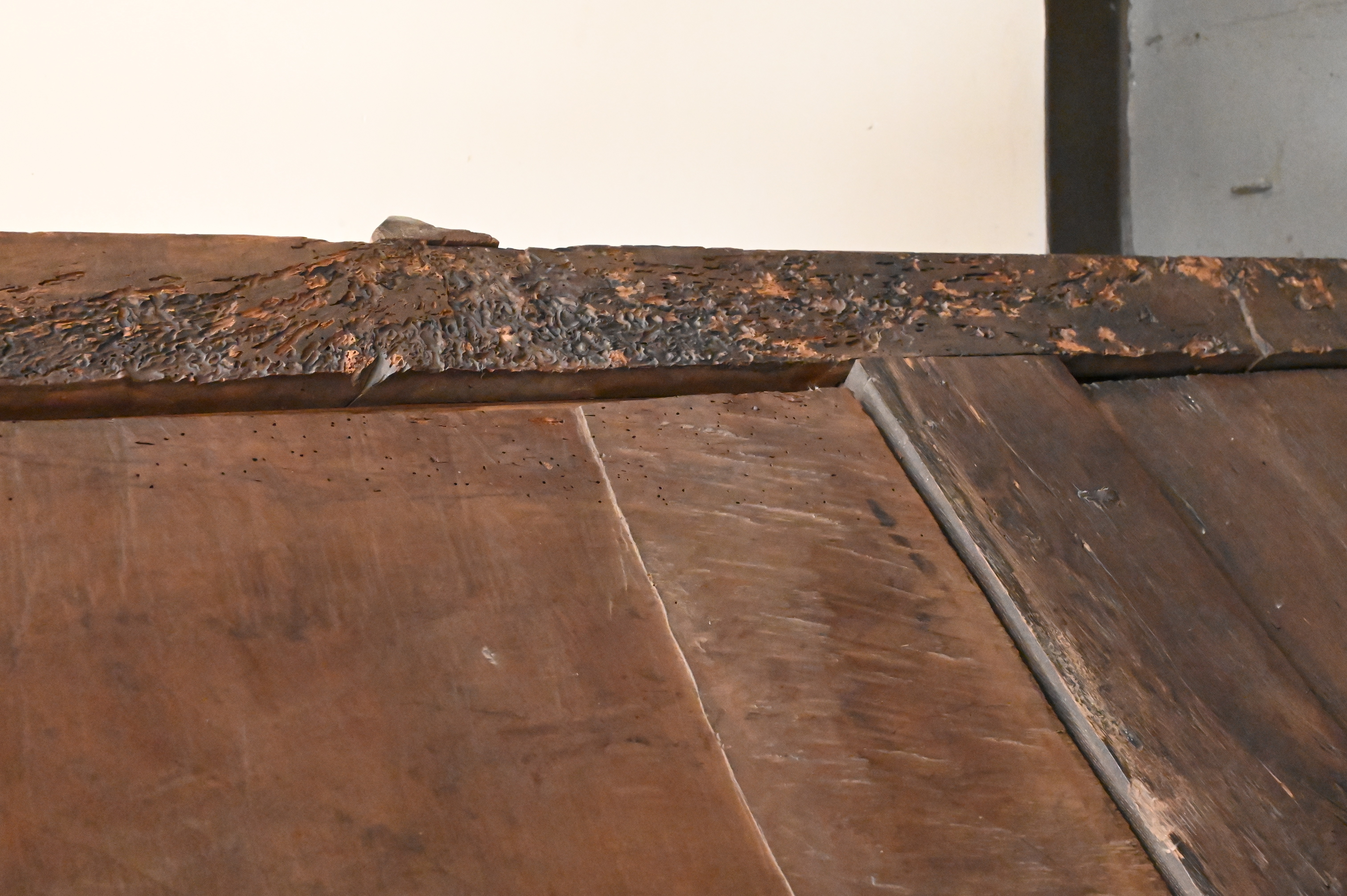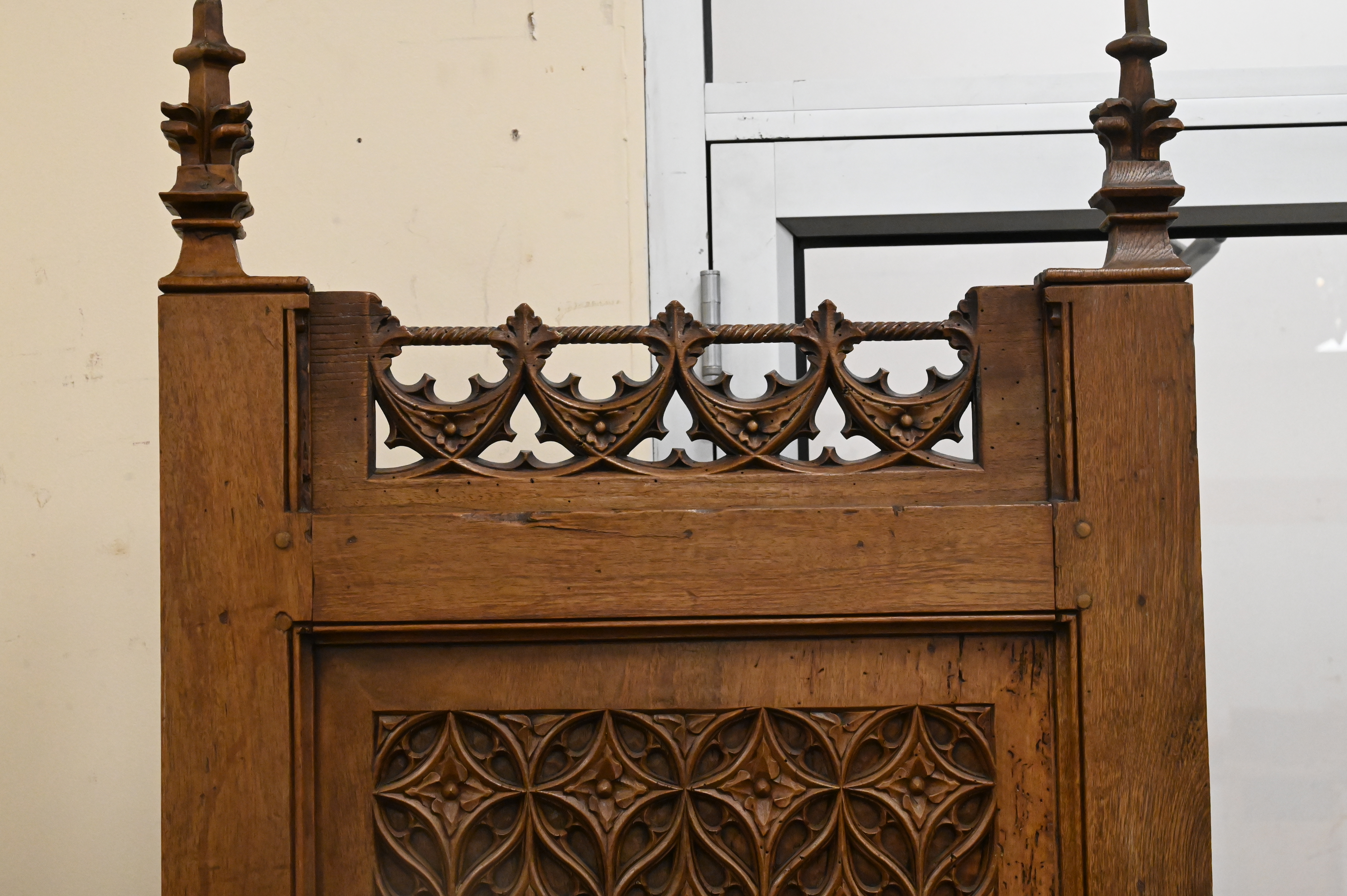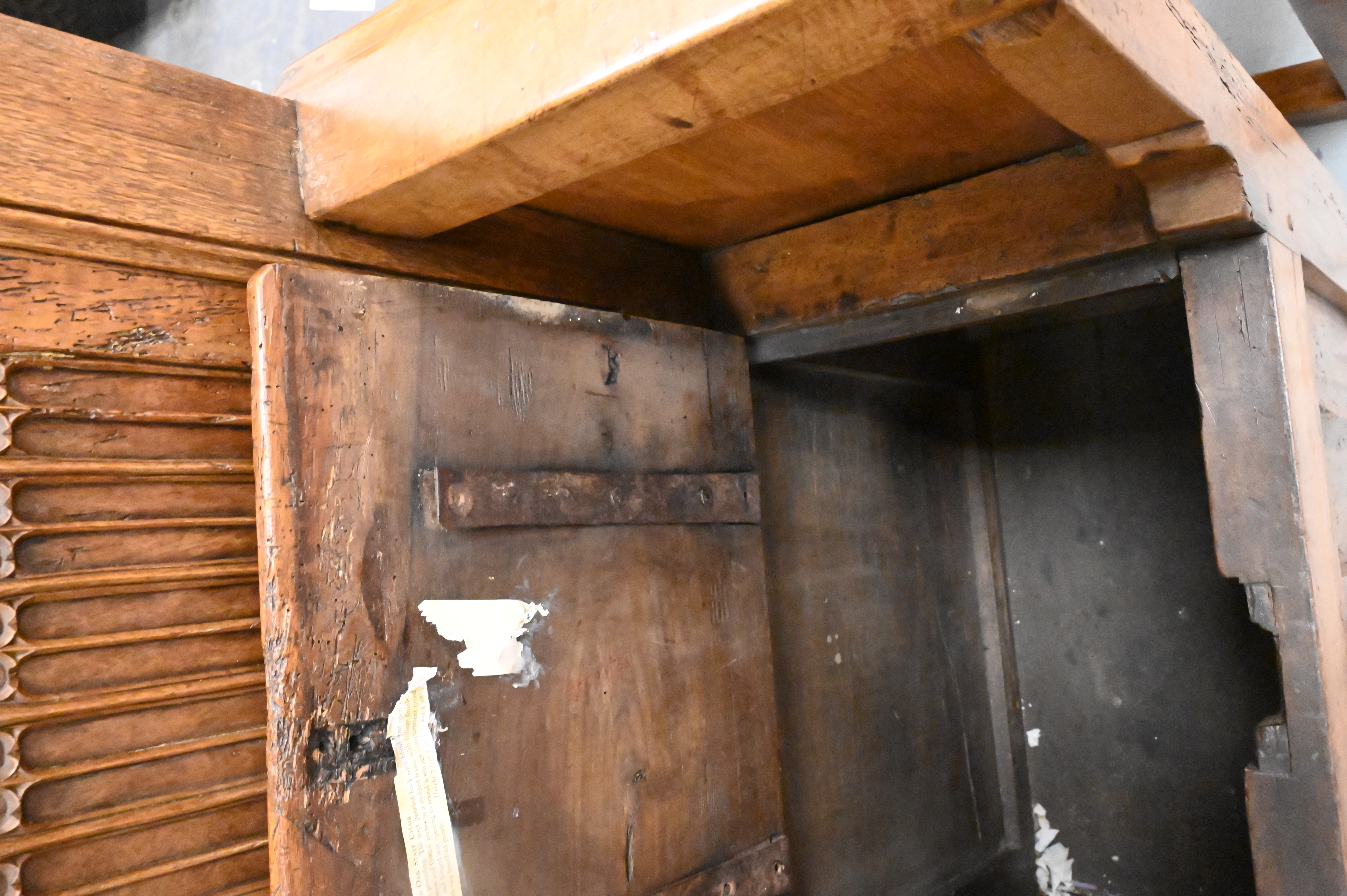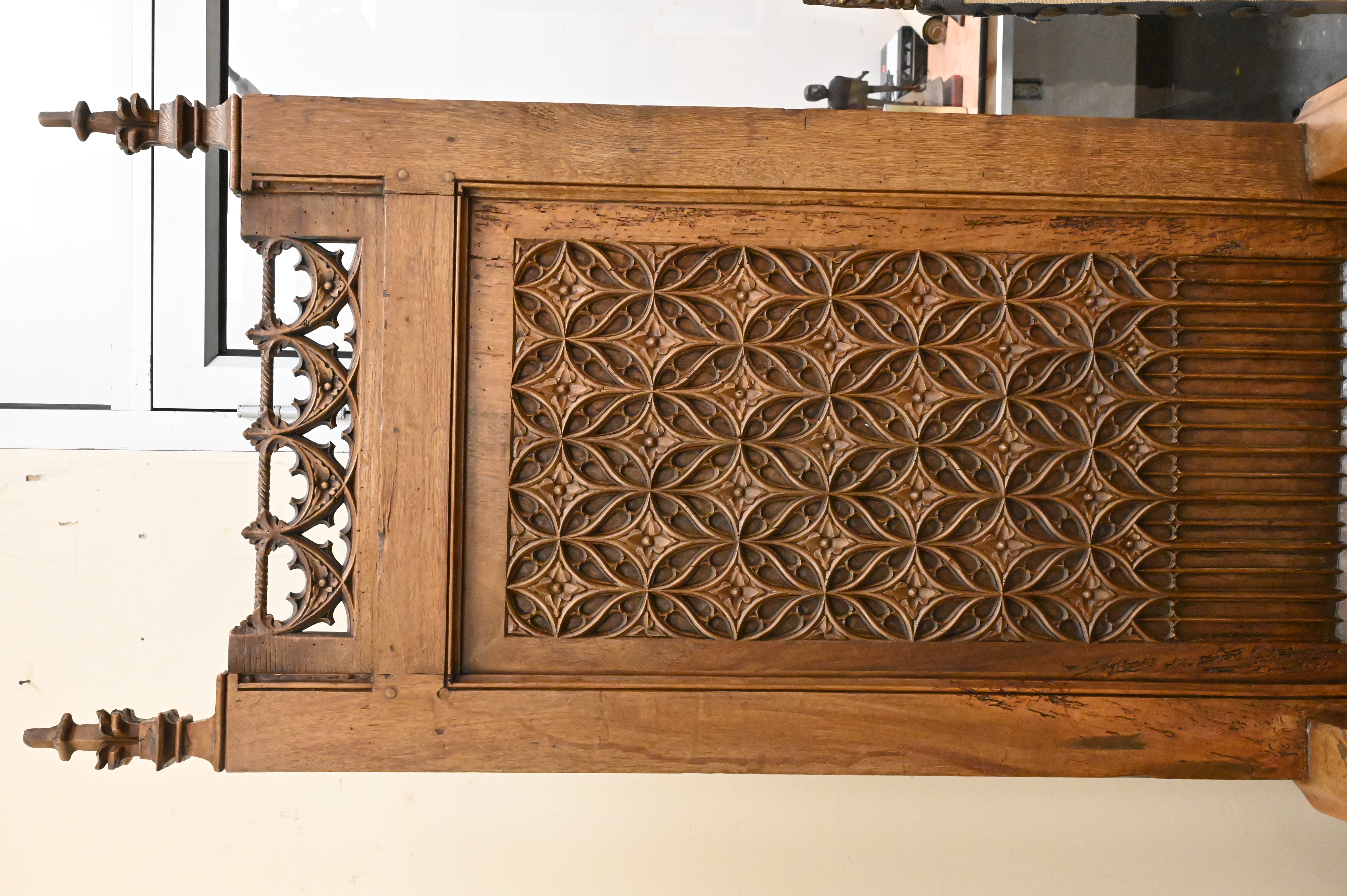 having high pieced finialed back with carved Gothic back panel above a plank seat, opening to reveal a well, front with linenfold panels, restored, 17th – 18th century