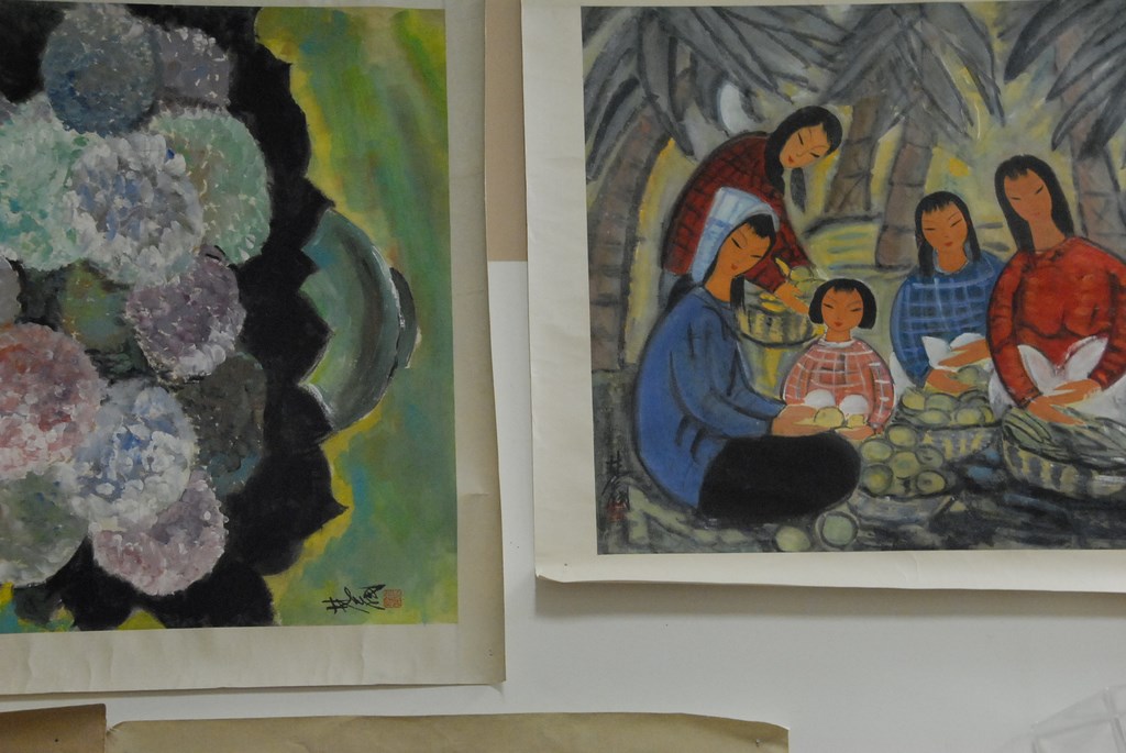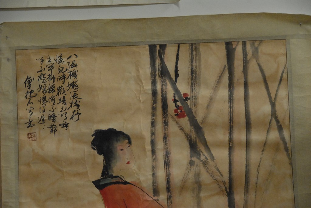 Group of three Oriental paintings on paper: flowers, Guanyin standing, and family. 26 x 26