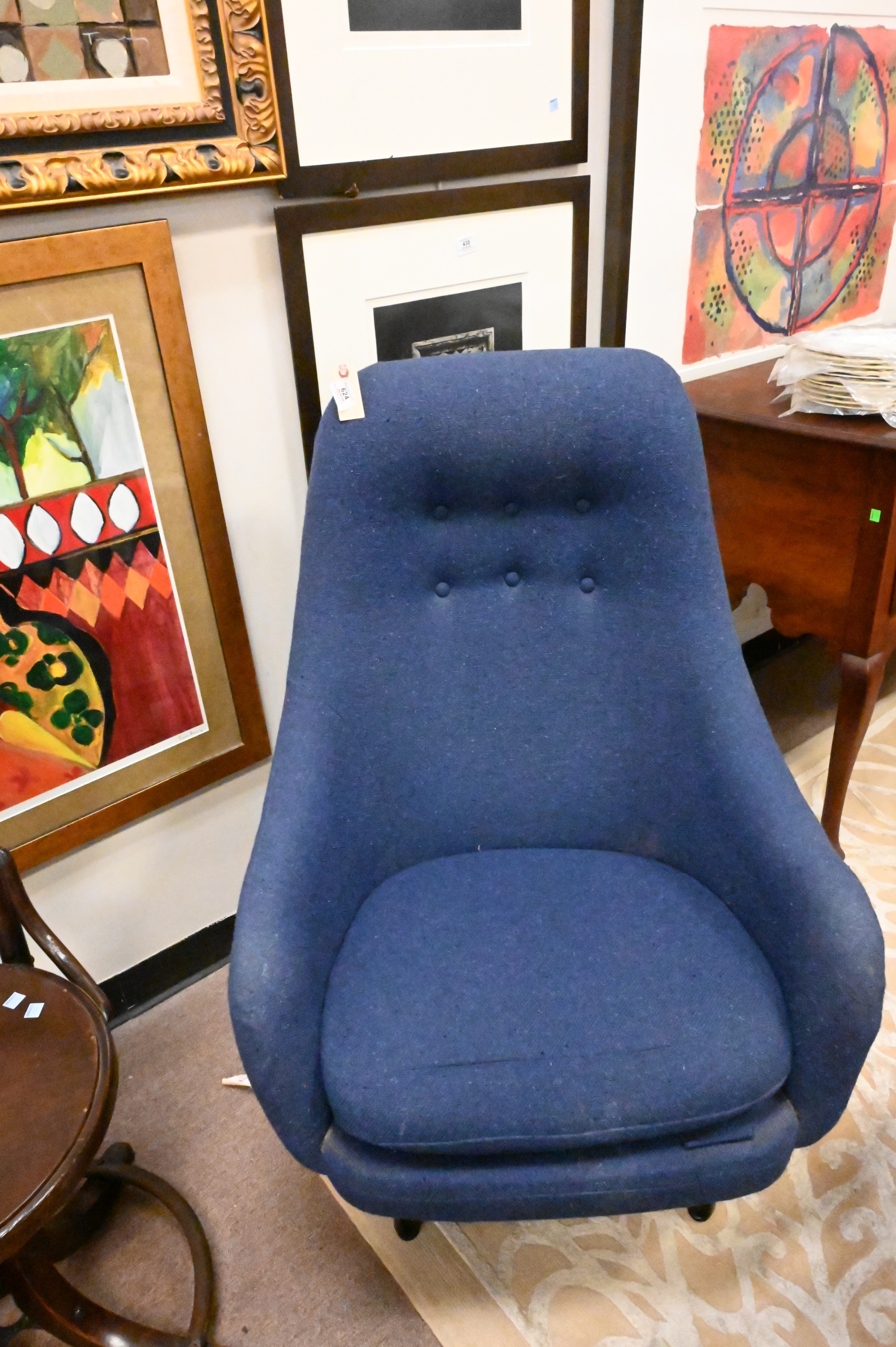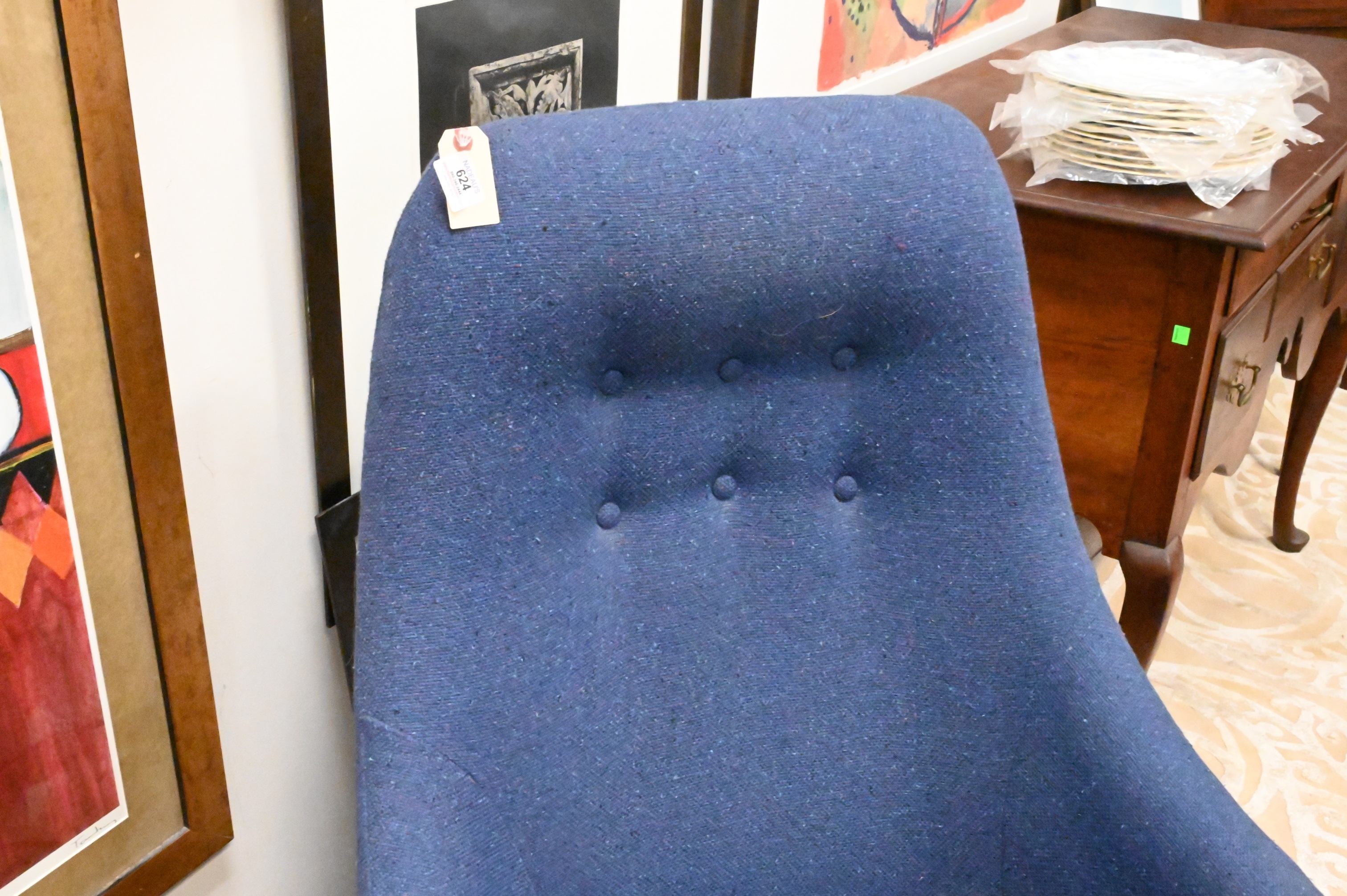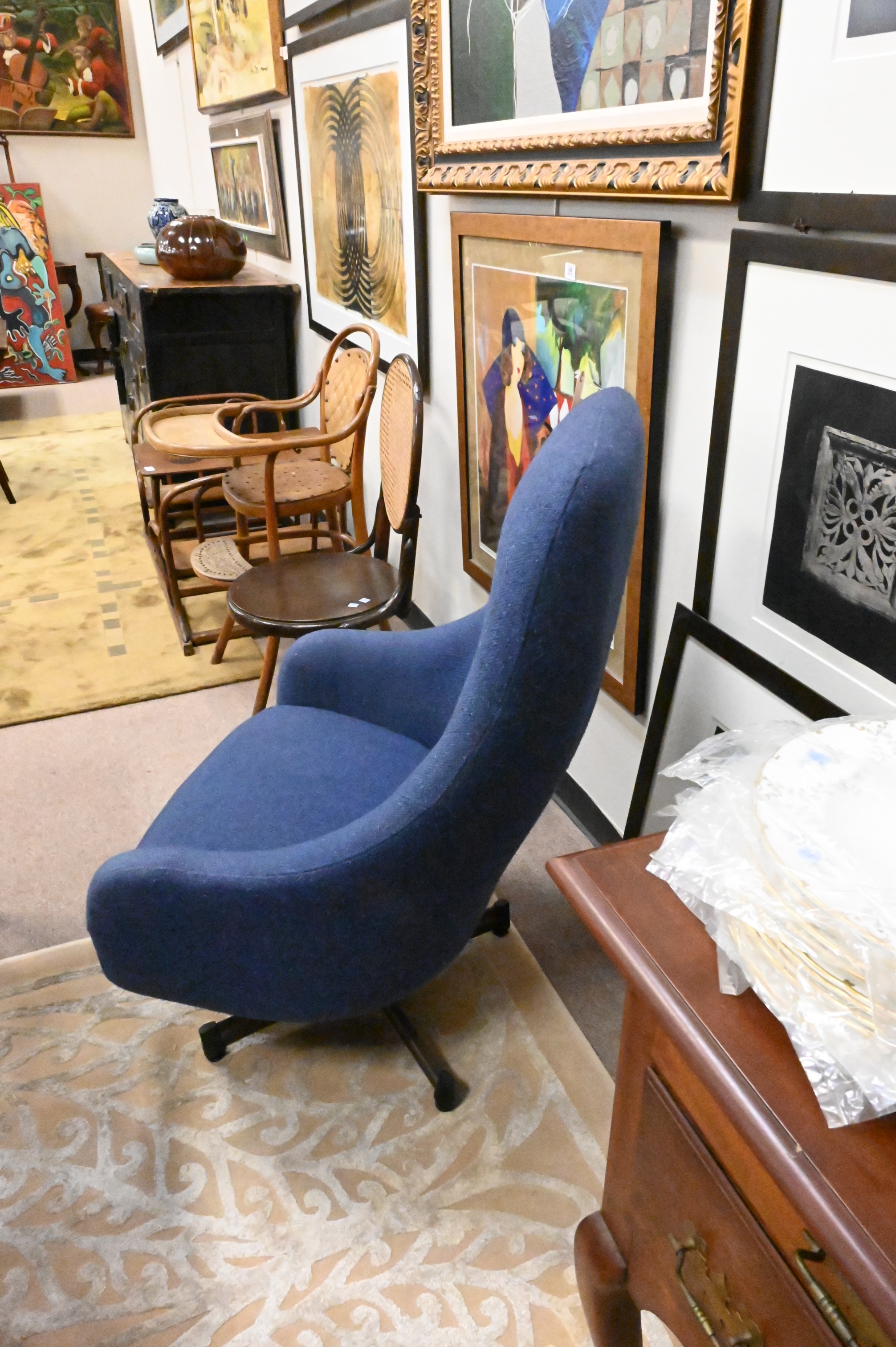 Mid. Century Upholstered Swivel Club Chair, set on industrial base, height 41 1/2 inches, width 29 inches