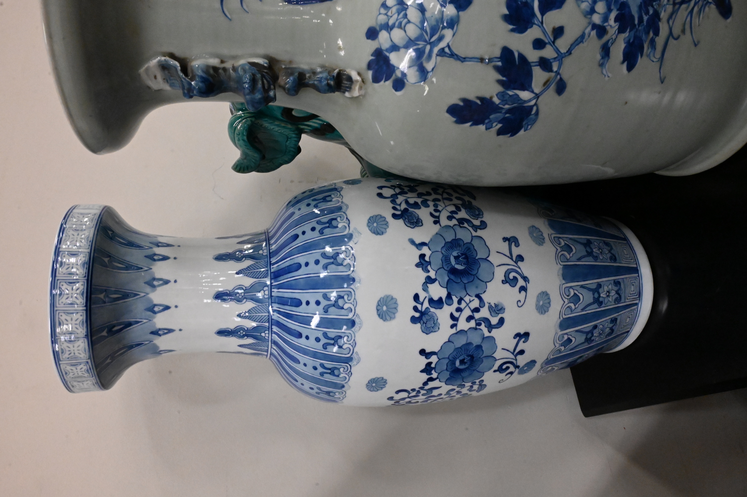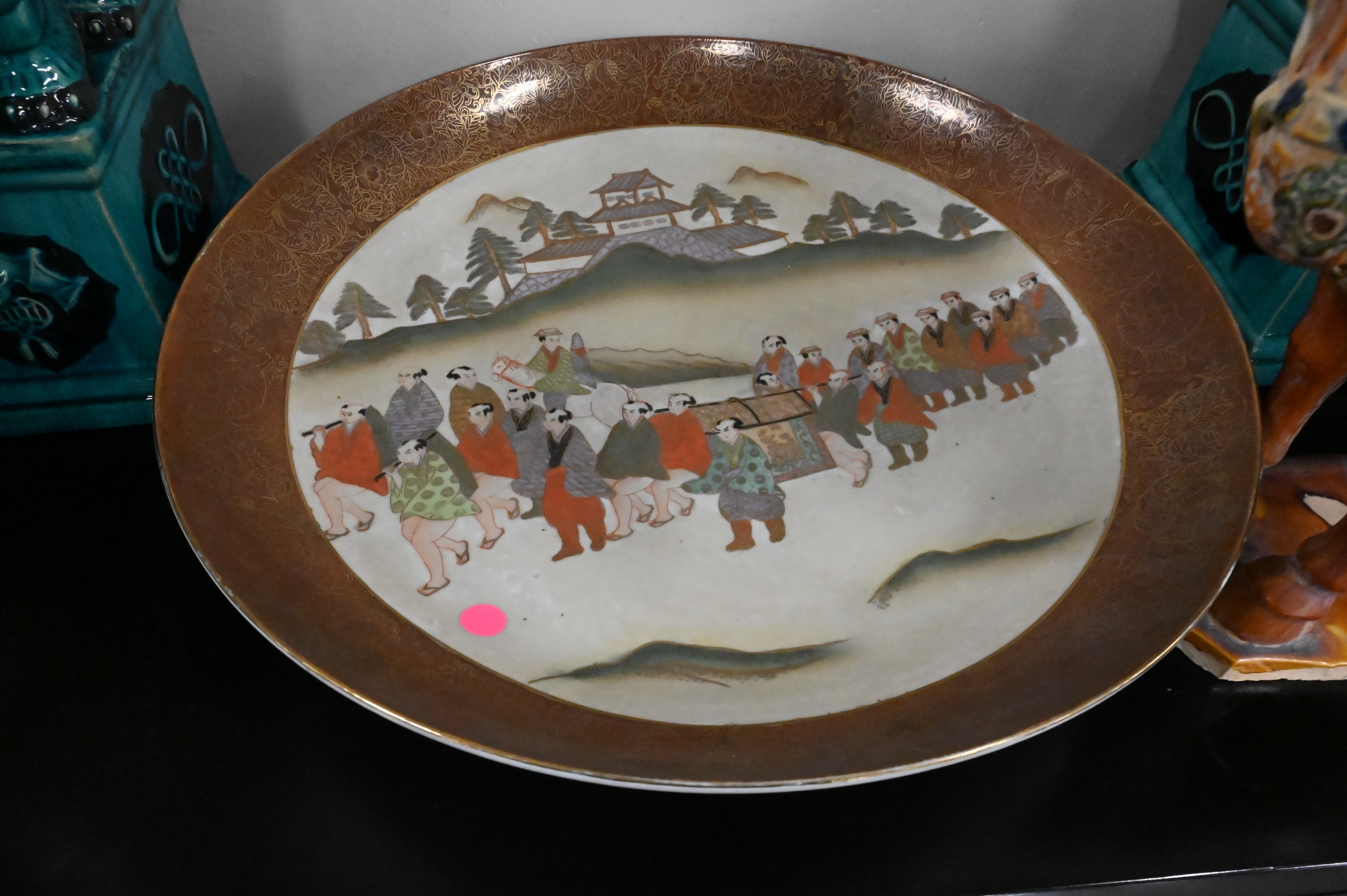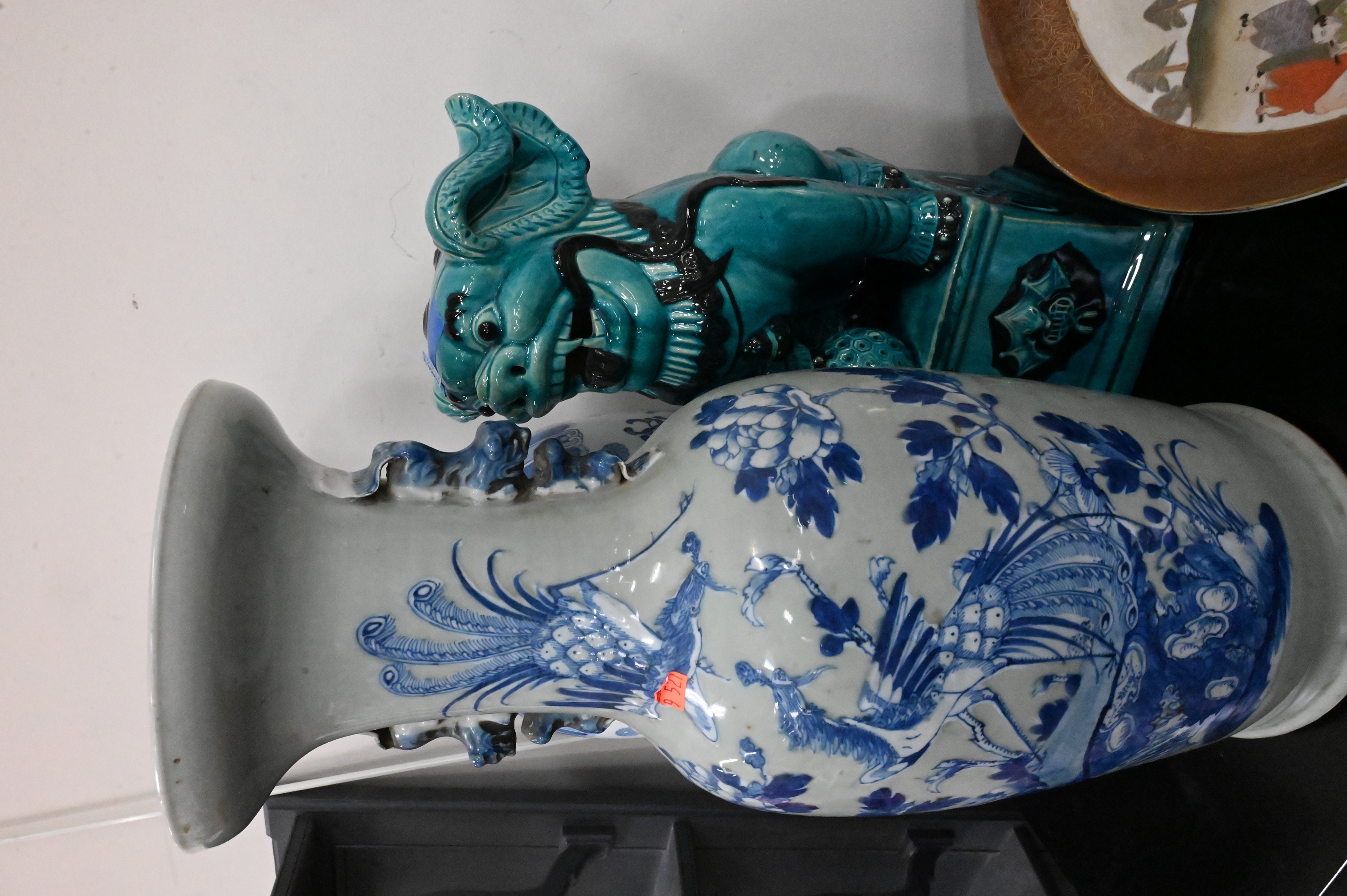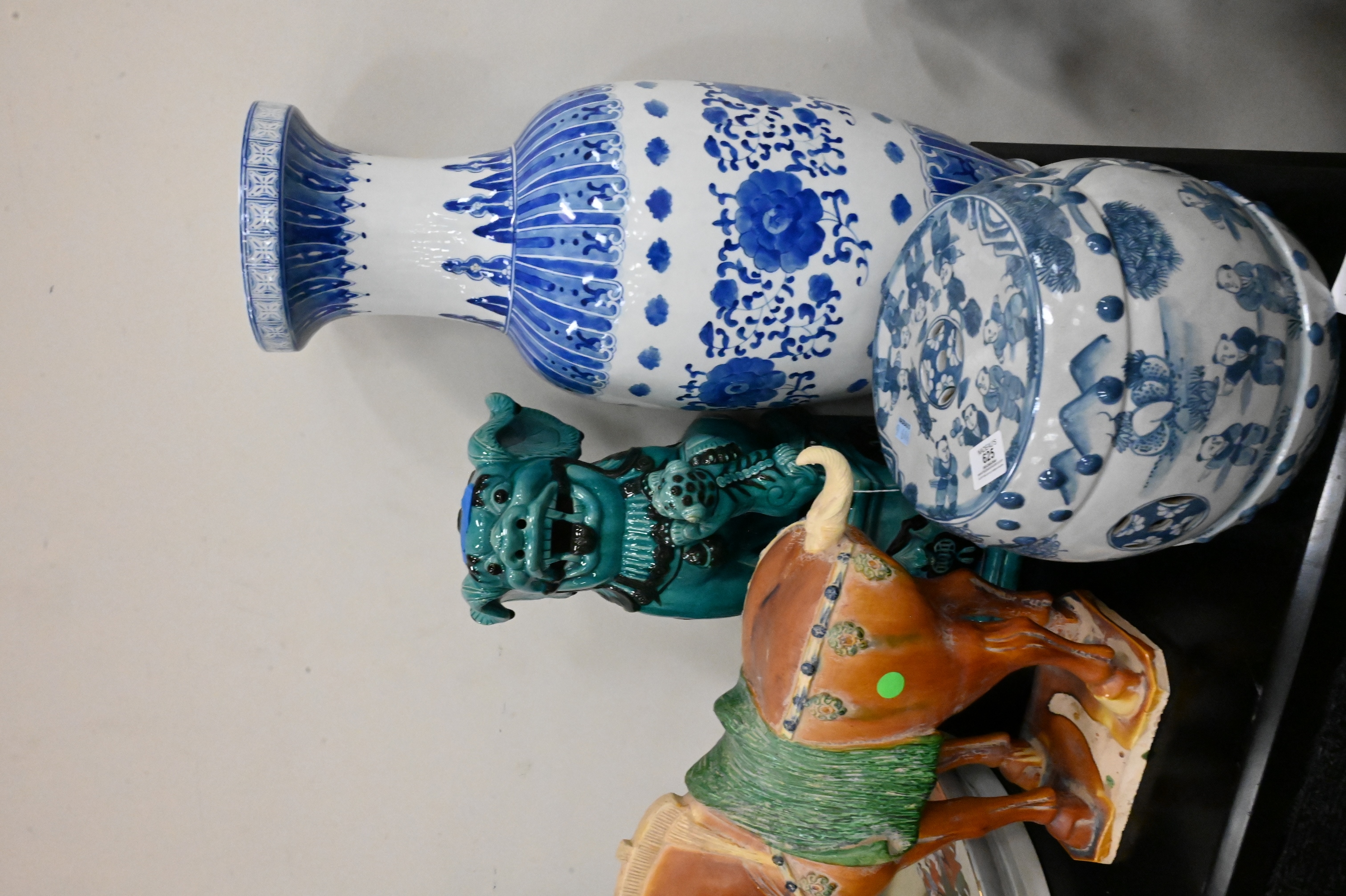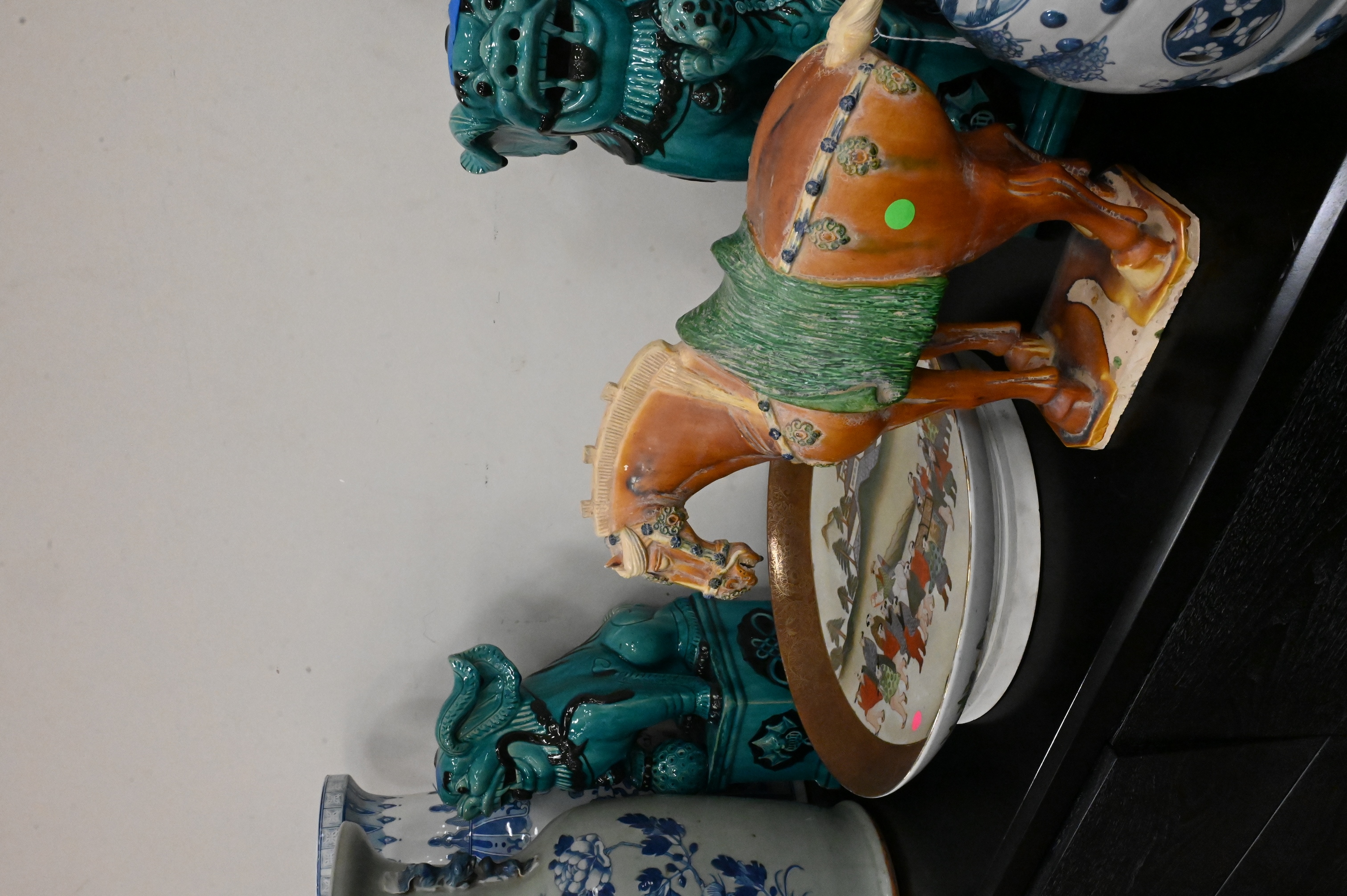 to include pair of turquoise foo dogs, a near pair of blue and white vases, blue and white garden seat, dragon handle vase, large Satsuma charger, Tang style horse