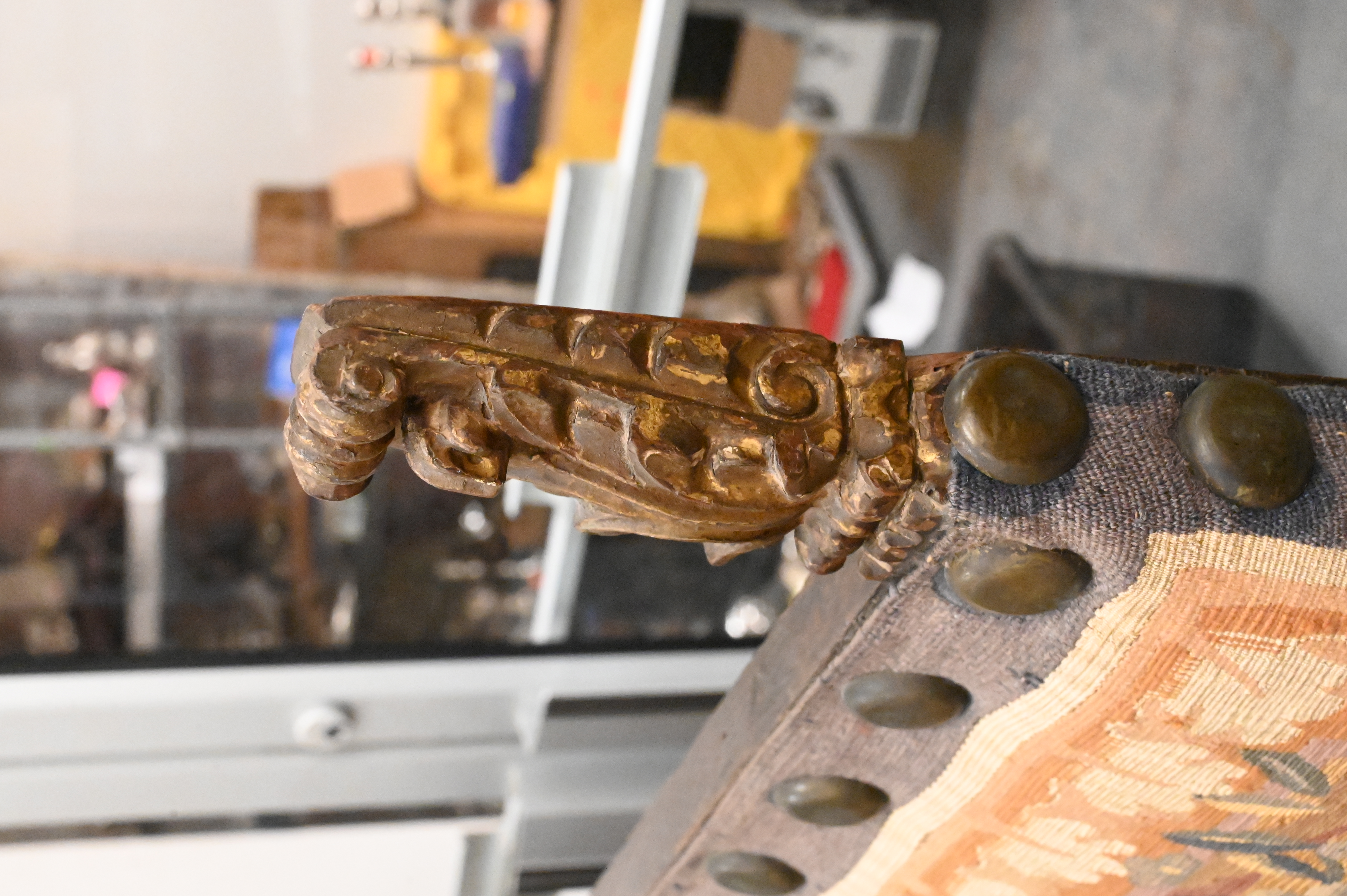 having Aubusson upholstered back and seat arms terminating in scrolls, raised on straight legs joined by stretchers, restored, 18th century