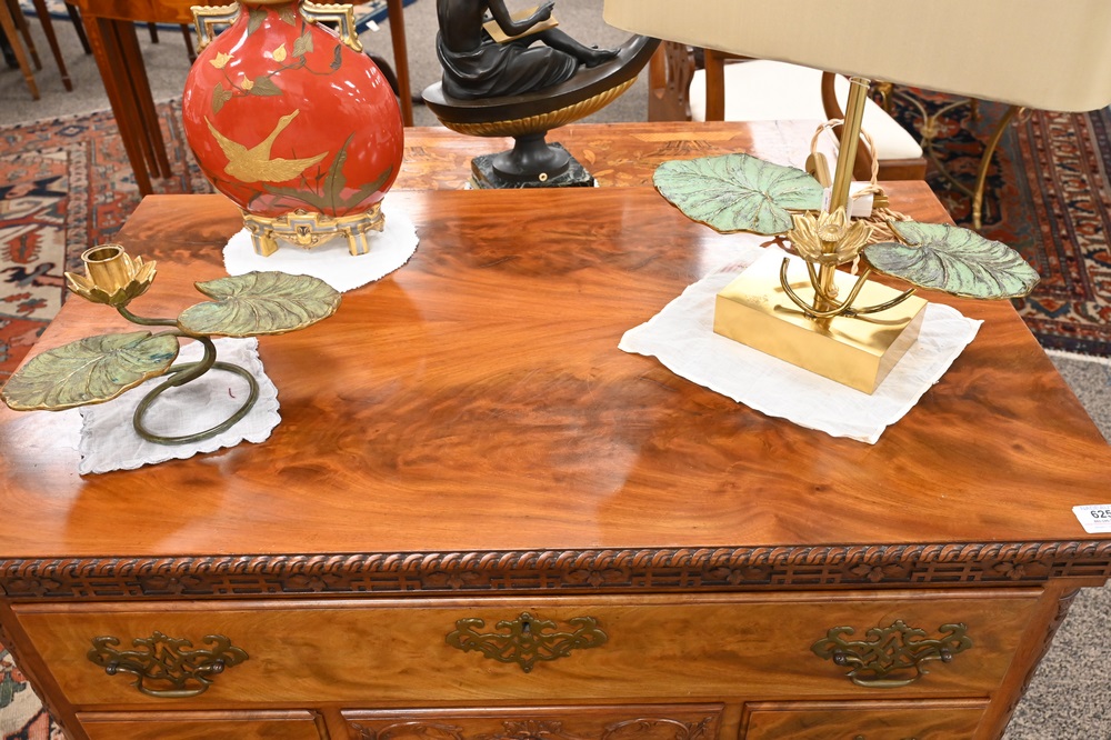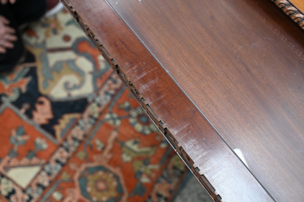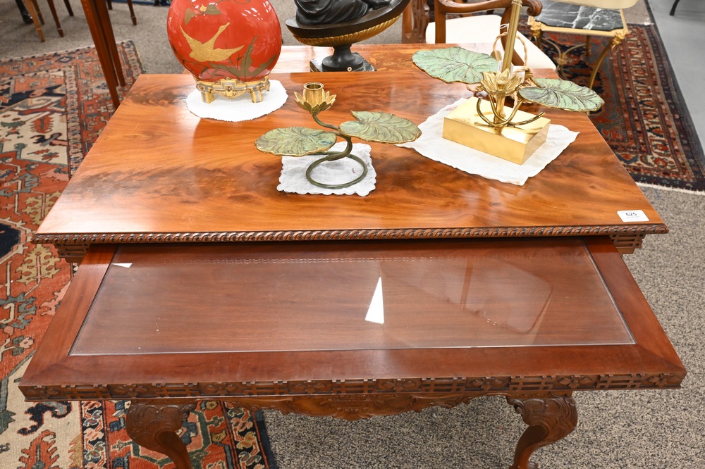 Lot 625: Margolis Custom Mahogany Chippendale Style Lowboy, having carved edge over pull out slide with inset glass and blind carved front ov…