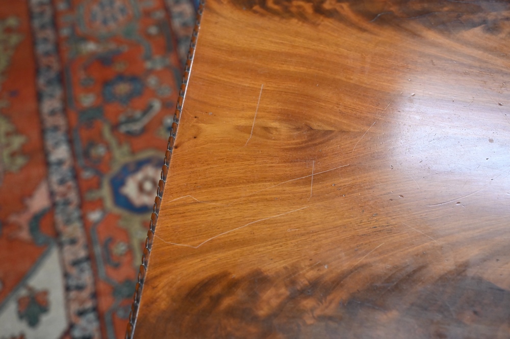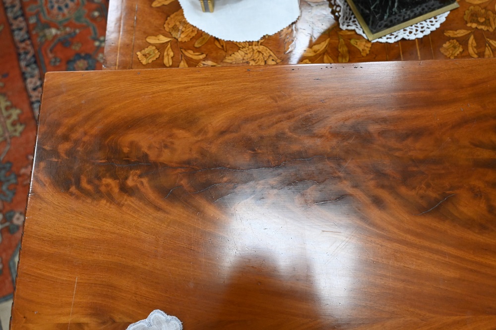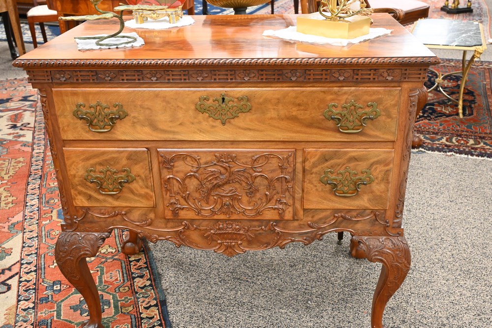 Margolis Custom Mahogany Chippendale Style Lowboy, having carved edge over pull out slide with inset glass and blind carved front over one long drawer over three short drawers, center with bird, vine and pillar carving over carved basket of flower skirt, flanked by vine carved columns, all set on carved cabriole legs ending in ball and claw feet, signed Margolis 1930, top and front comprised of Cuban mahogany, the best Margolis lowboy in existence, height 33 1/2 inches, top 21 1/2″ x 35 1/2″. Provenance: Keller Family Collection. Custom Margolis specialty pieces made for Samuel and Sophie Gross which were then passed to Florence Keller, then to Dan and Gerald Keller.