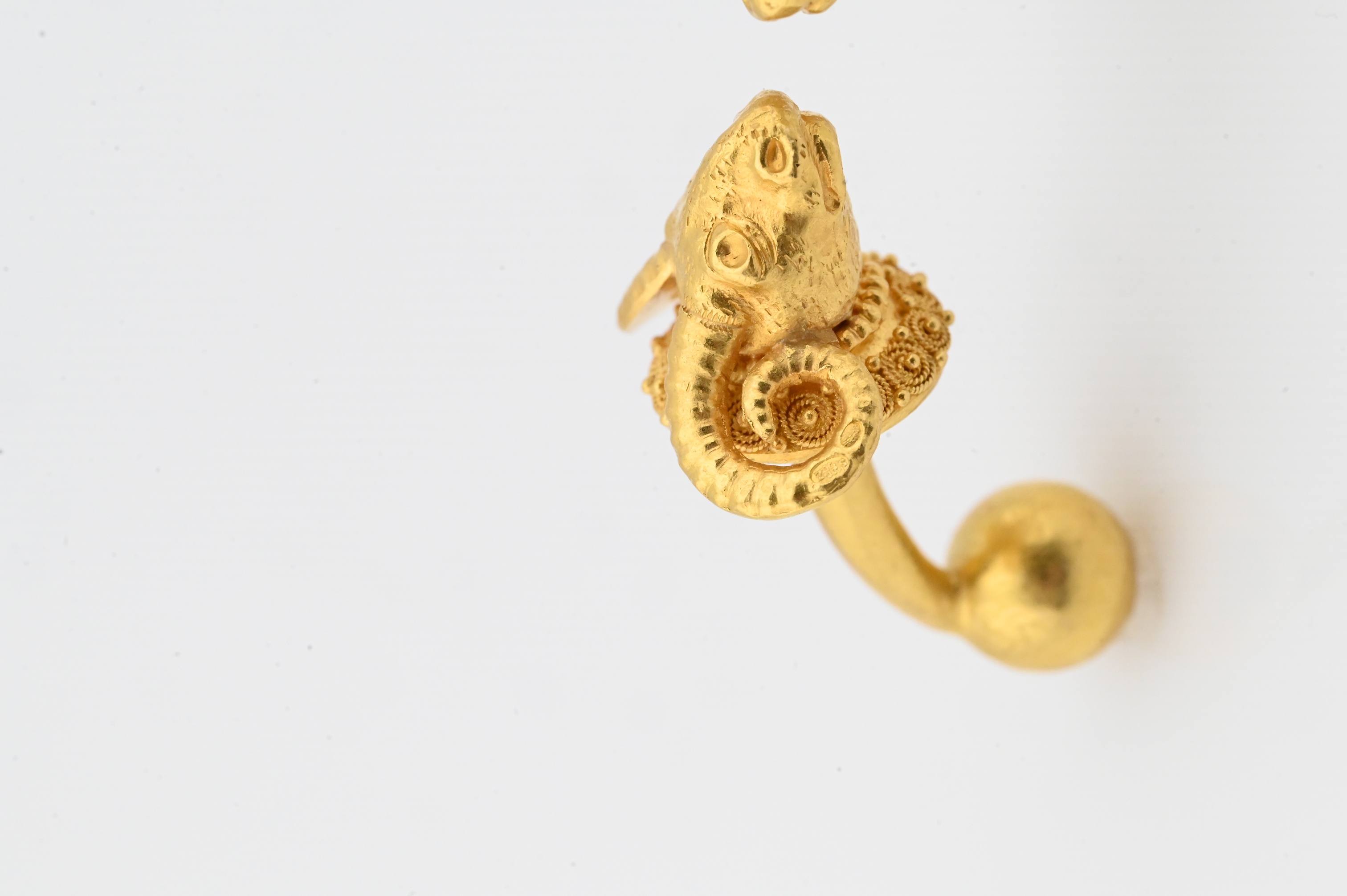each modeled in high relief with finely detailed curling horns and textured surfaces, marked 750 and 22K and maker’s stamp Z