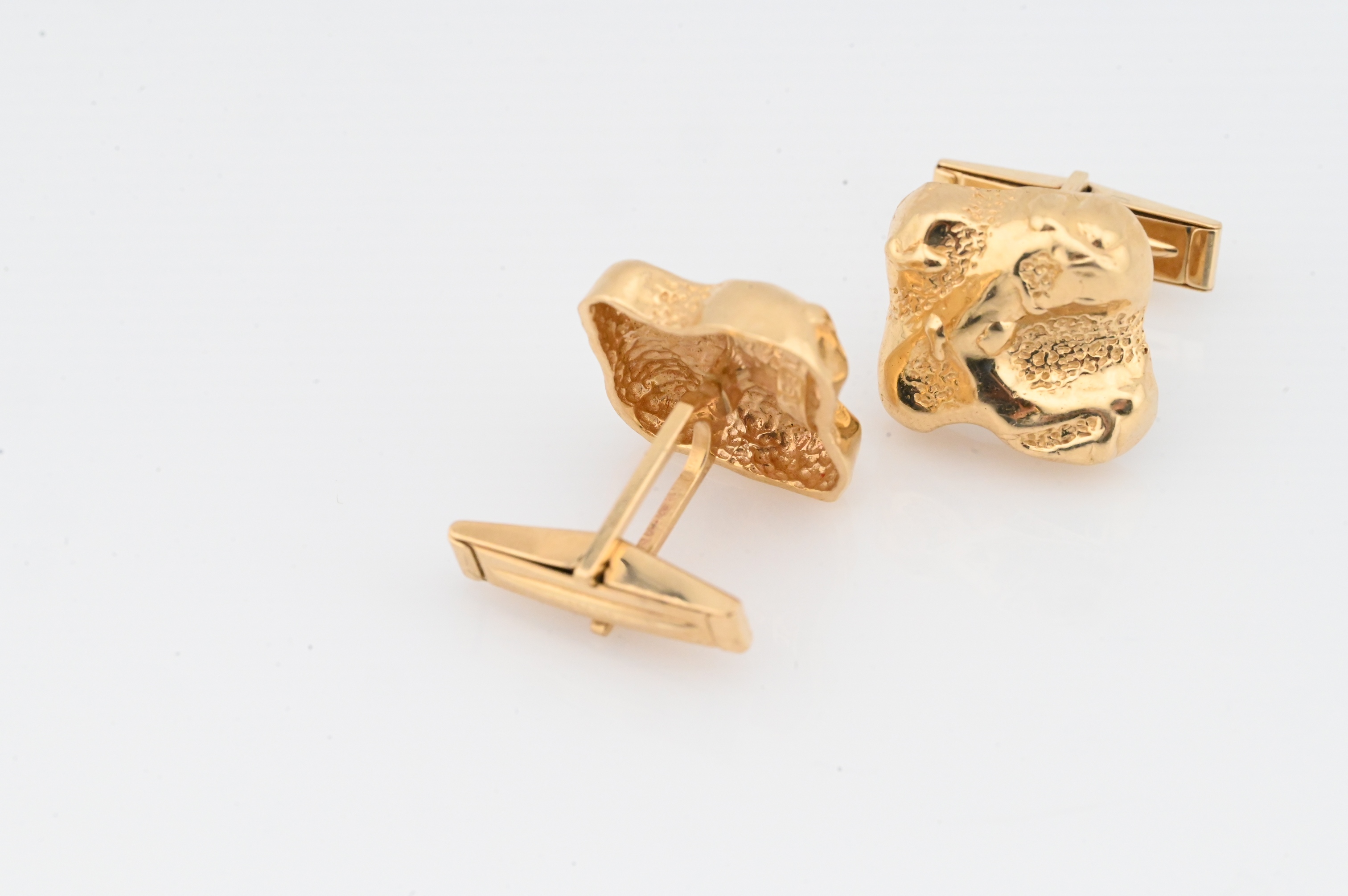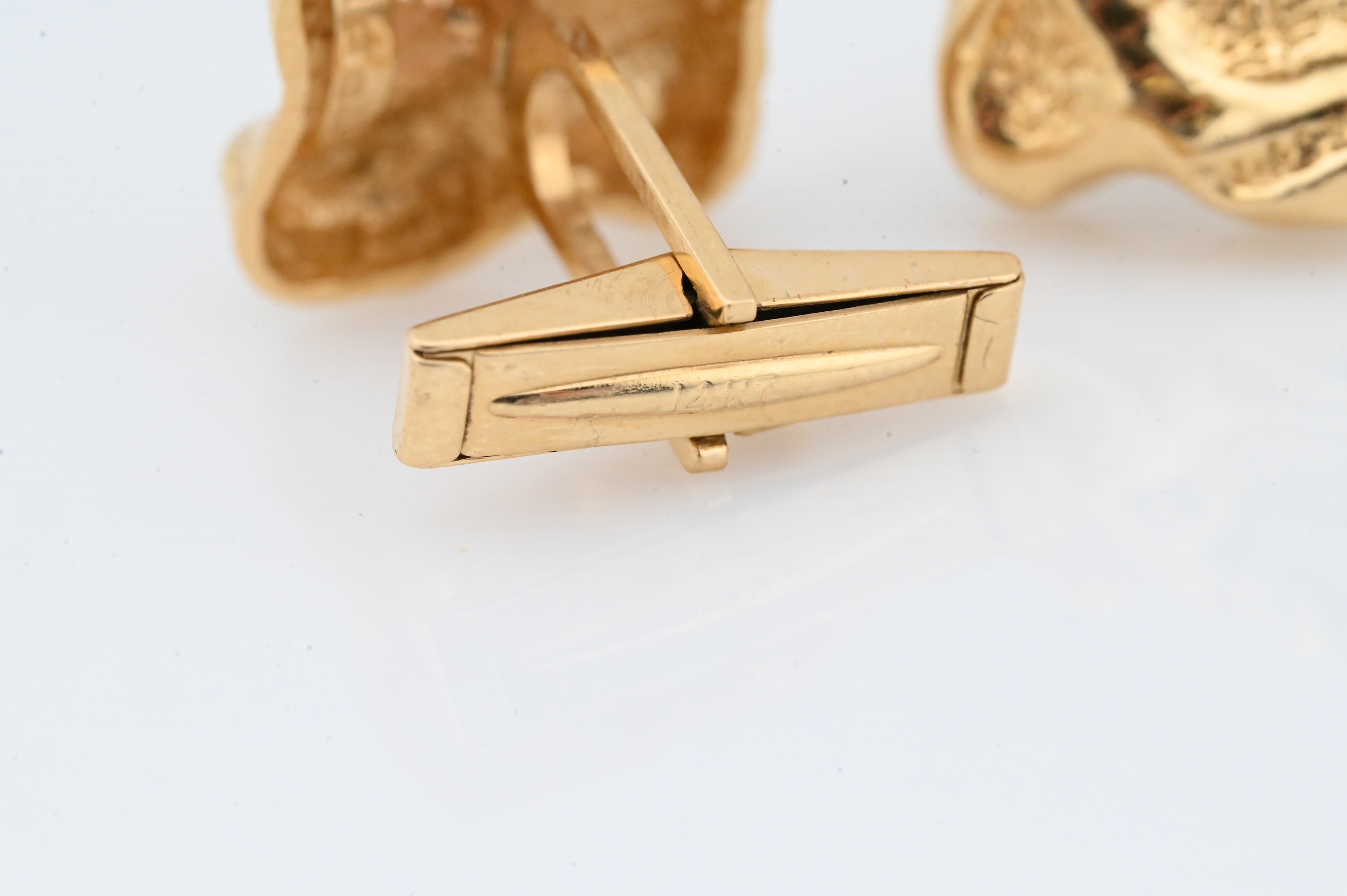 A pair of heavily textured nugget-form cufflinks, each stamped “14K JM 1981” to the reverse.
