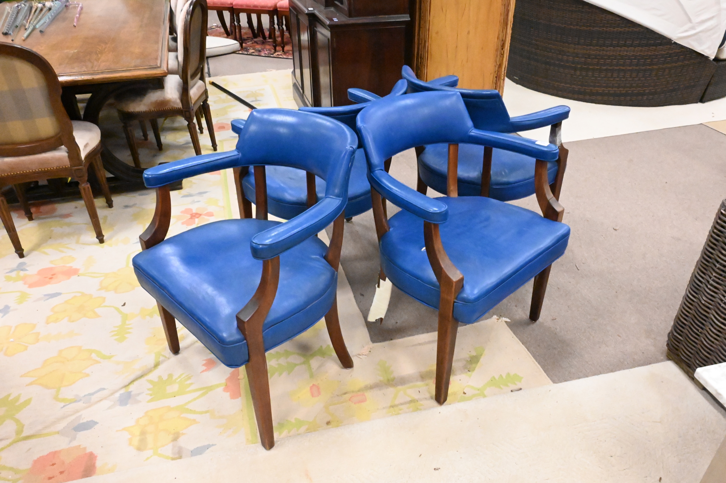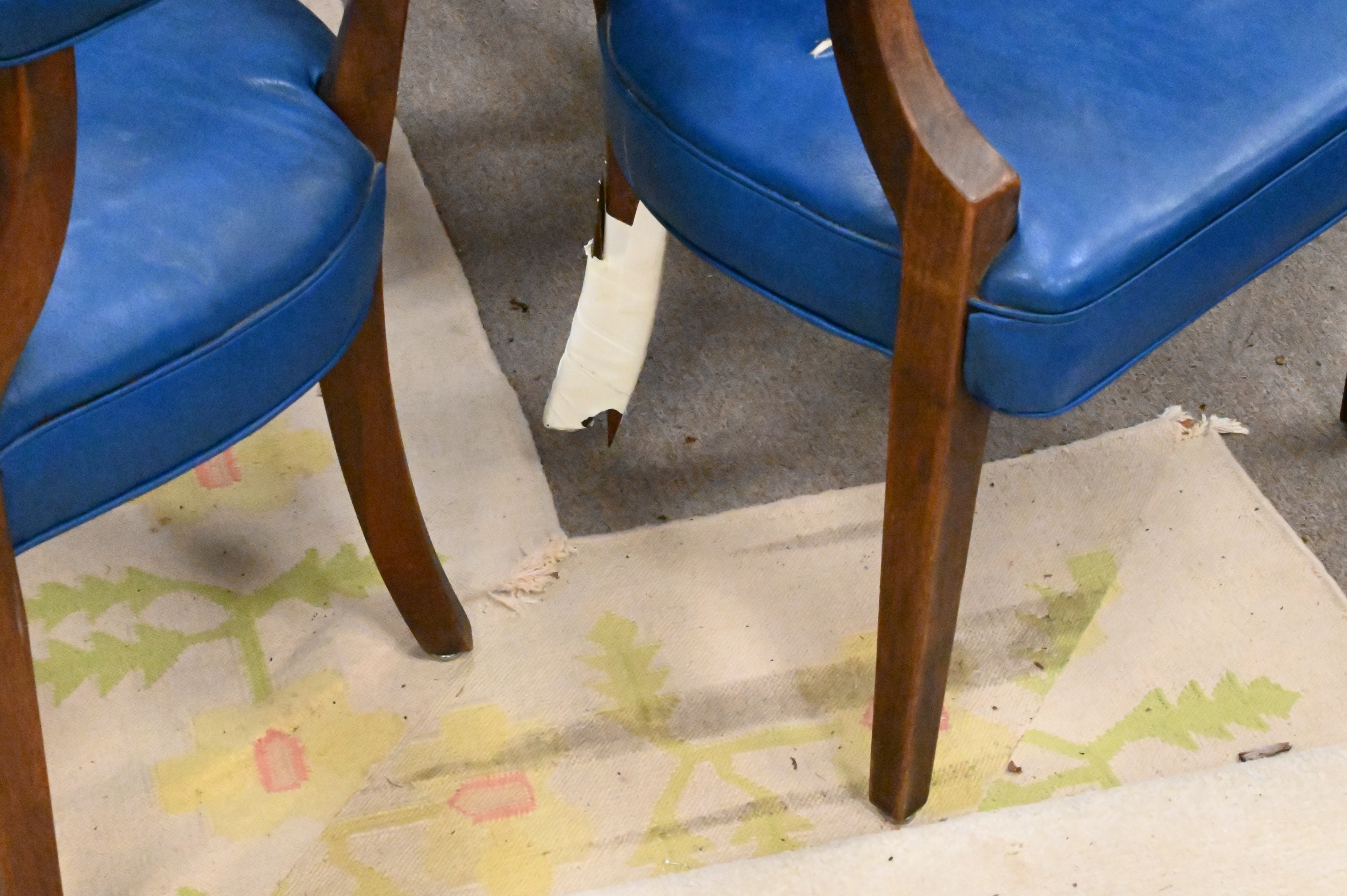 Set of Seven Mid. Century Arm Chairs, two colors, one with tear in top, one arm as is, one with broken leg, height 31 inches, width 24 1/2 inches, Provenance: Julius H Jacobson II a Fifth Avenue Estate.