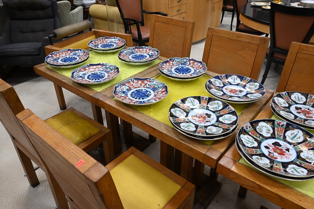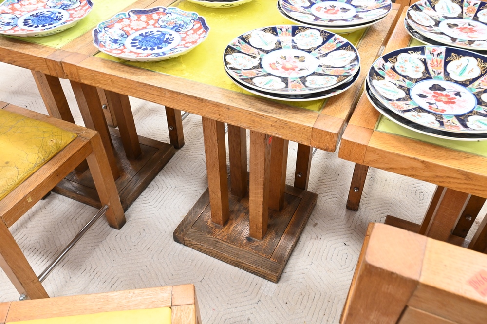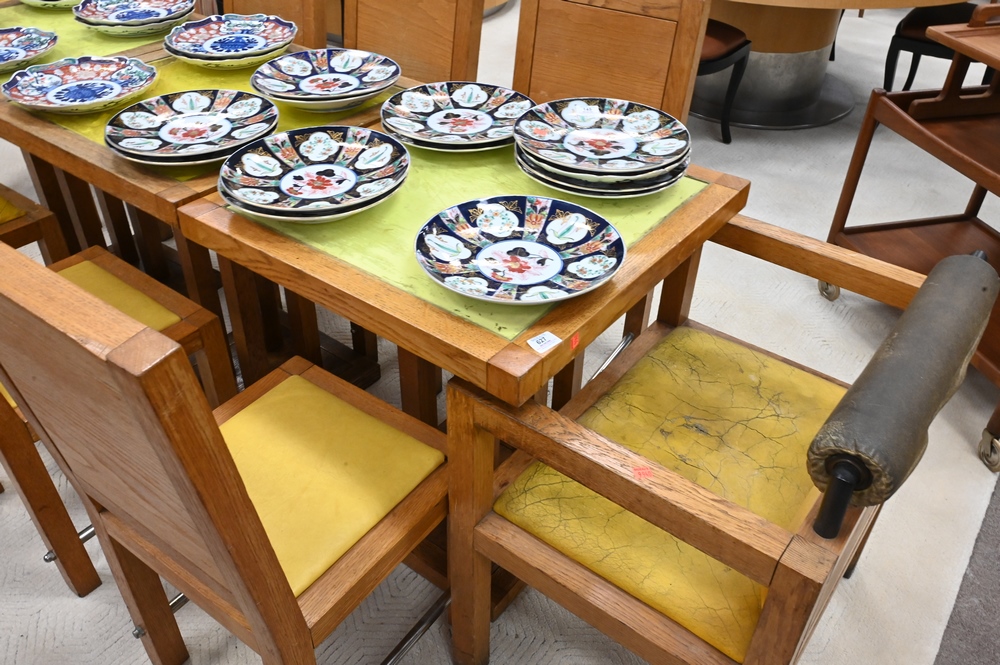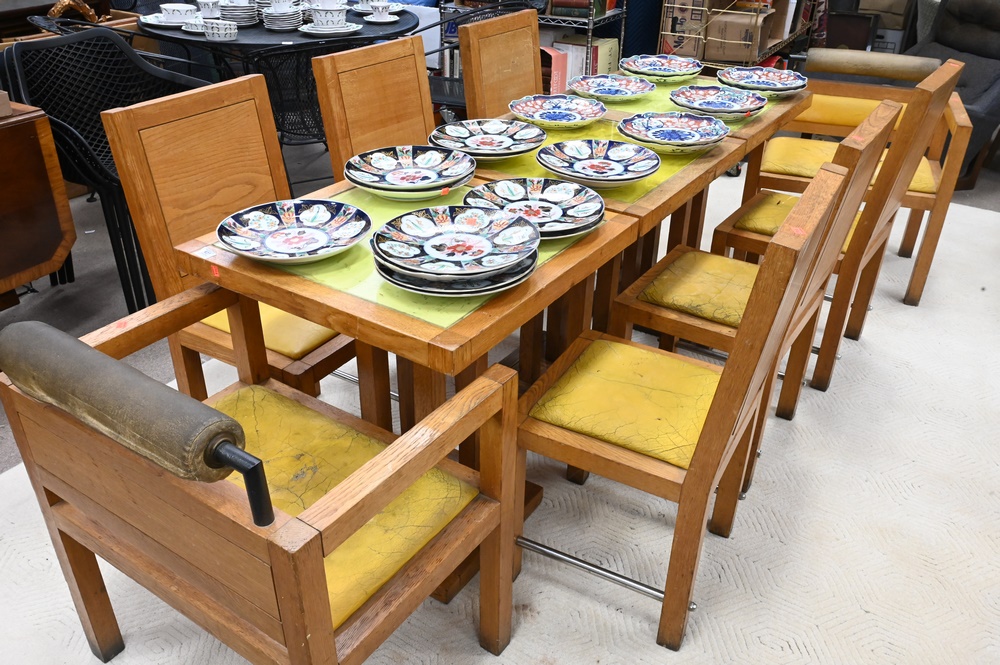 Lot 627: Eleven Piece Jacqueline Morabito Lot, to include three tables with glass inserts, six side chairs, two armchairs, architect Yves Bayard, height 29 inches, top 25 1/2″ x 25 1/2″.