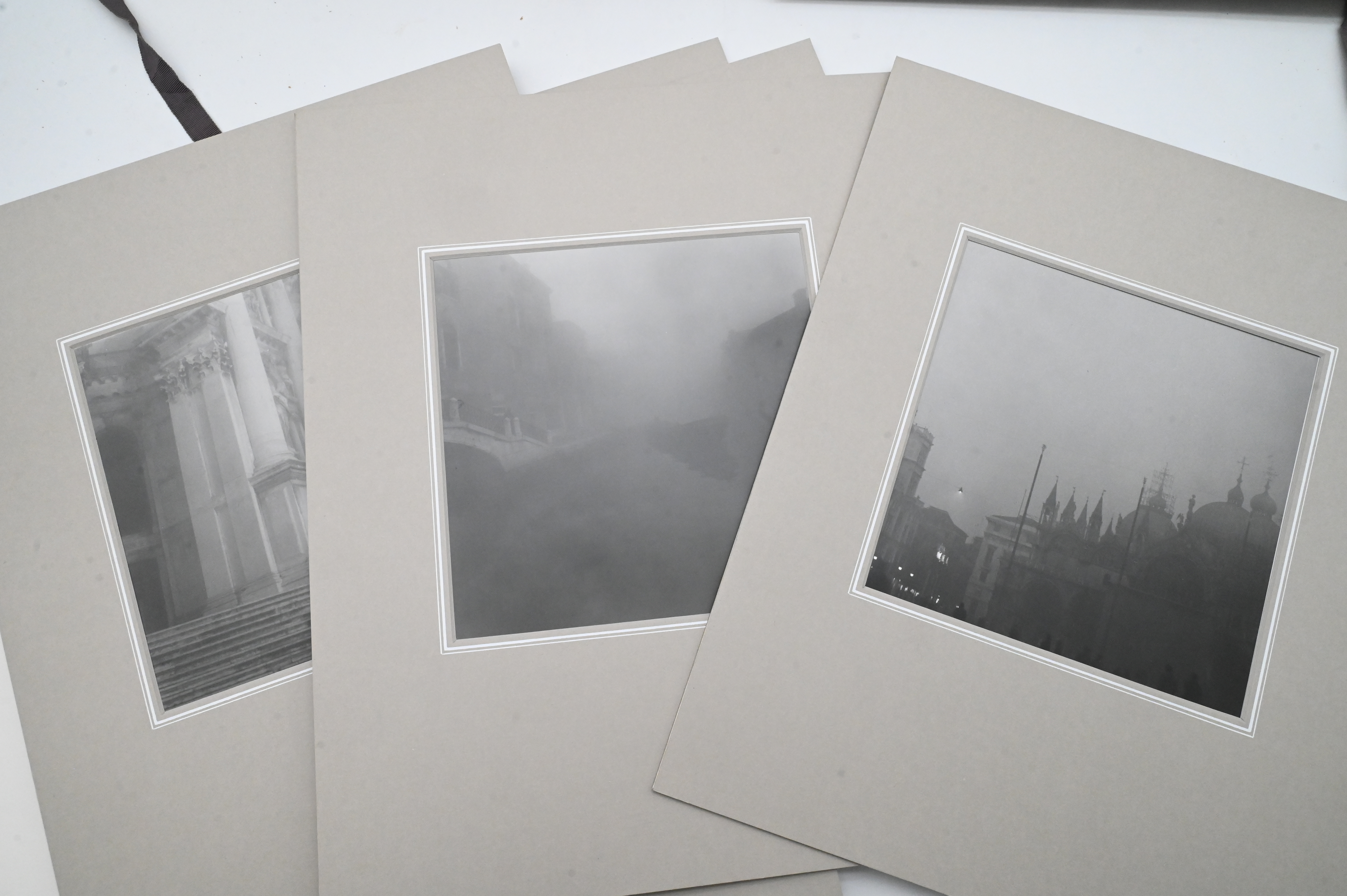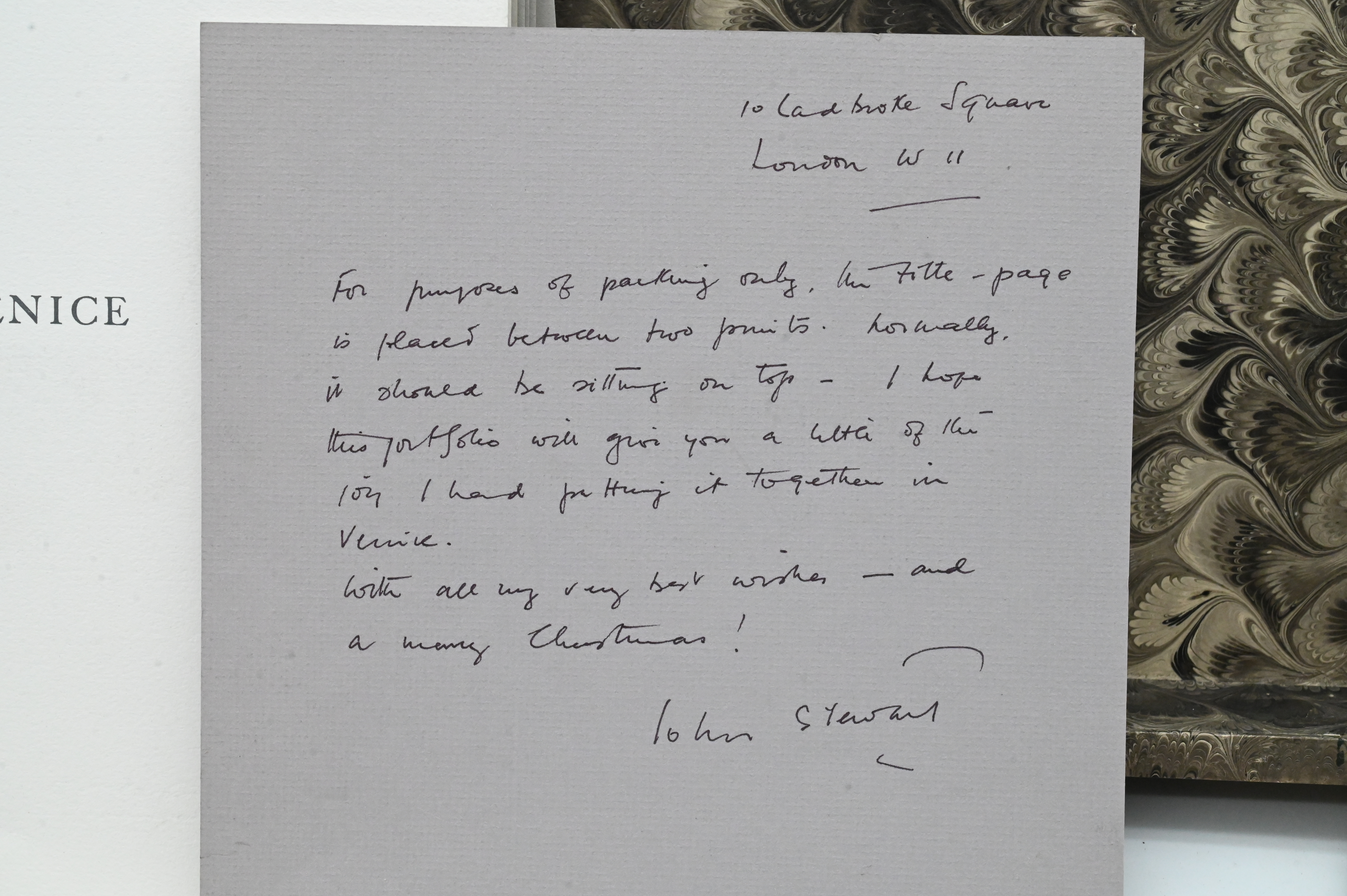 1983, limited edition photographic portfolio comprising ten black-and-white views of Venice, photographed during the first week of March 1983 using Hasselblad cameras and Ilford film. Printed on Argenta Superbro m paper. This portfolio is set number 7, from an edition of fifty boxed sets produced in support of the UNESCO campaign for the Safeguard of Venice. Each photograph is signed, numbered, and dated by the artist. Accompanied by the original marbled paper portfolio and printed title page, together with an autograph letter signed by John Stewart discussing the presentation and assembly of the set. Published by Spark S.A., Geneva.