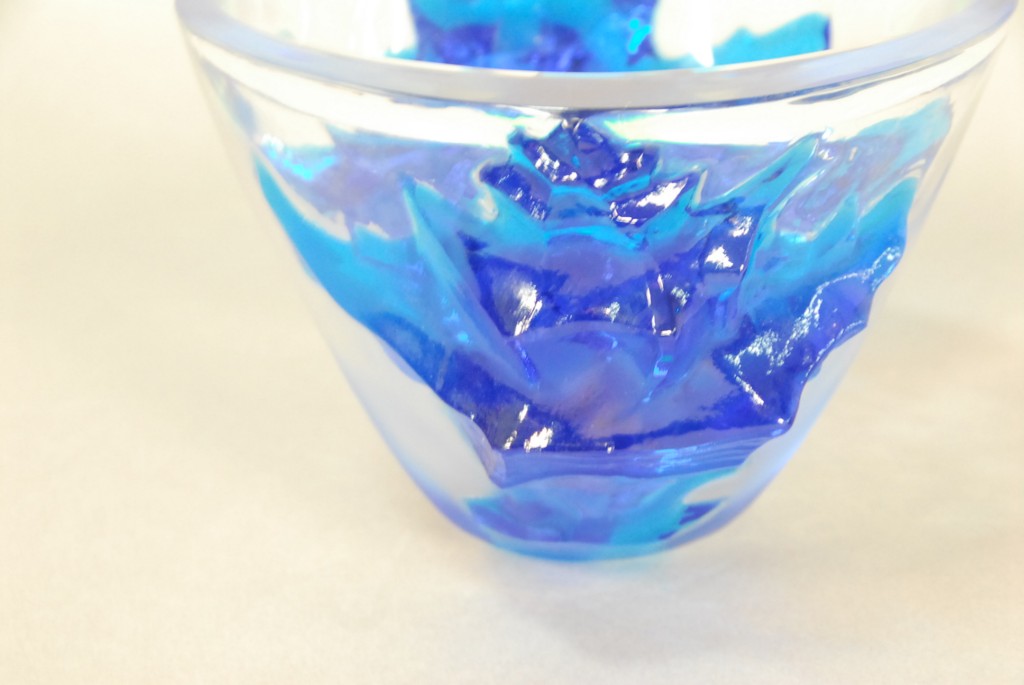 Large Lalique clear and blue glass bowl, deep bowl of clear glass tapering to frosted finish, blue end decorations, marked R. Lalique in block letters top is ground on one side. – ht. 6 1/2in. wd. 13 1/2in.
