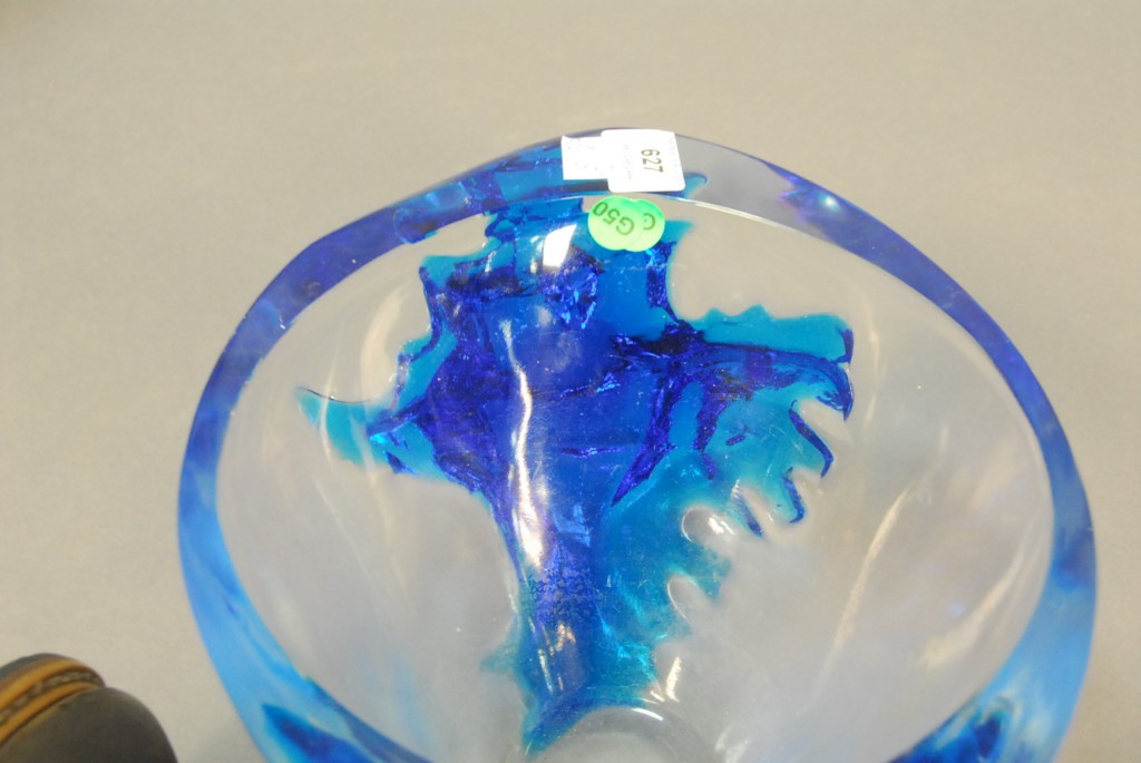 Lot 627: Large Lalique clear and blue glass bowl, deep bowl of clear glass tapering to frosted finish, blue end decorations, marked R