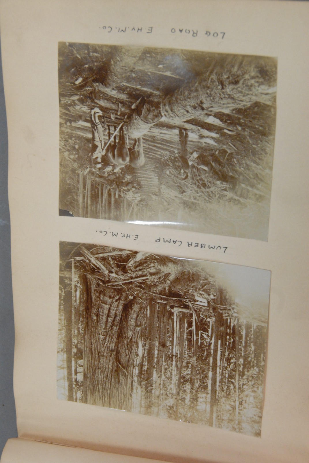 Late 19th century photo album Grant Reunion Windsor CT, log cabins Washington State Ruby Creek, lumbering Washington State, Joe Irving panning for gold Bonan Creek Klondike, Dawson.