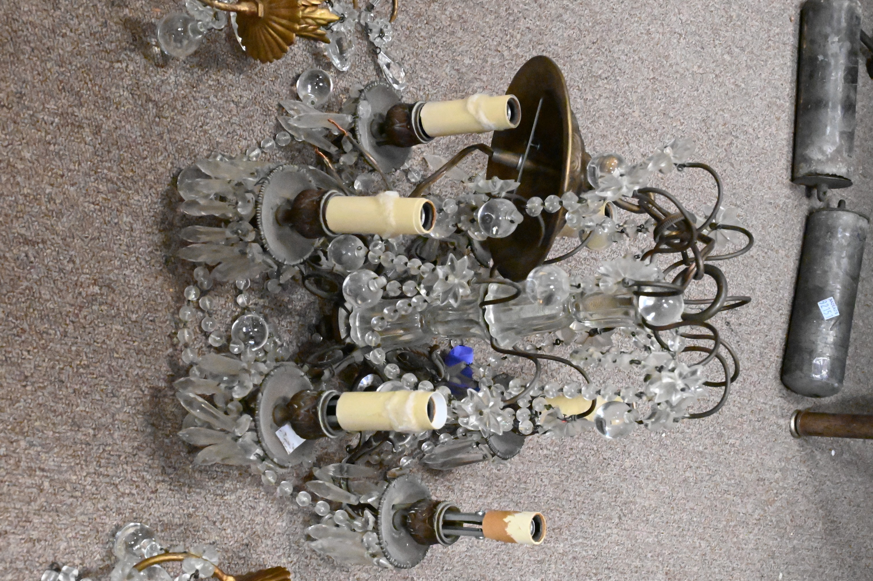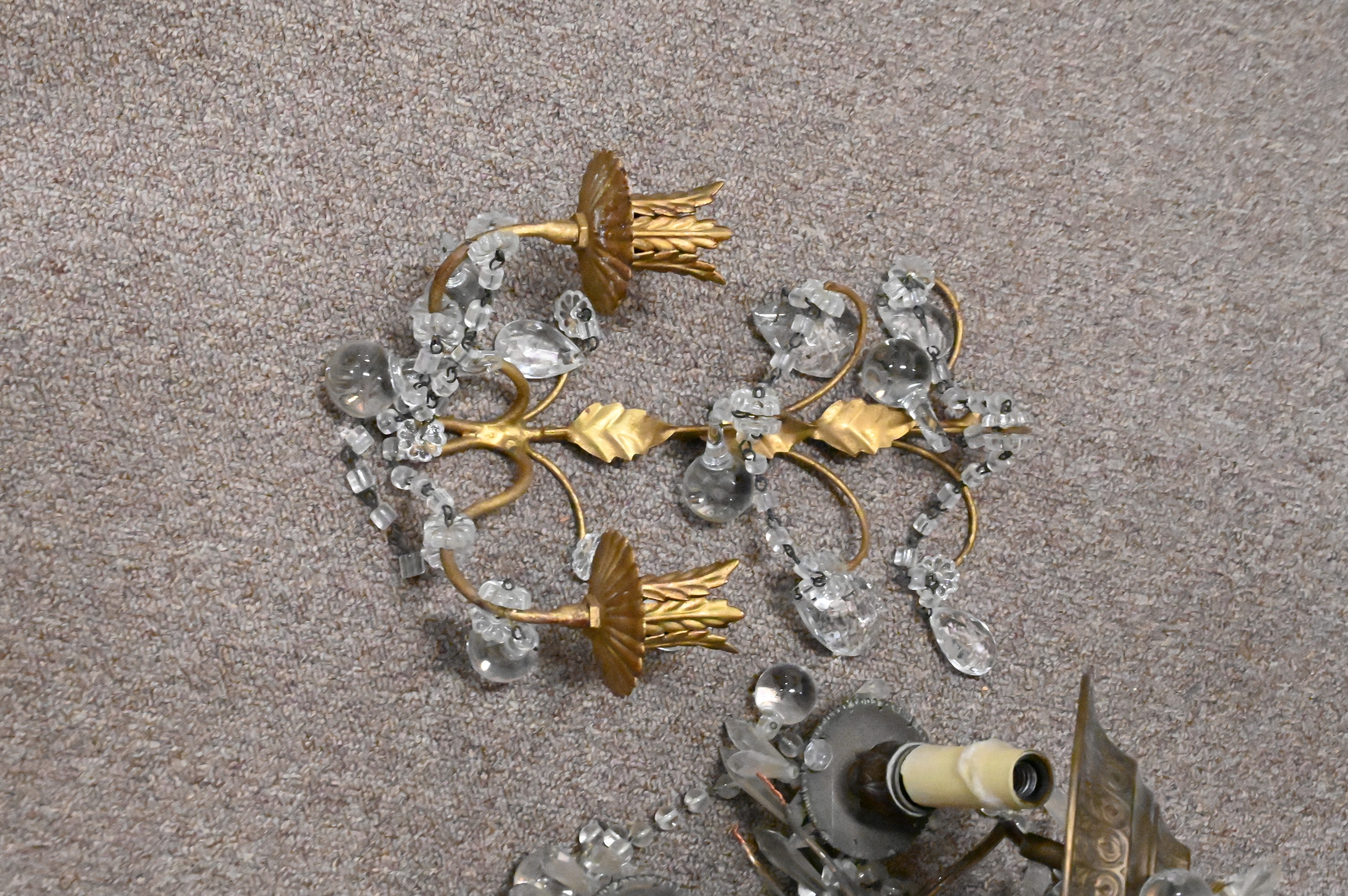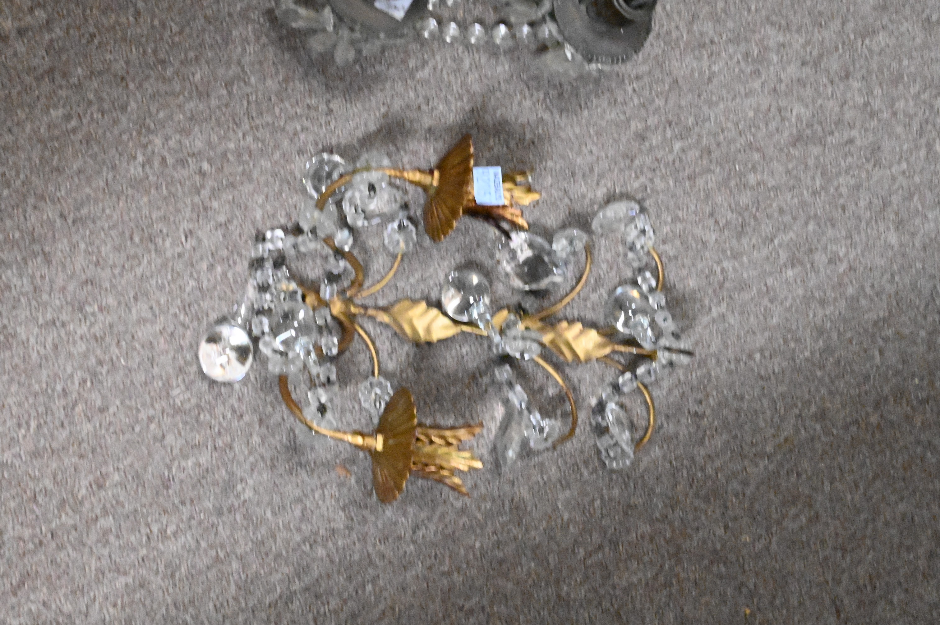 to include pair of two light crystal wall sconces with gilt metal base, along with a six light crystal chandelier with teardrops, stars and swag accents