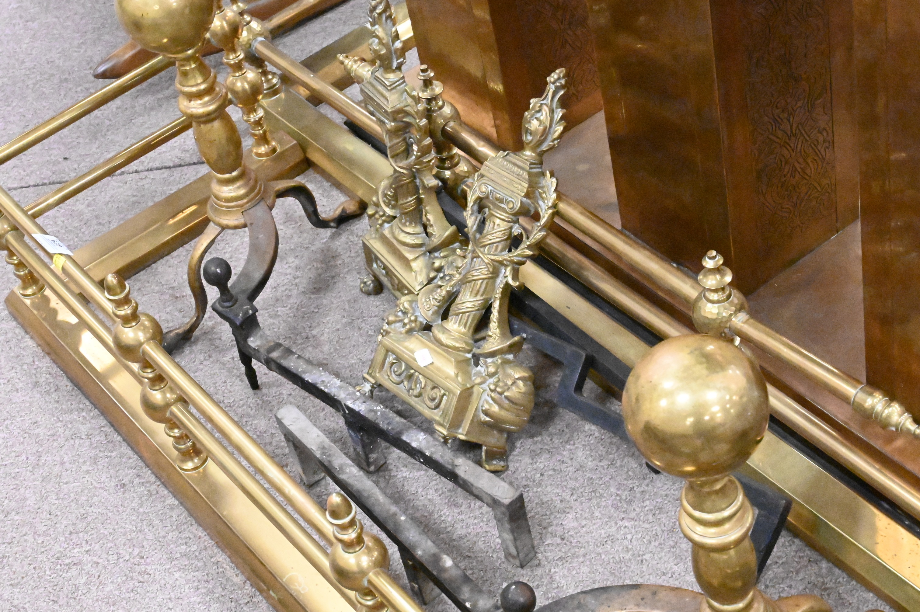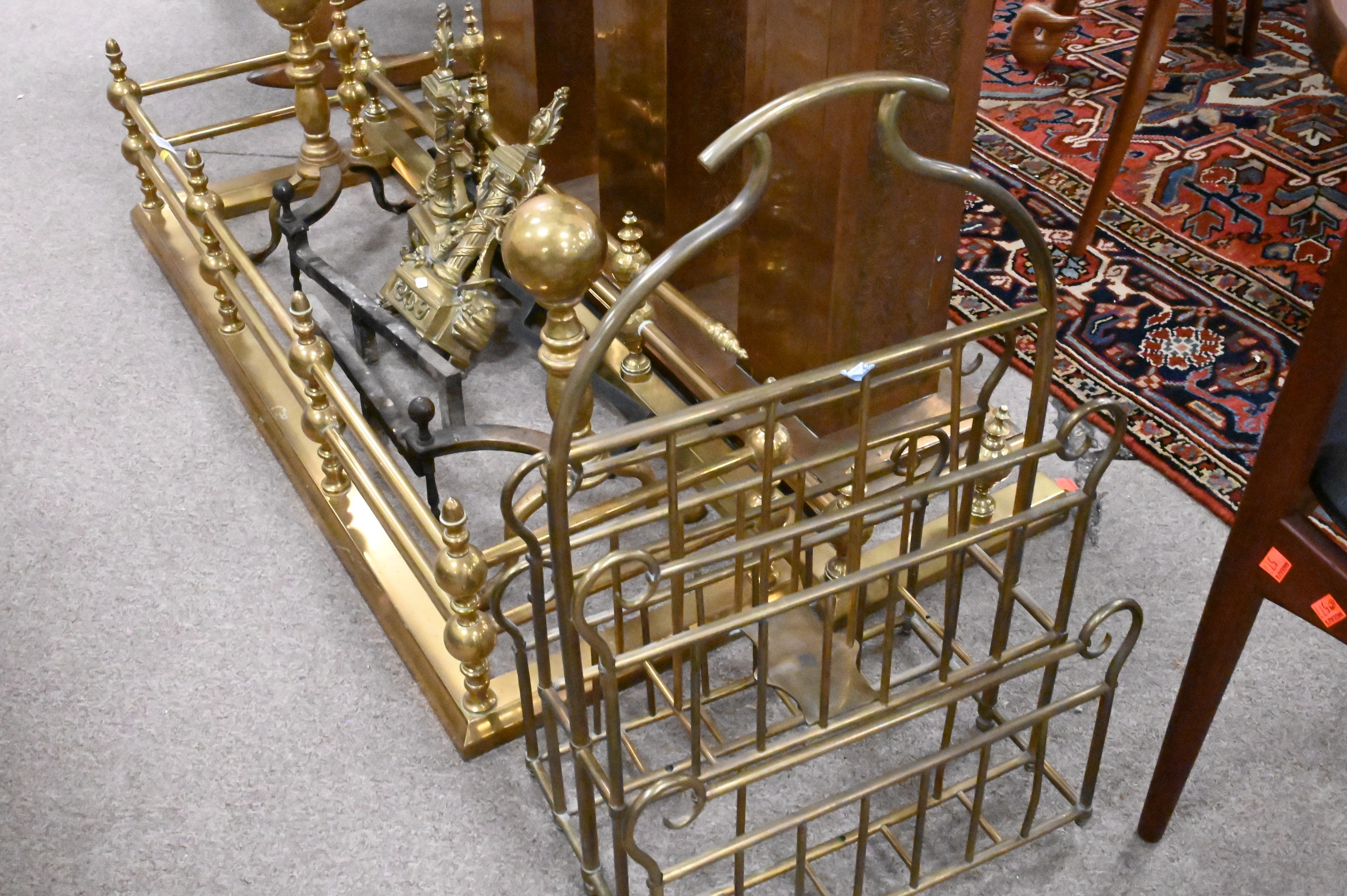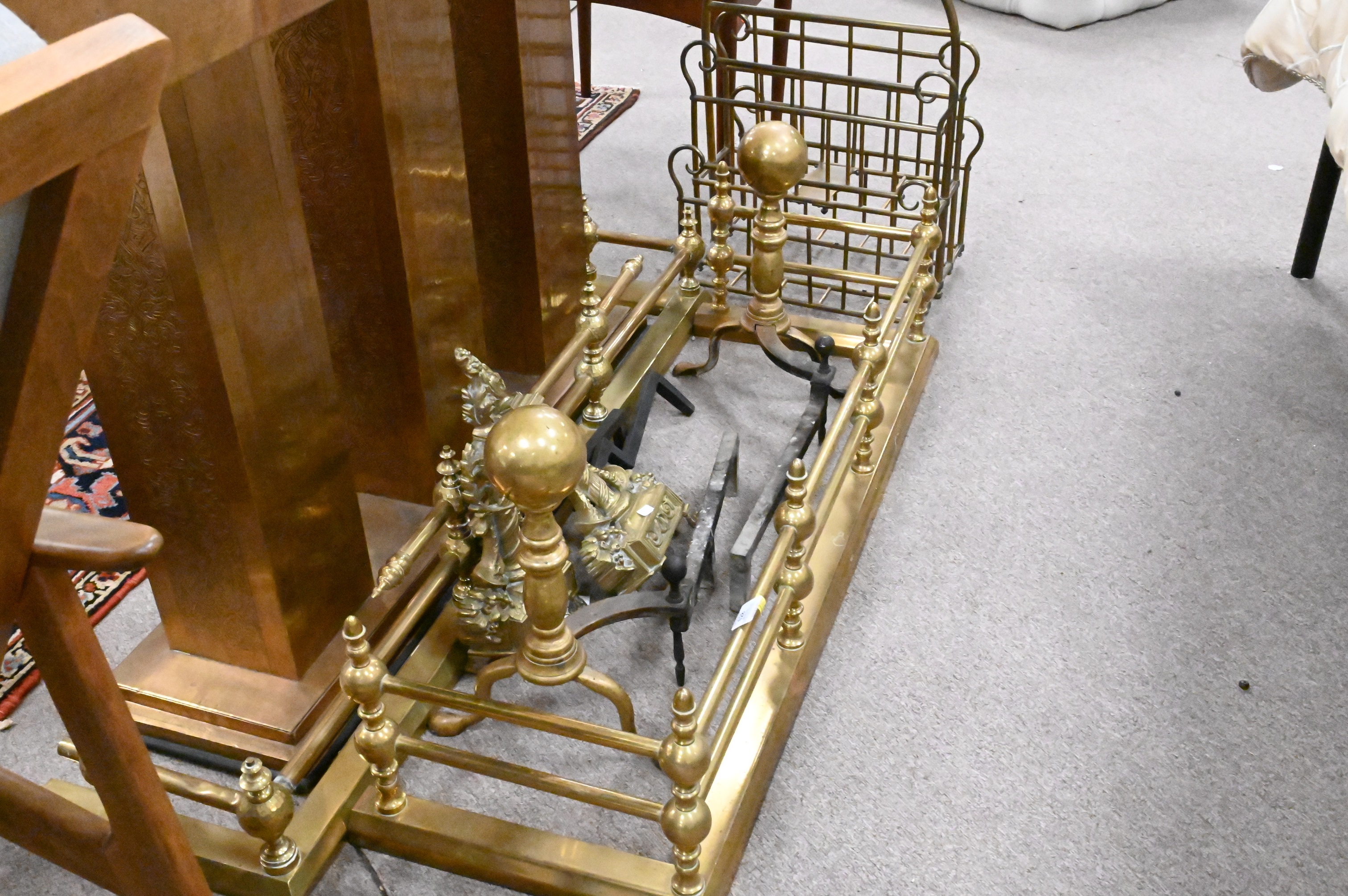 to include a pair of Federal andirons, two firefenders, a magazine rack, two brass fire extinguishers drilled for wiring, and a pair of neoclassical torchiere andirons