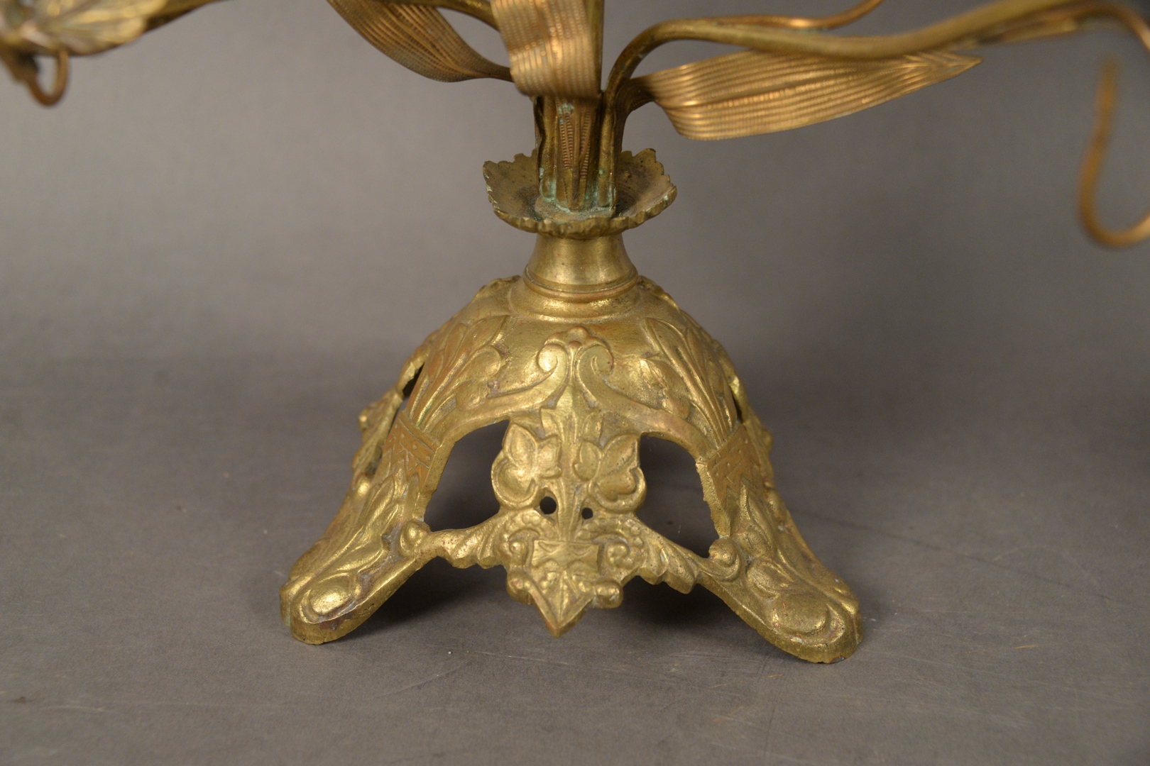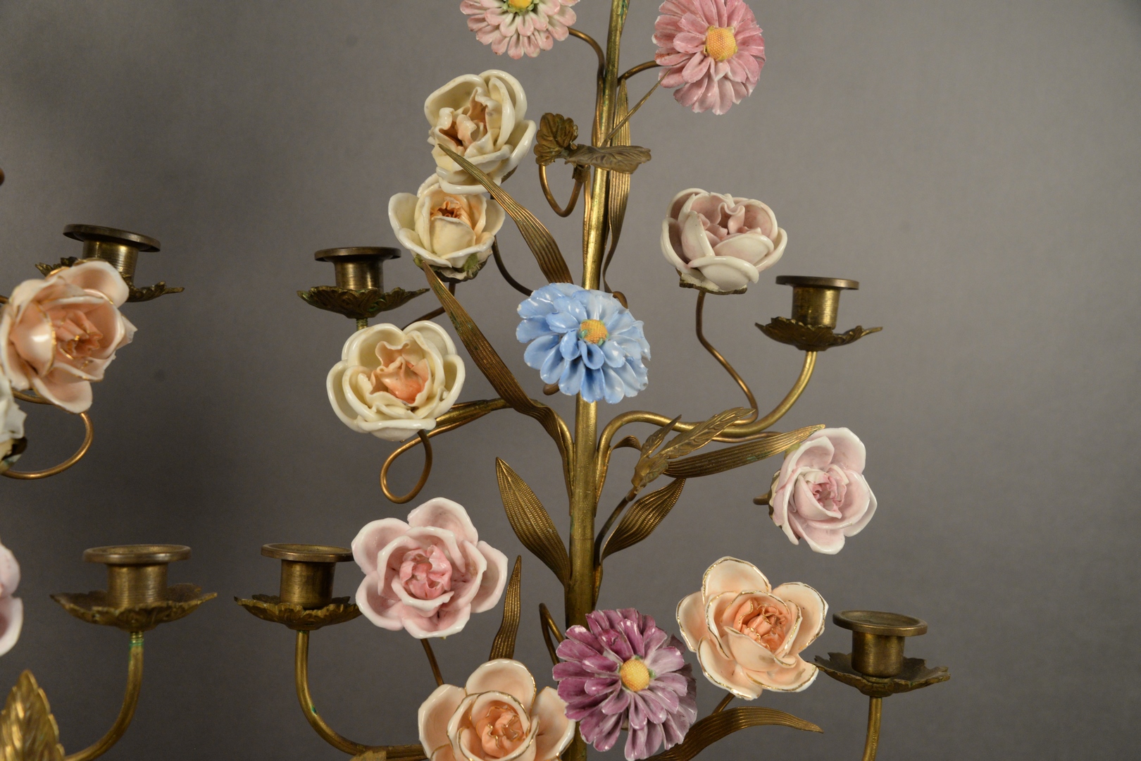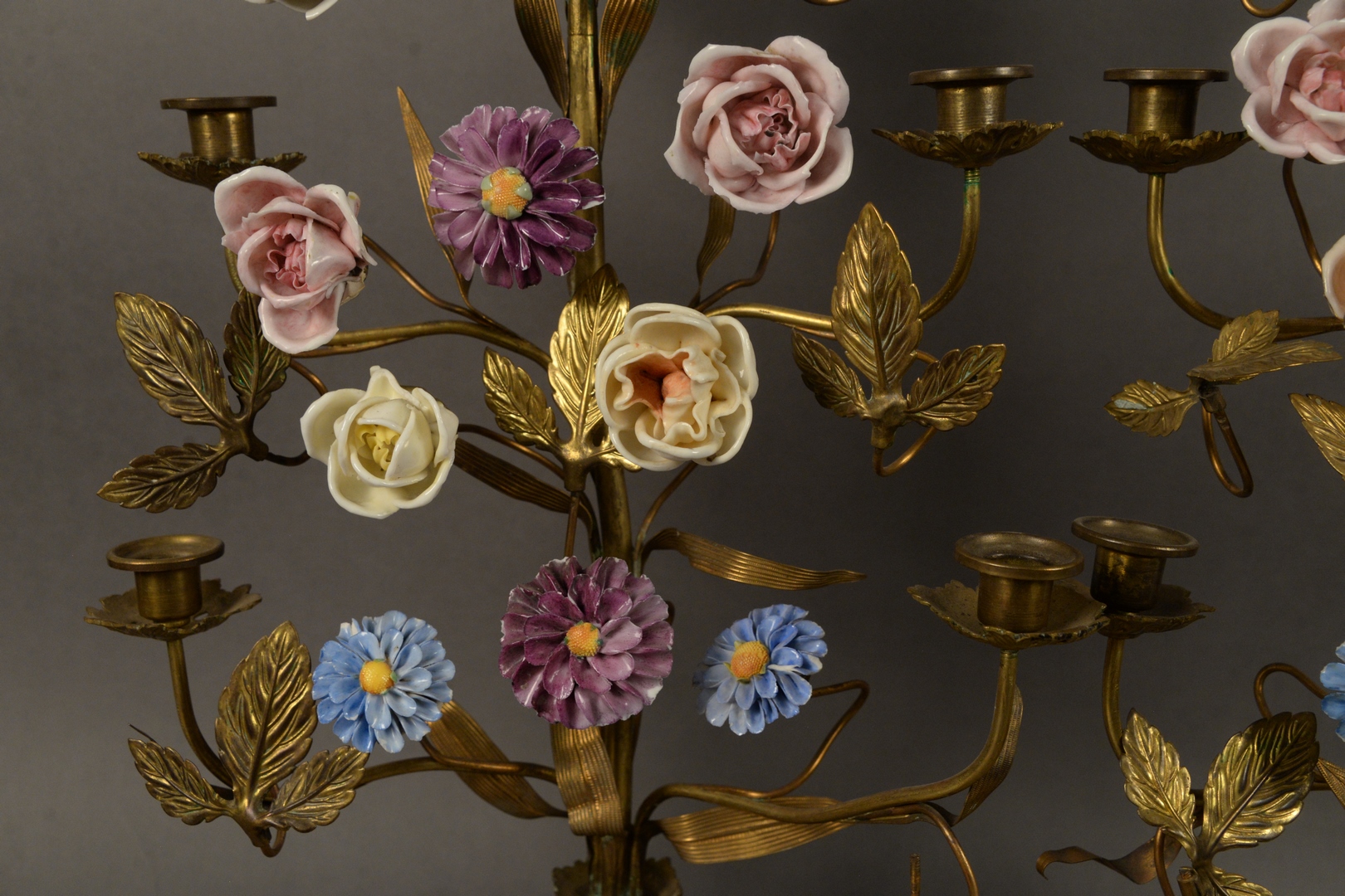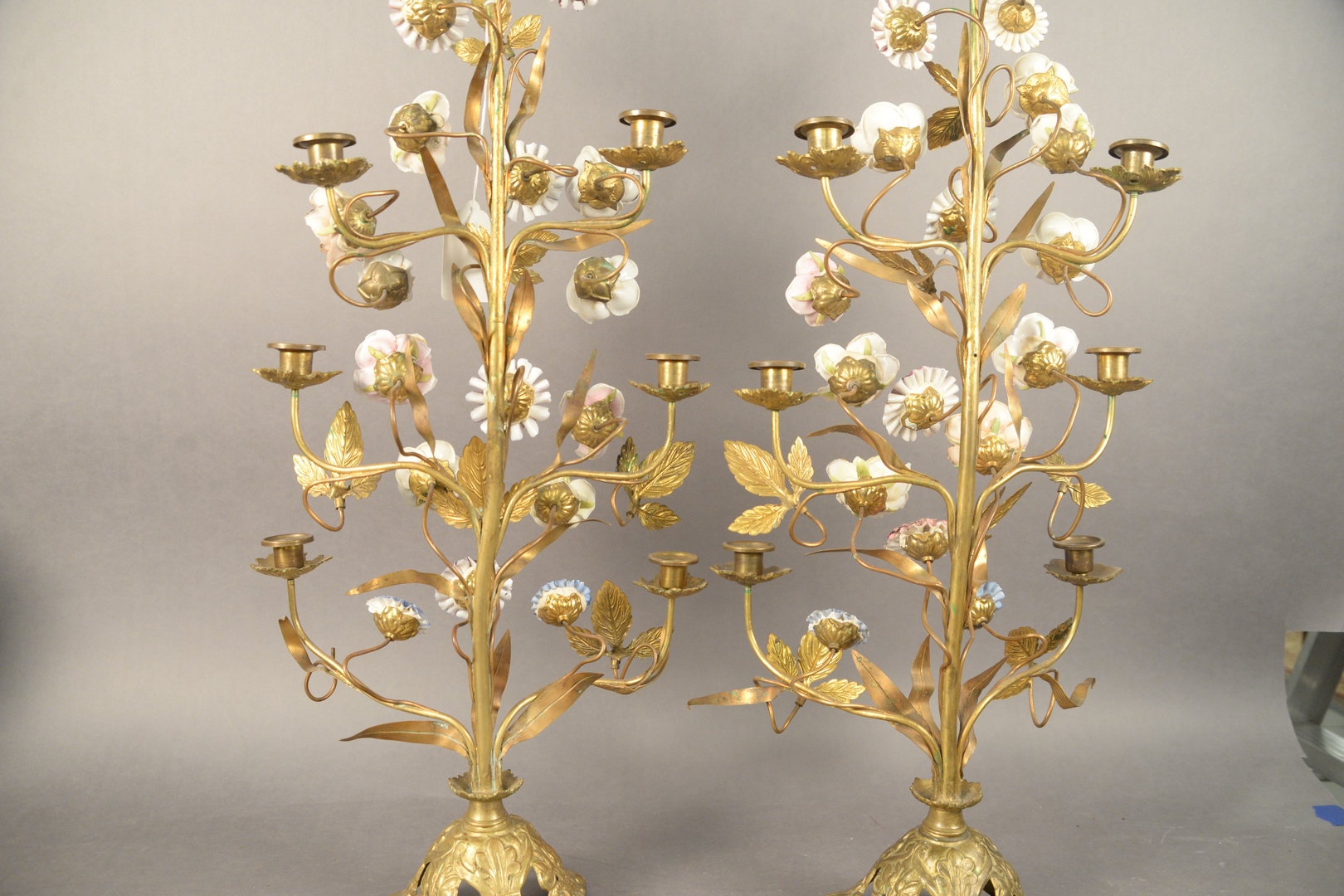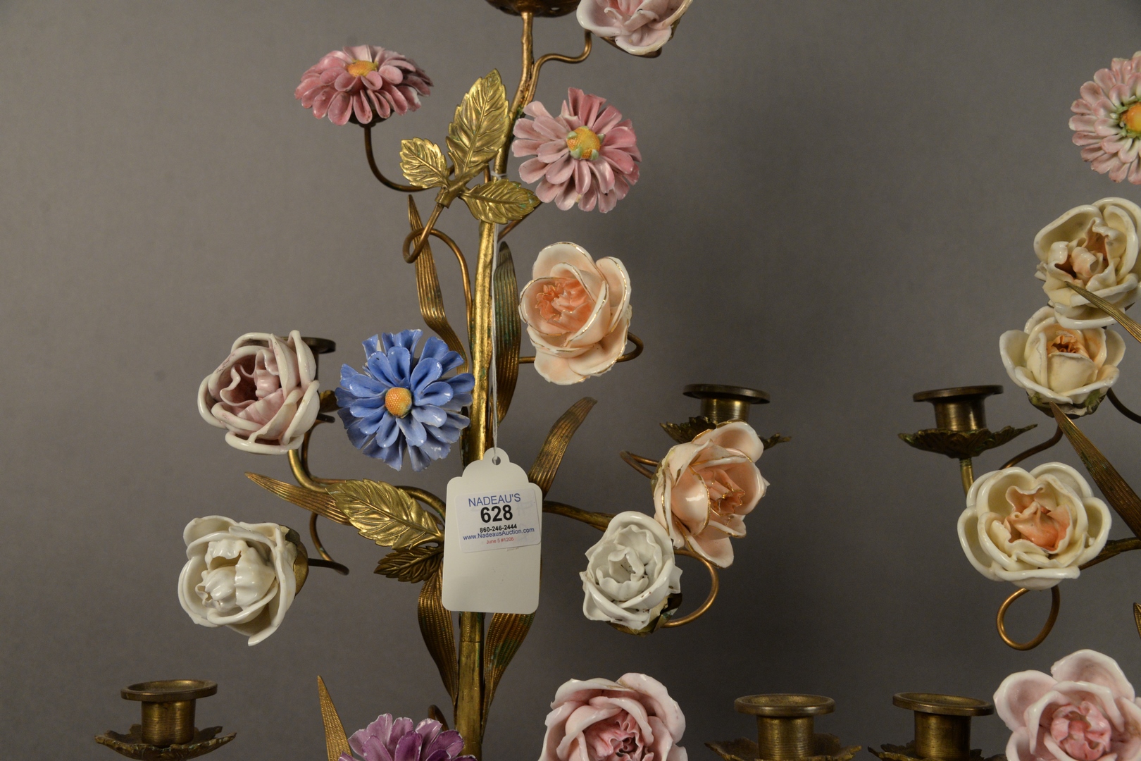 Lot 628: Pair of Brass Candelabras having painted porcelain flowers, each with seven candle holders, overall height 31 inches, width 13 1/2 i…