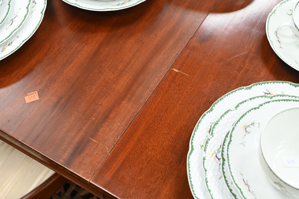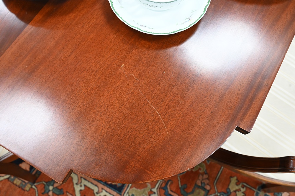 Lot 628: Pollock Custom Mahogany Federal Style Dining Table, having D-shaped ends, set on square tapered legs, bell flower inlays, signed Pol…