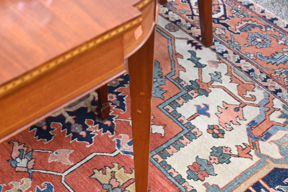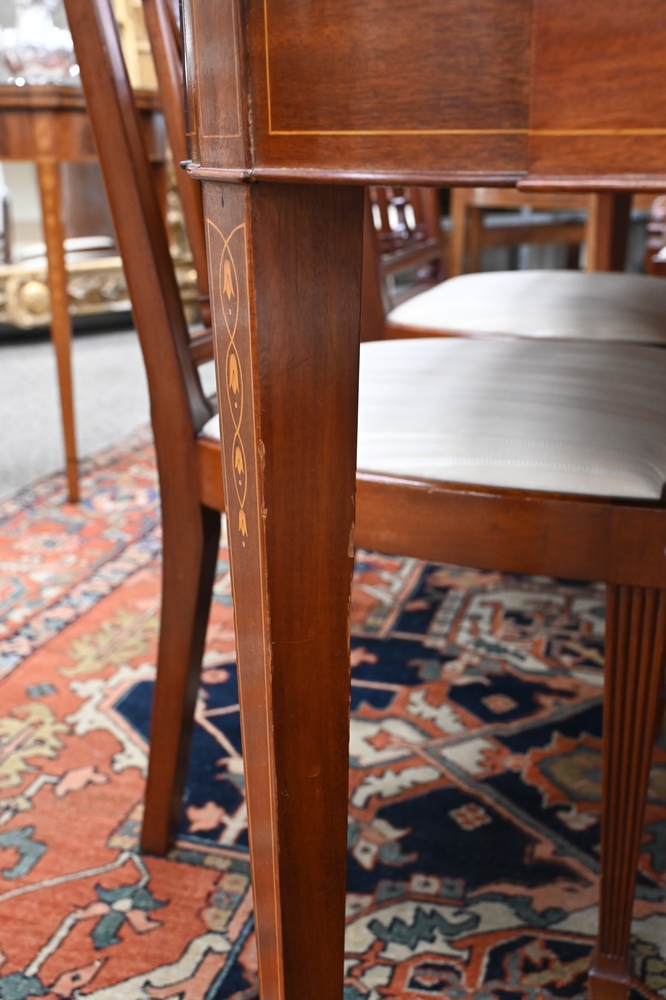 Pollock Custom Mahogany Federal Style Dining Table, having D-shaped ends, set on square tapered legs, bell flower inlays, signed Pollock Bros., height 30 inches, top 45 x 66 inches, custom pads and three 10 inch leaves, opens to 45″ x 96″.