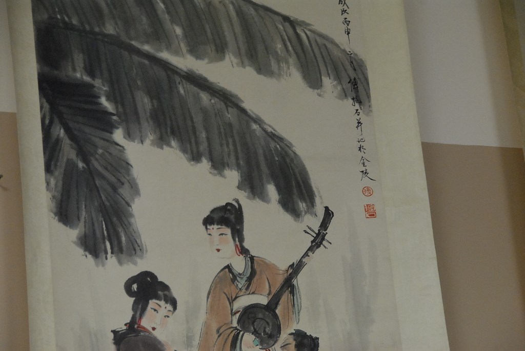 Two Oriental scrolls: watercolor on paper of two guanines. 49 x 22 watercolor on paper of calligraphy. 48 x 25