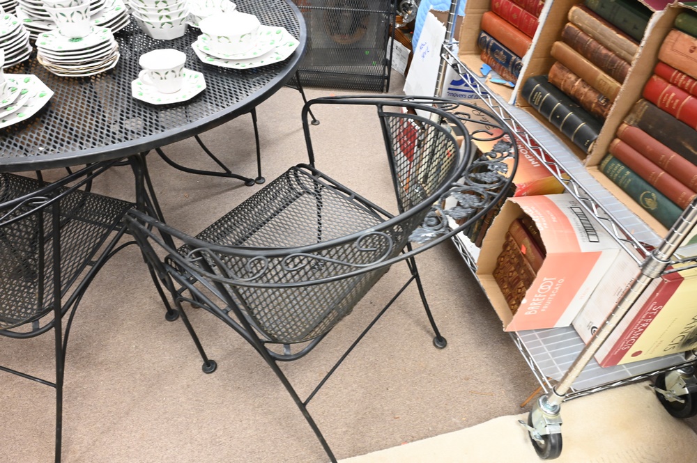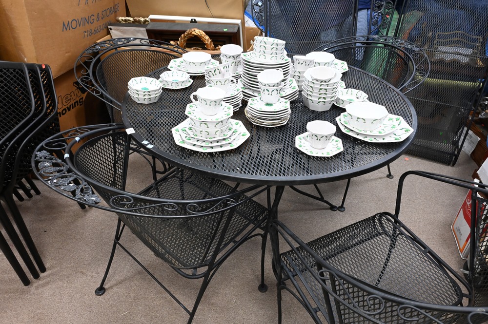 Lot 628: Wire Mesh Seven Piece Lot, to include two lounges, four arm chairs, and round table, height 28 1/2 inches, diameter 48 inches.