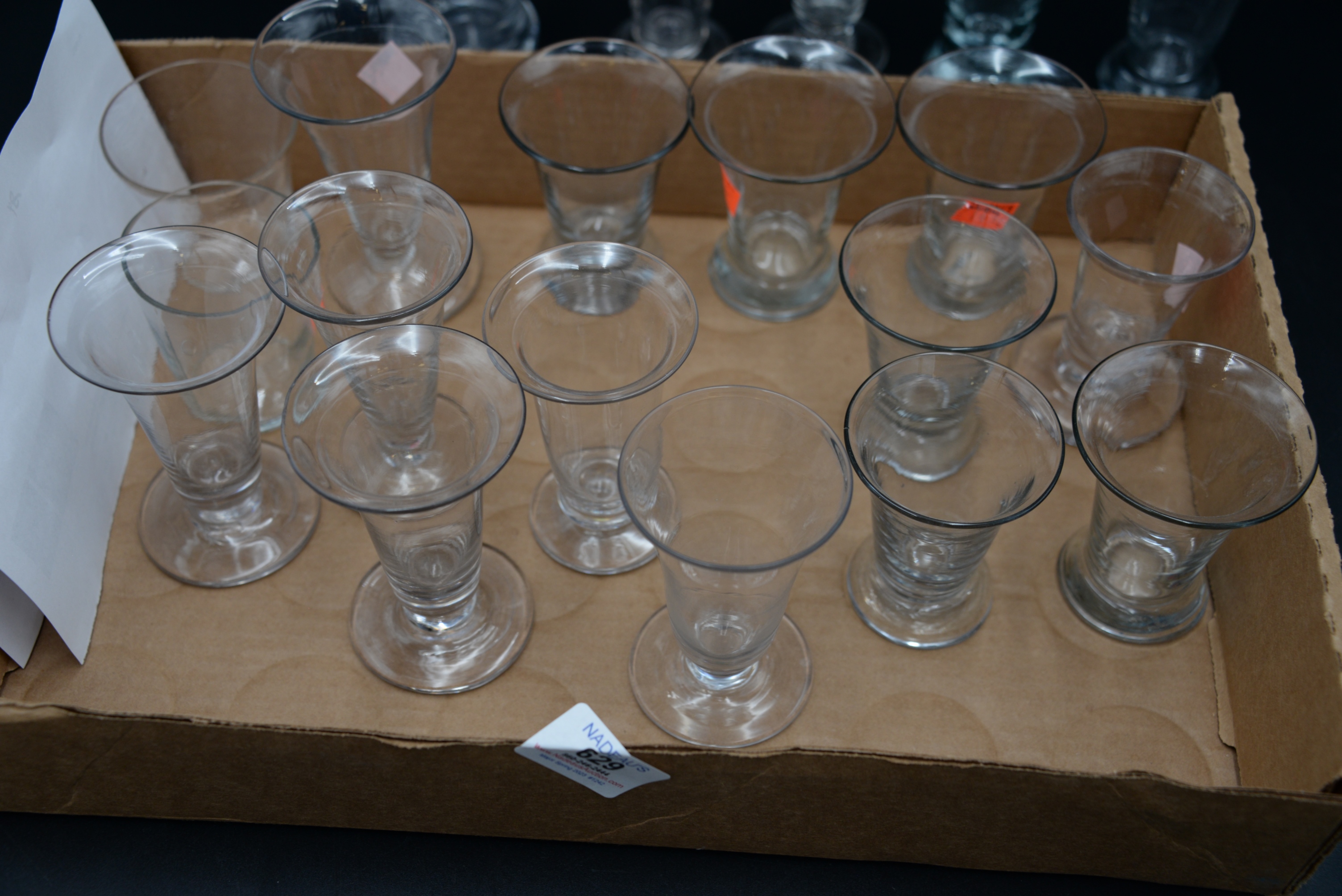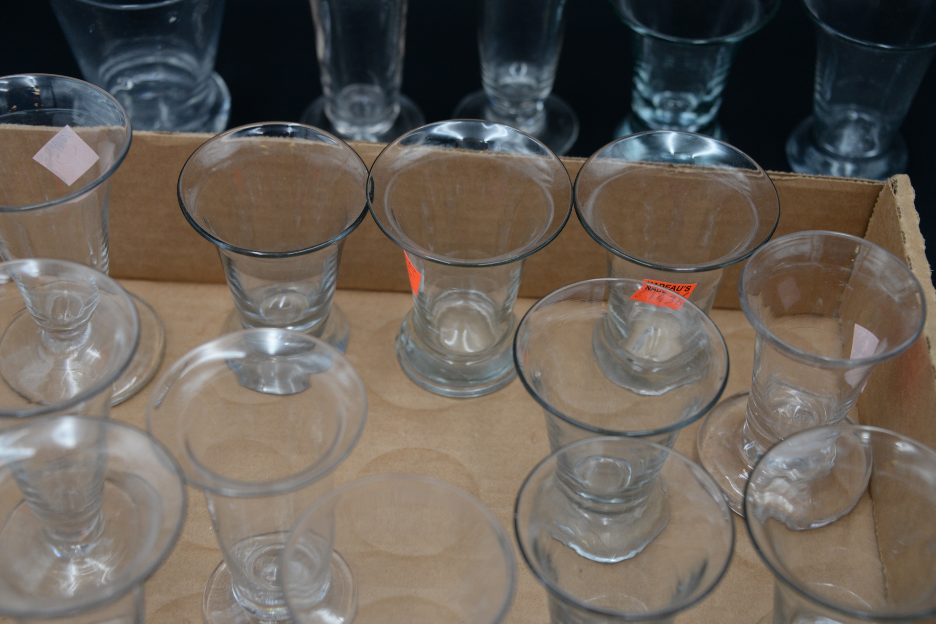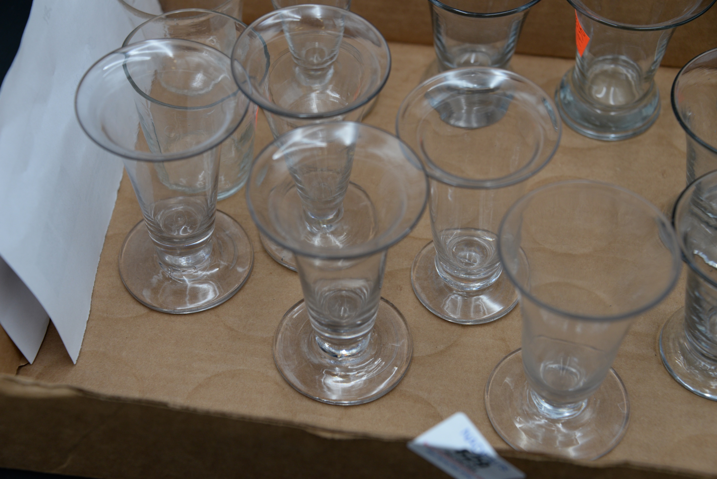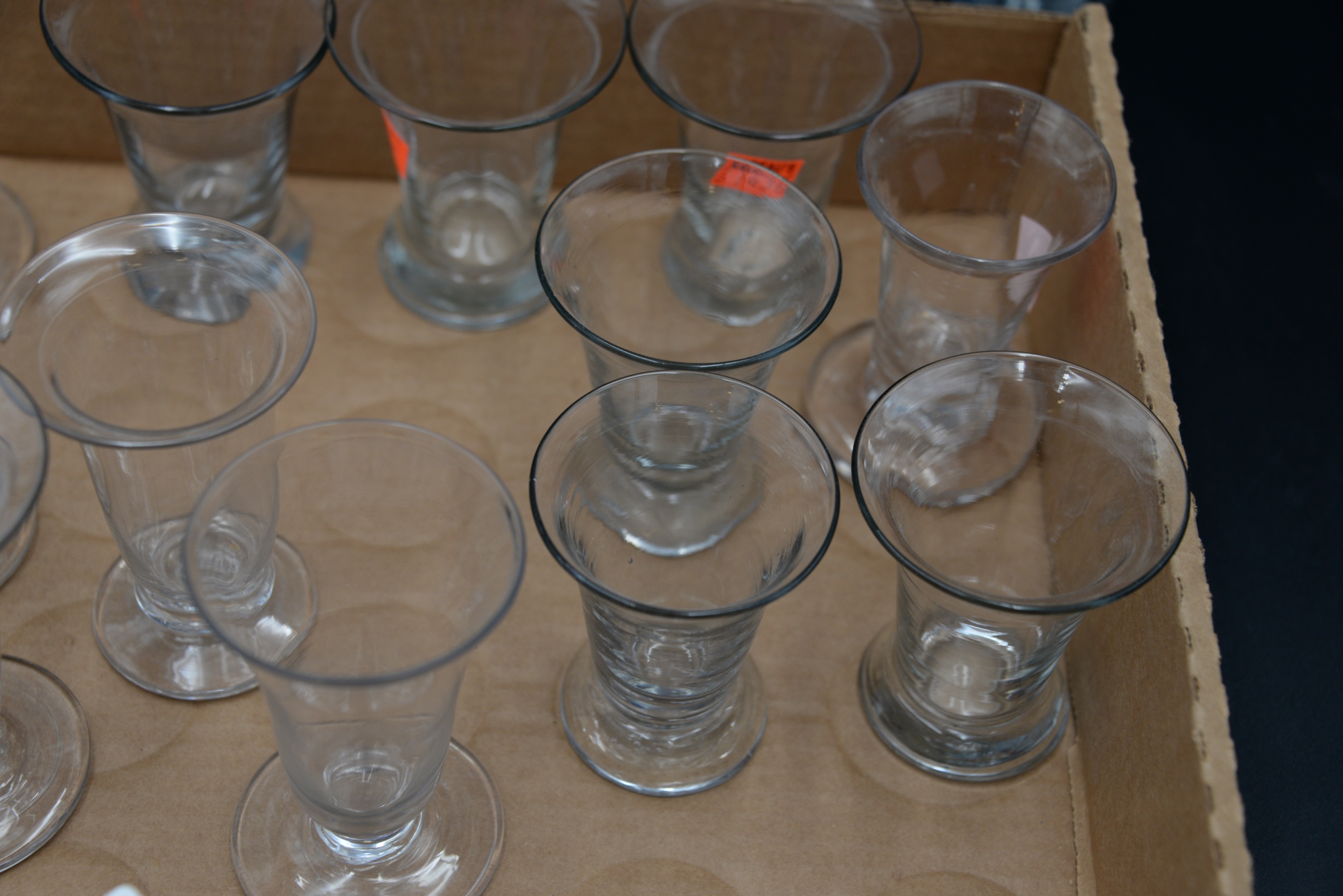 Large Group of 20 Firing Blown Glasses, 18th century, each having tapering cylindrical form, heights 3 – 4 inches. Provenance: Joanne Furst, Northeast Harbor, ME.
