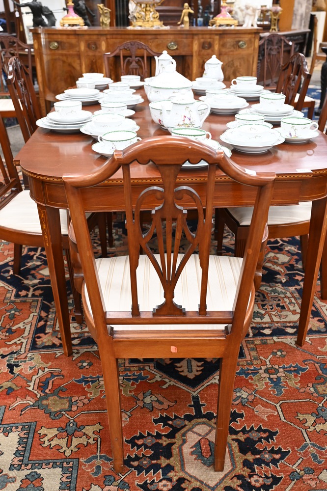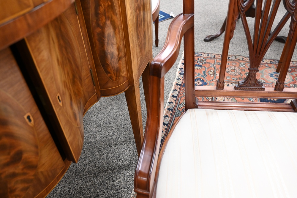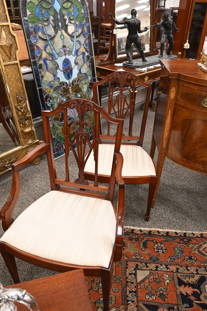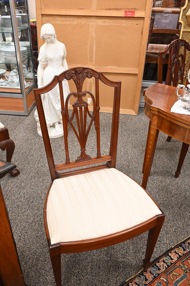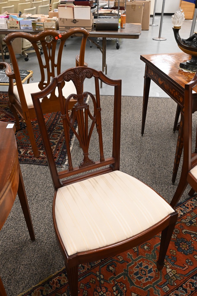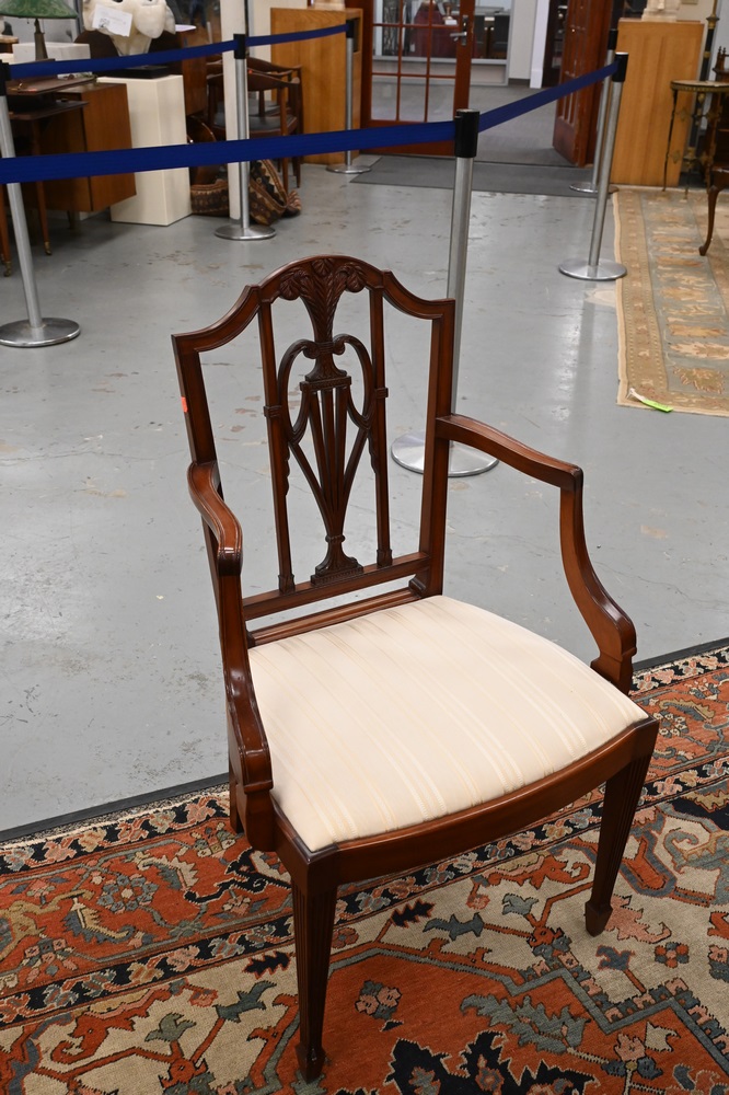 Lot 629: Set of Eight Margolis Federal Style Dining Chairs, to include six side, two arm, all having plume carved and pierced backs, slip sea…