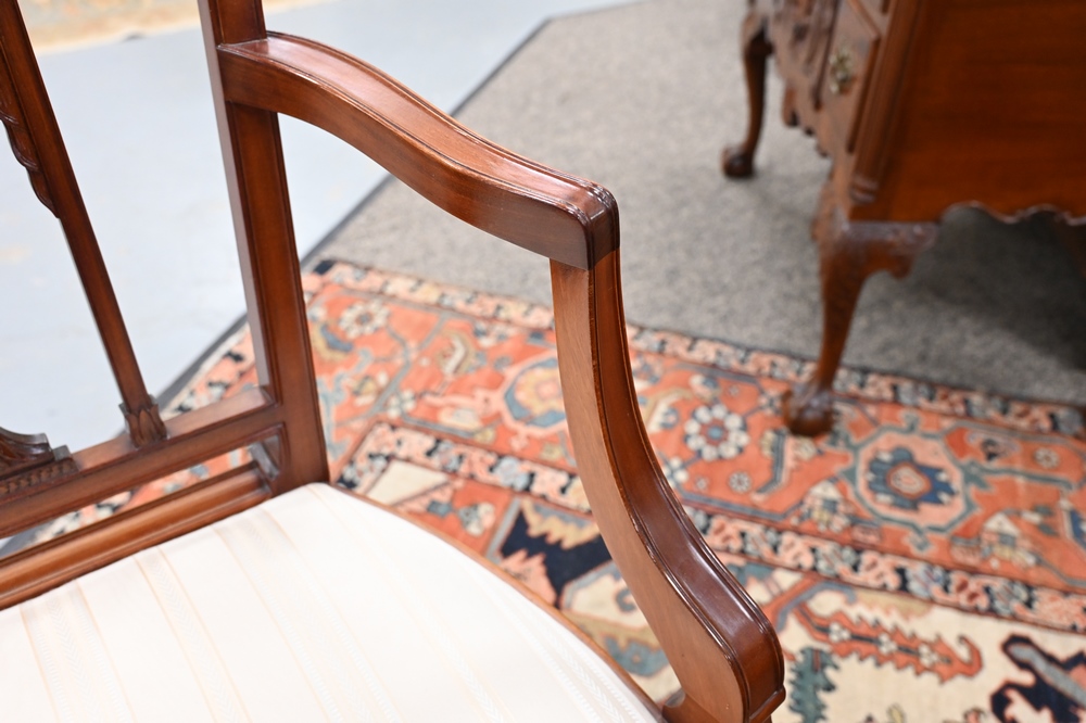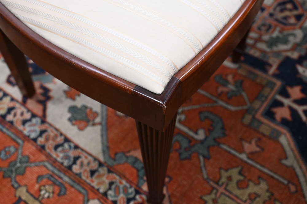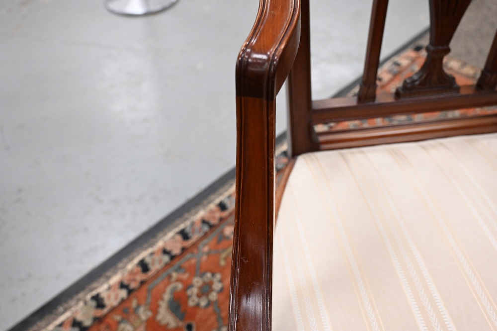 Set of Eight Margolis Federal Style Dining Chairs, to include six side, two arm, all having plume carved and pierced backs, slip seats on square tapered and fluted legs, signed with brand mark, height 38 inches.