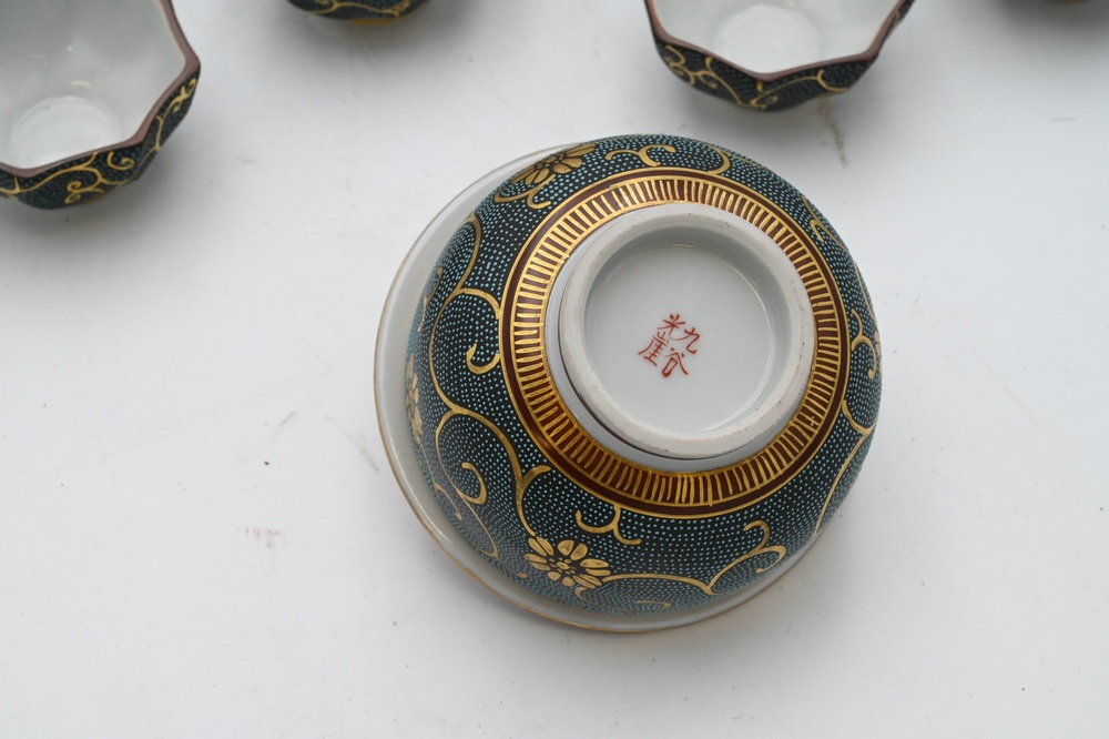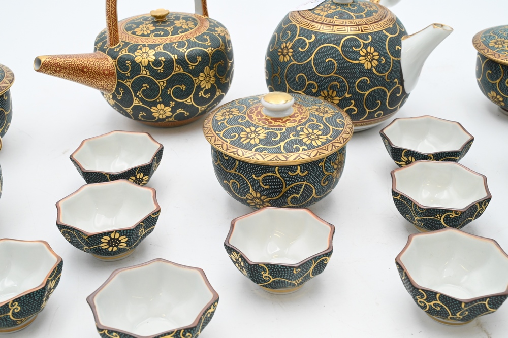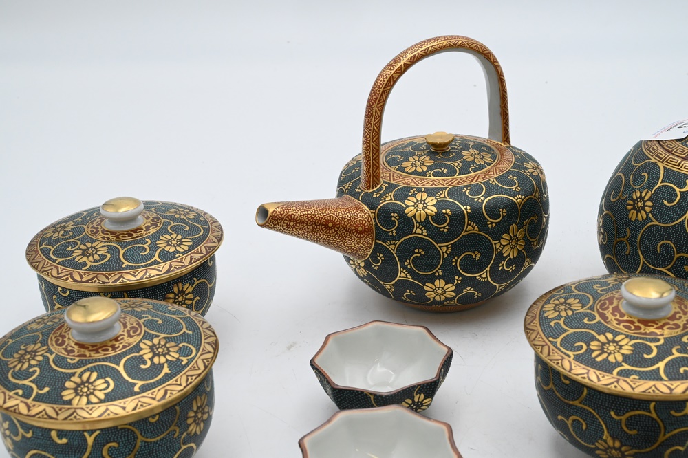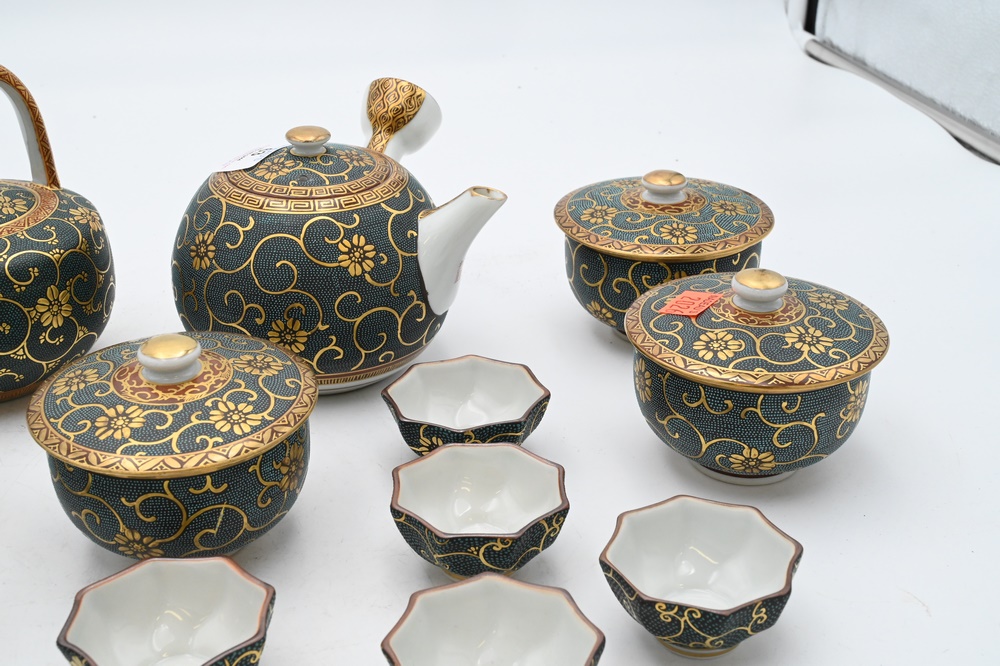 Lot 63: 16 Piece Japanese Porcelain Tea and Coffee Set, having enamel and heavy gold painted decoration, signed on bottom, tallest 5 1/4 inches.