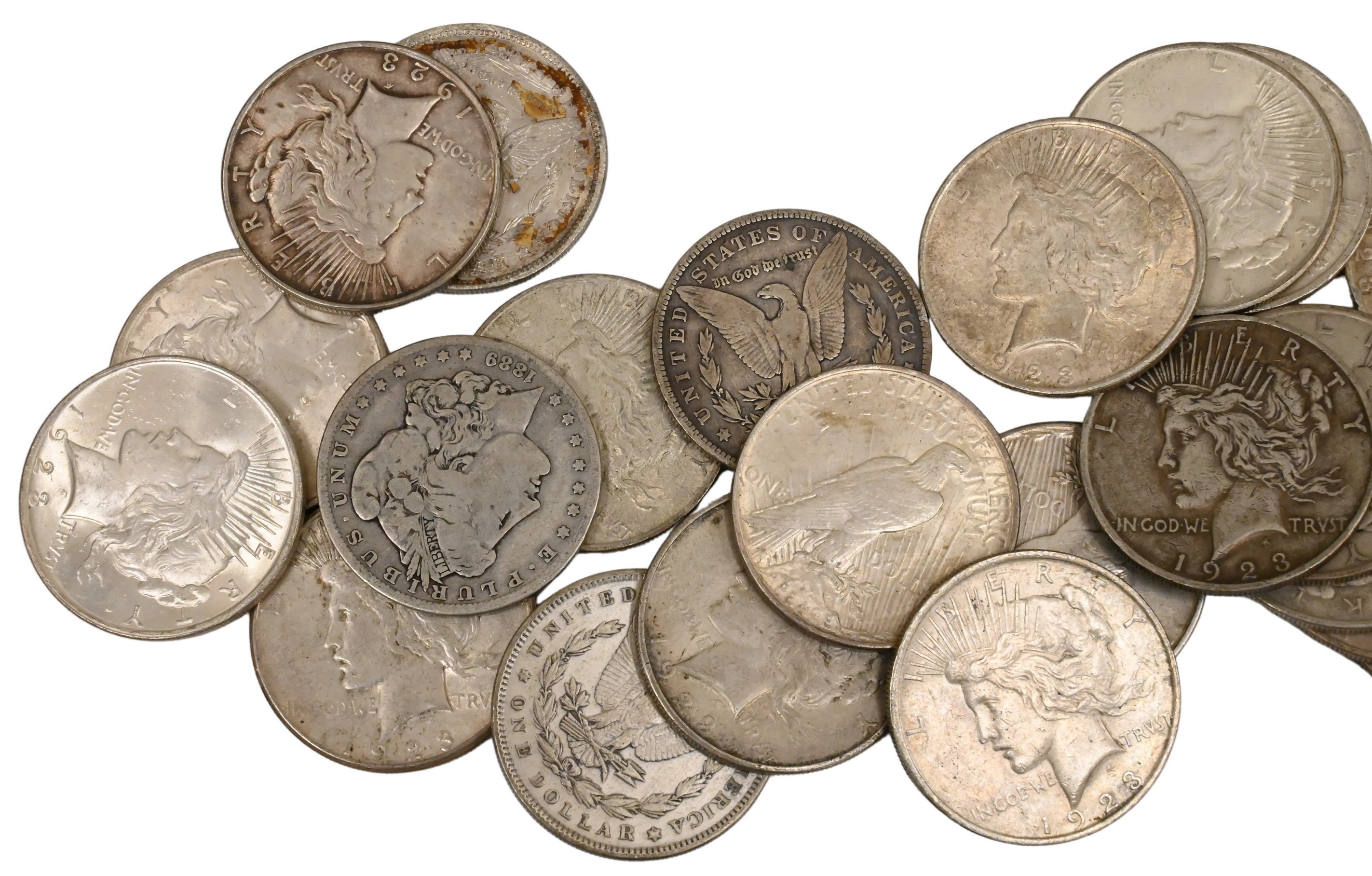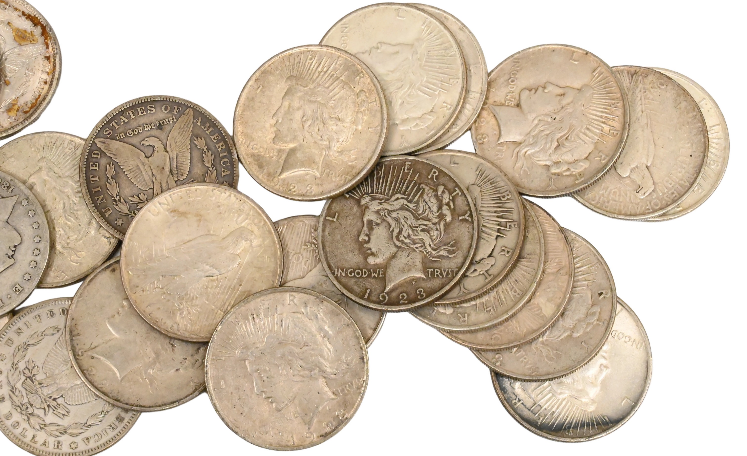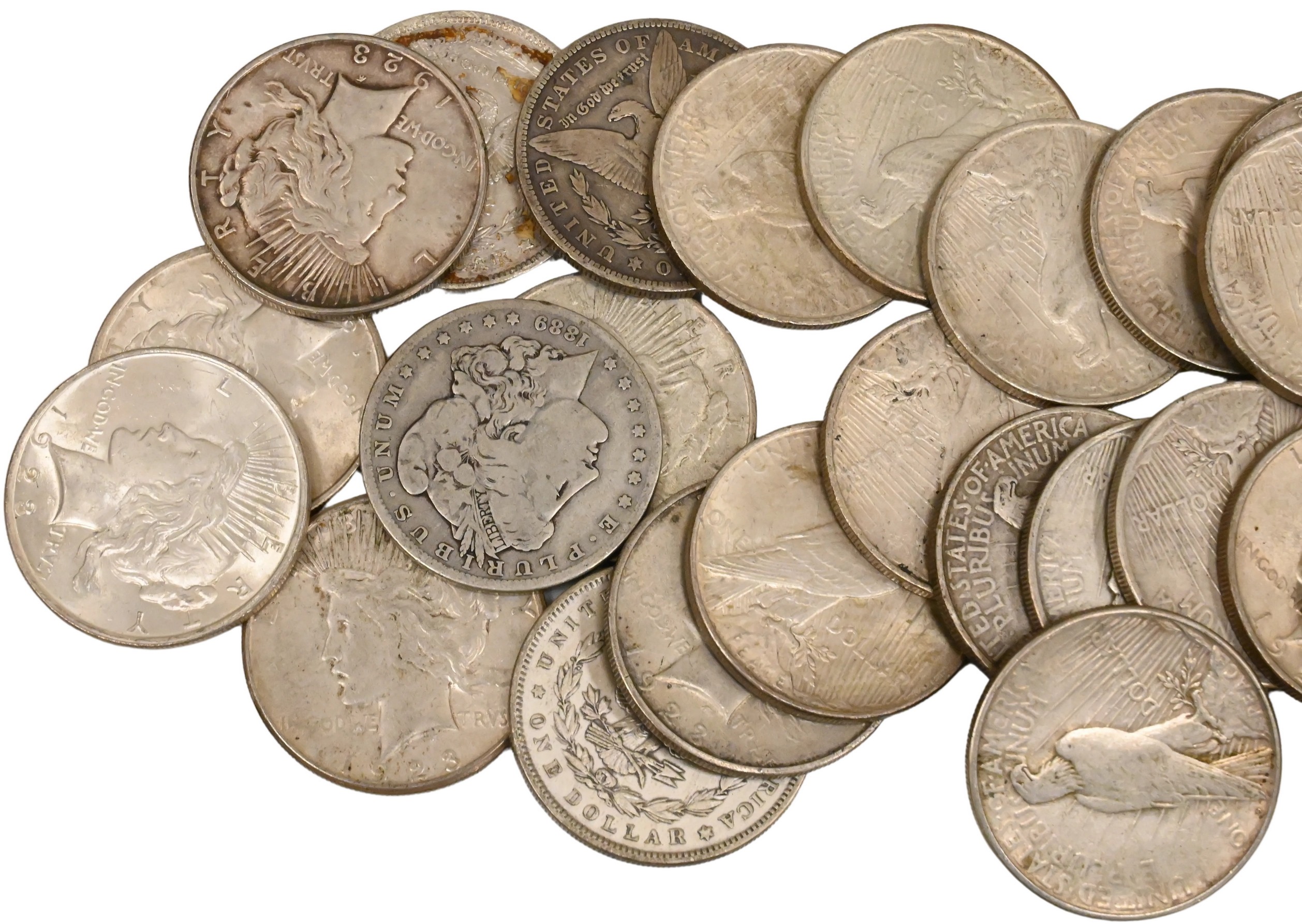 25 Each, 21 Peace, 4 Morgan Dollars F to XF