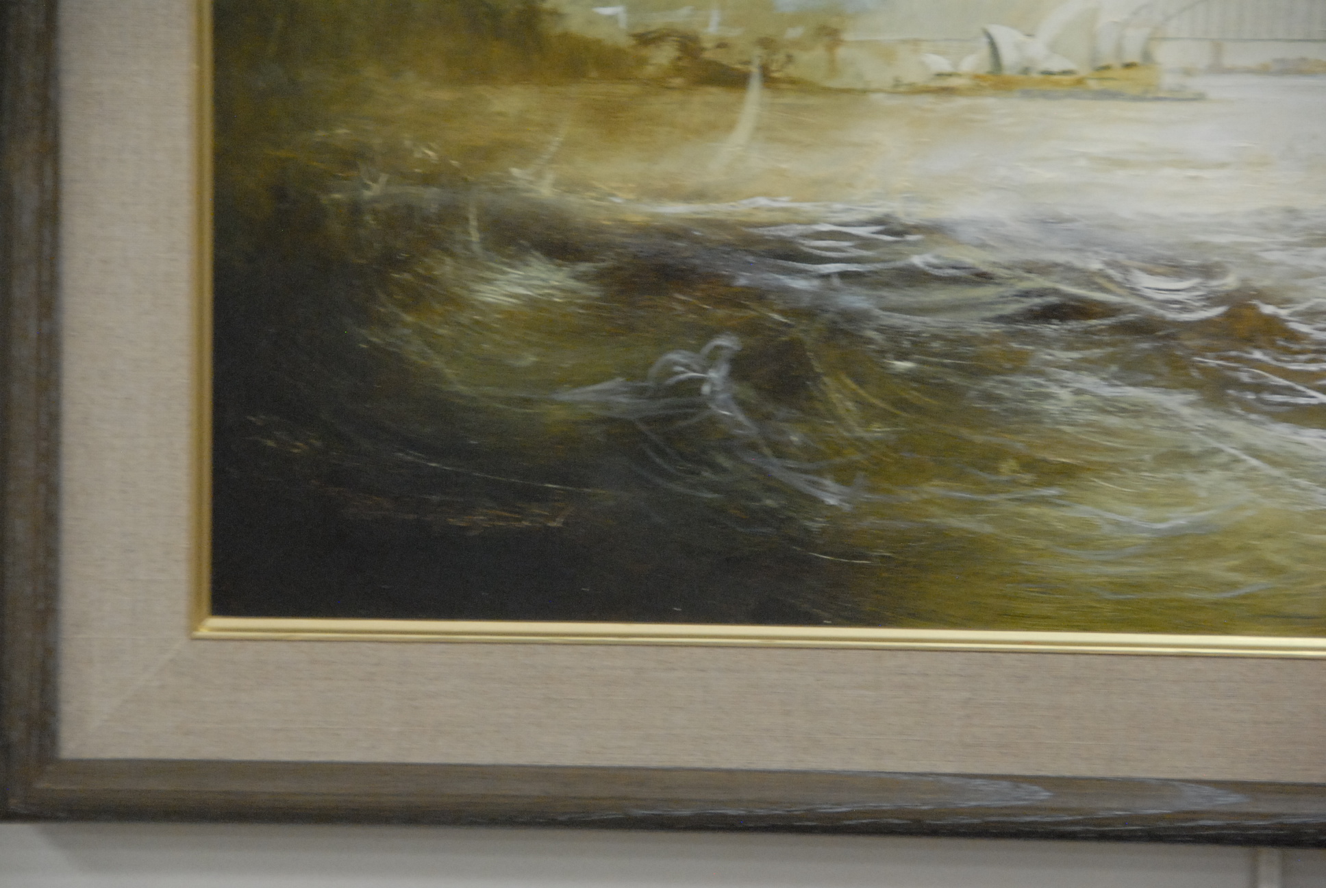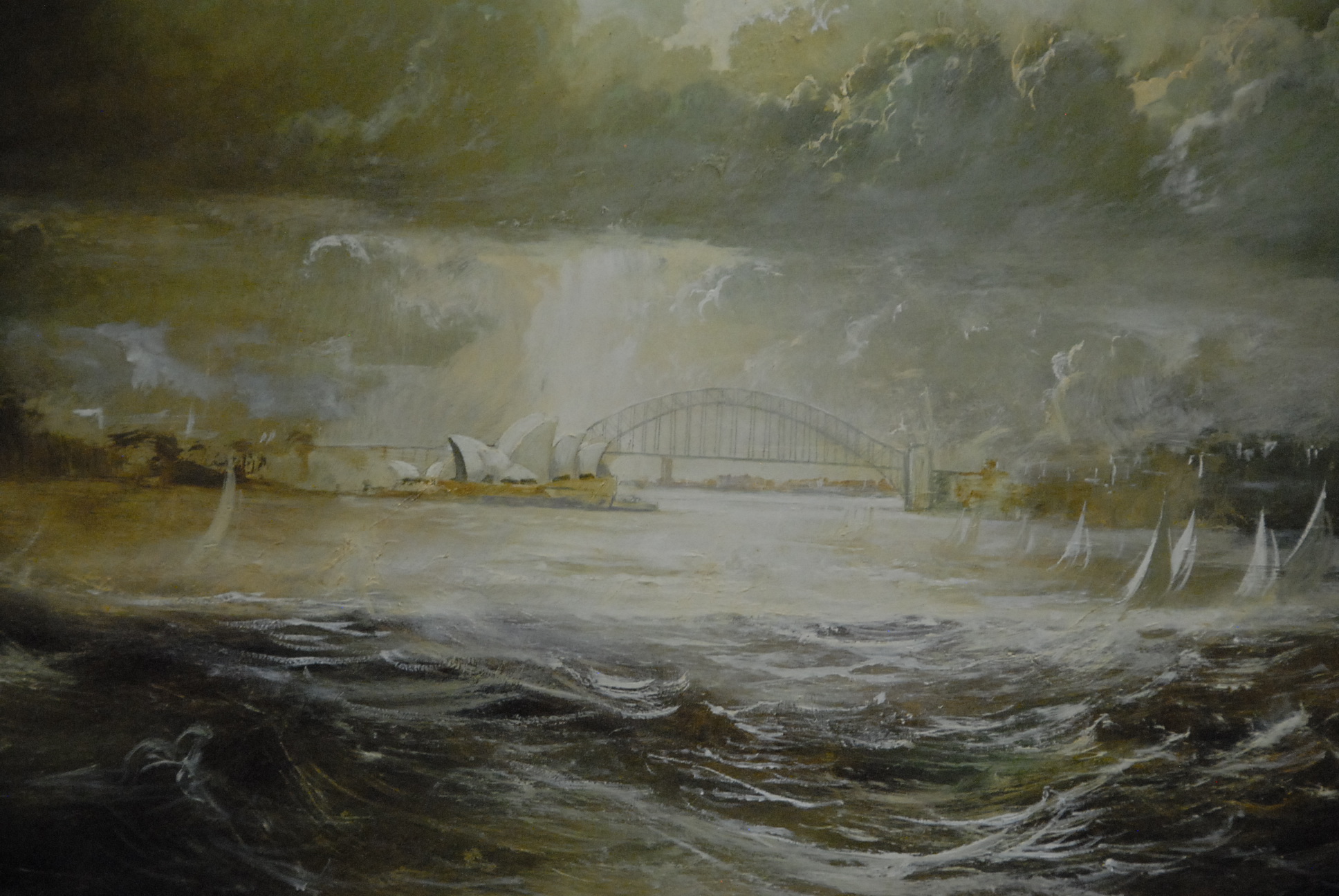 Lot 63: Carl Stringfellow 1954 STORM AT PORT JACKSON oil on masonite signed lower left Stringfellow, 23 1/2 x 26.