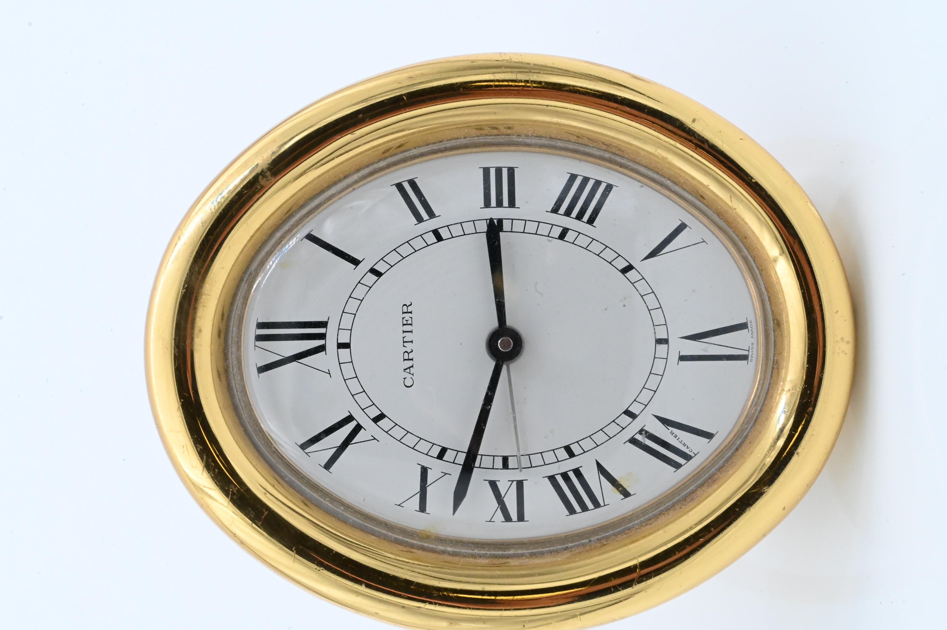 Cartier clock with Roman numeral dial, signed Cartier, Quartz, Swiss Made. 3 inches x 3 1/2 inches.