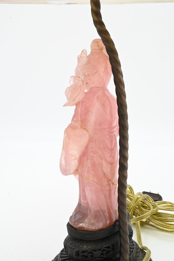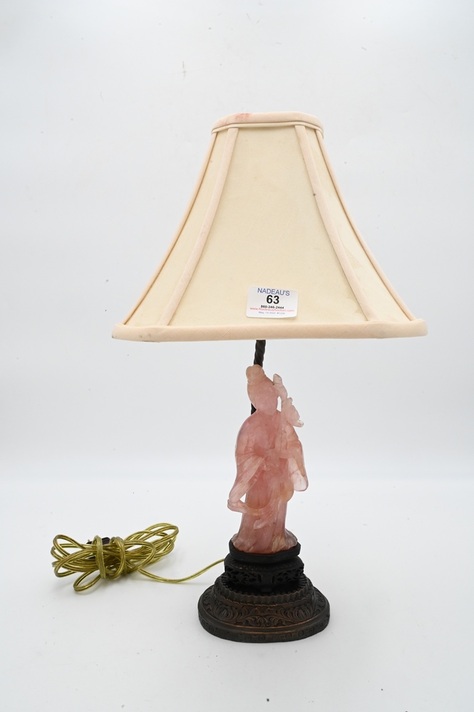 Lot 63: Carved Pink Quartz Figure of a Guanyin, standing figure wearing a robe and holding a vase of flowers, made into table lamp, height 19 inches.