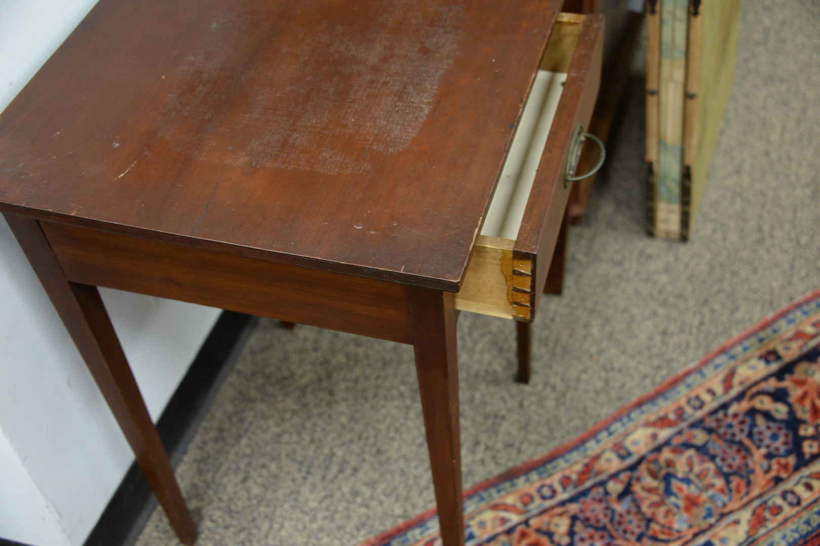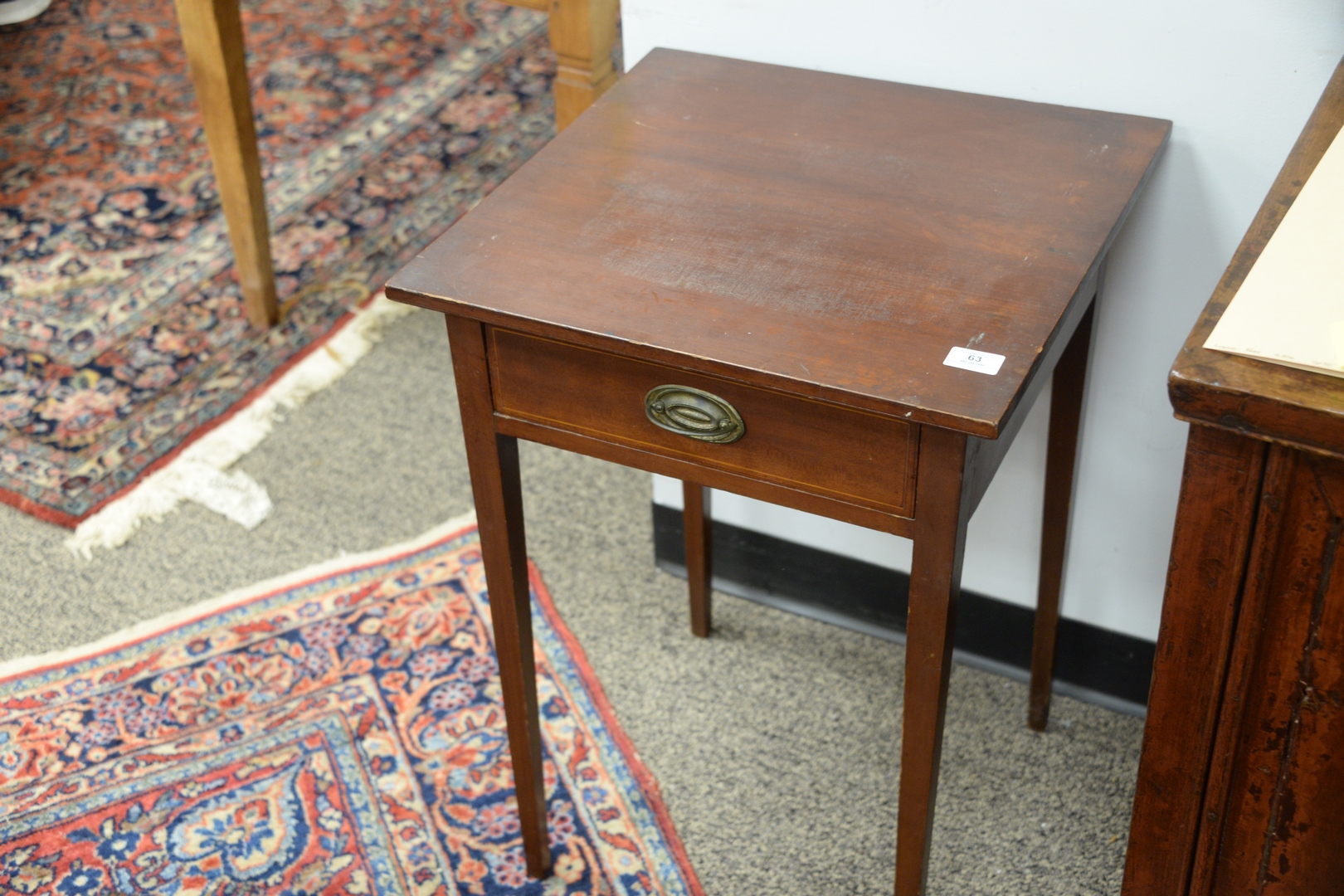 Lot 63: Federal Mahogany One Drawer Stand having inlaid drawer front on tapered legs, height 27 1/2 inches, top 19 x 19 1/2.