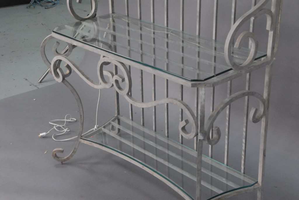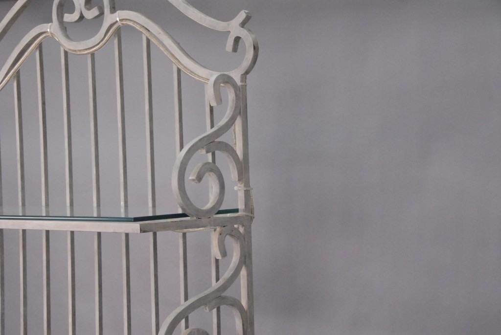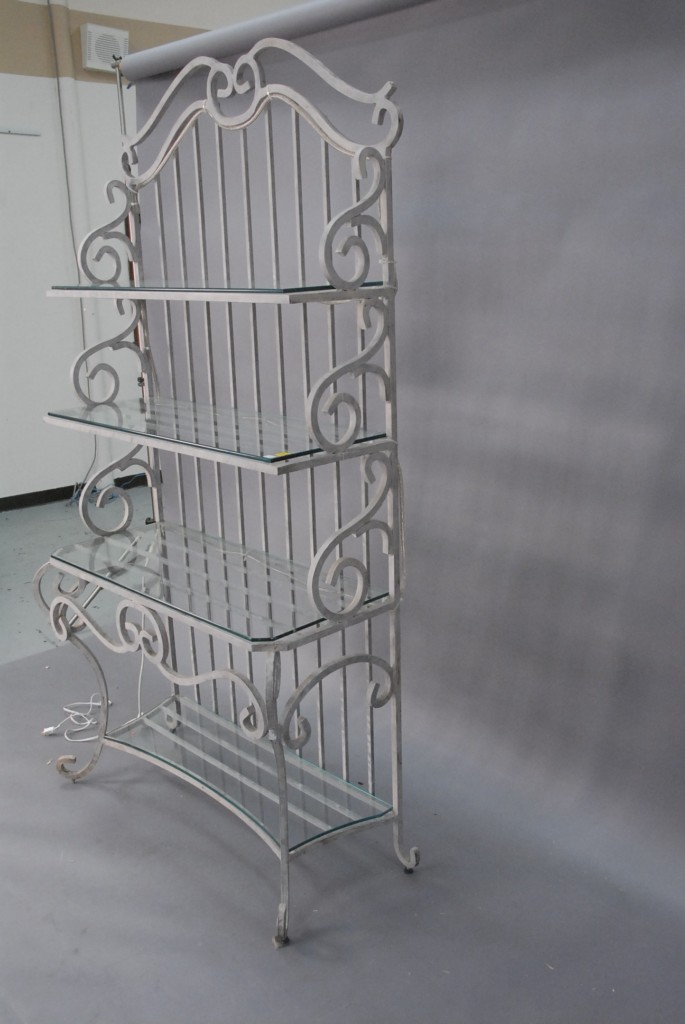 French style wrought iron and glass baker’s rack, ht. 84, wd. 44.