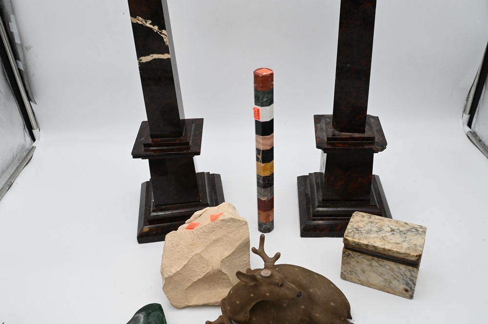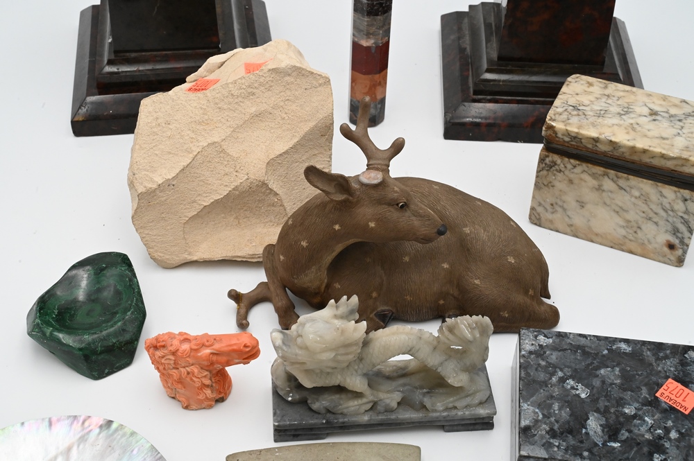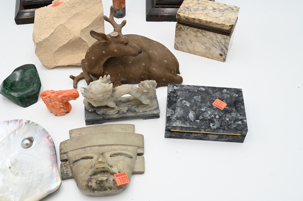 Group of Assorted Items, to include Teotihuacan style stone mask, store dragon, malachite stone, coral horse head, shell, two stone boxes, pair of large obelisk (as is) along with Japanese Bizan stag or deer.