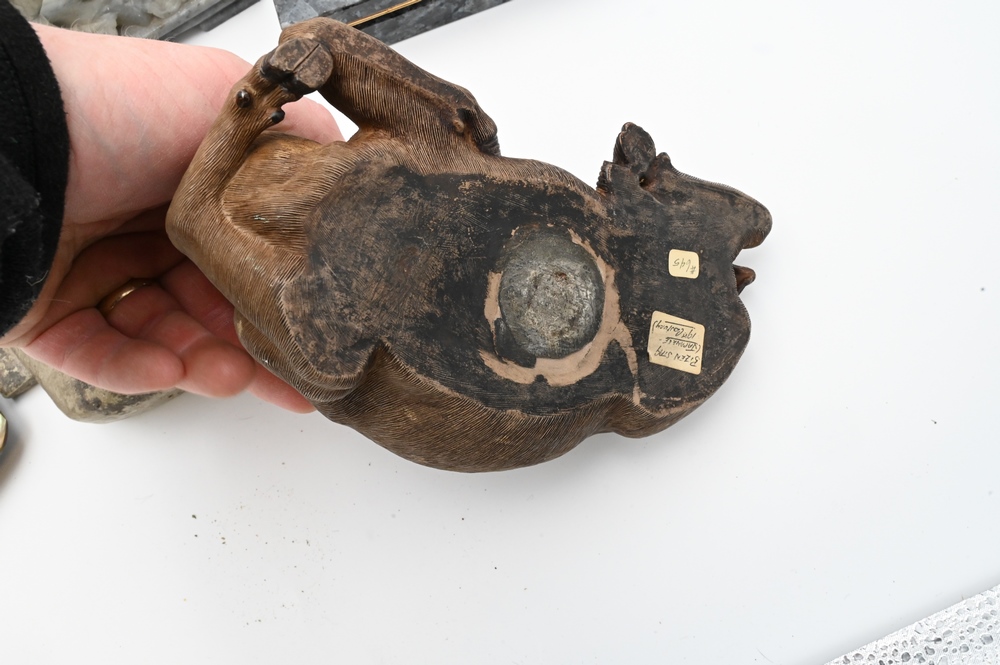 Lot 63: Group of Assorted Items, to include Teotihuacan style stone mask, store dragon, malachite stone, coral horse head, shell, two stone boxes, pair of large obelisk (as is) along with Japanese Bizan stag or deer.