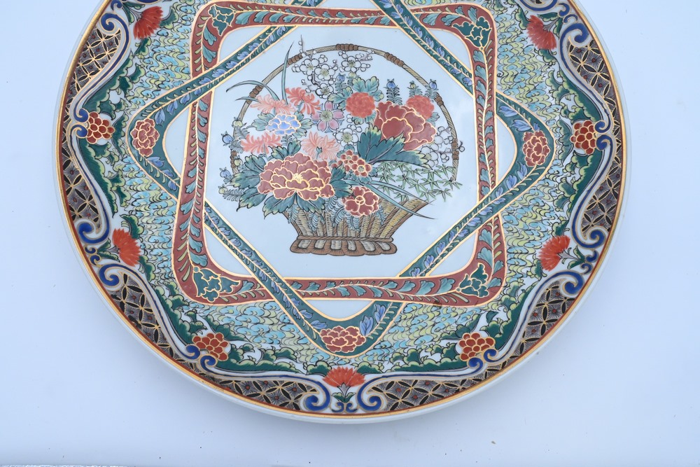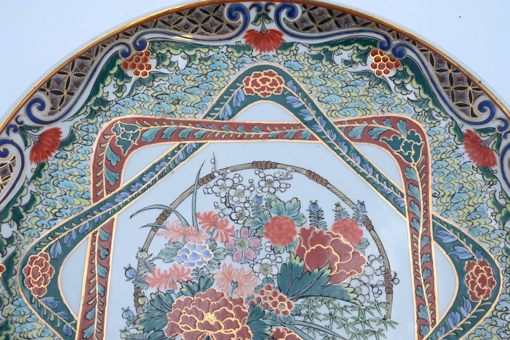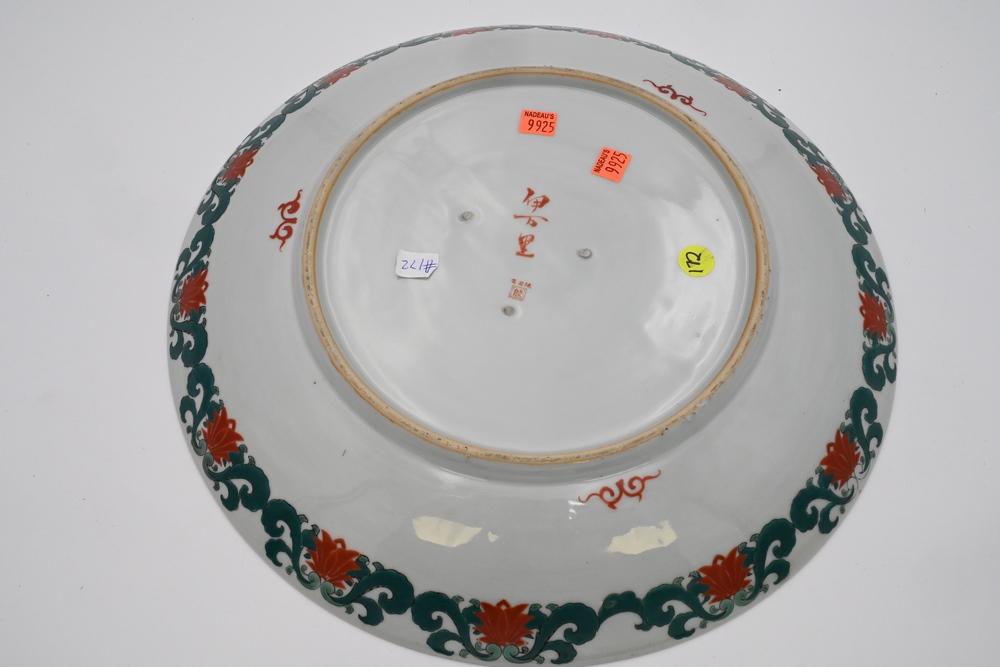 Lot 63: Large Chinese Famille Verte Porcelain Charger having painted and enameled flowers in a basket, center with scrolling vines and flowers around exterior signed on bottom diameter 16 1/4 inches Provenance: From a private New York City collection.