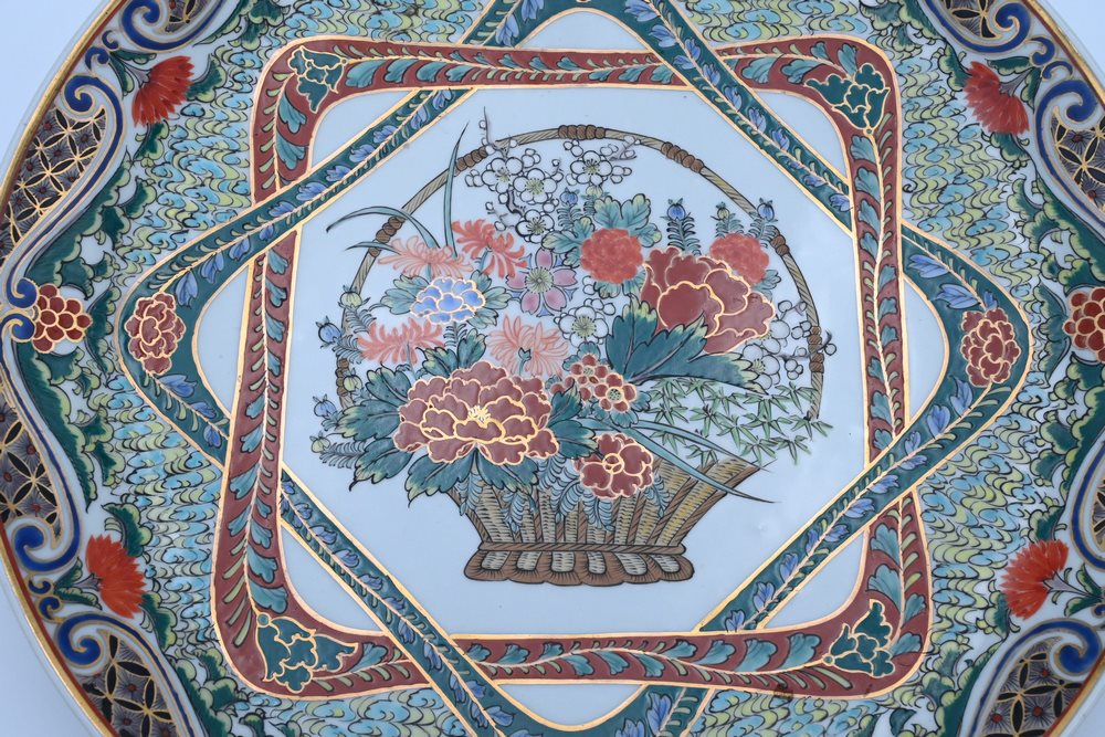 having painted and enameled flowers in a basket, center with scrolling vines and flowers around exterior