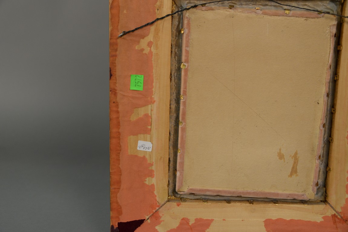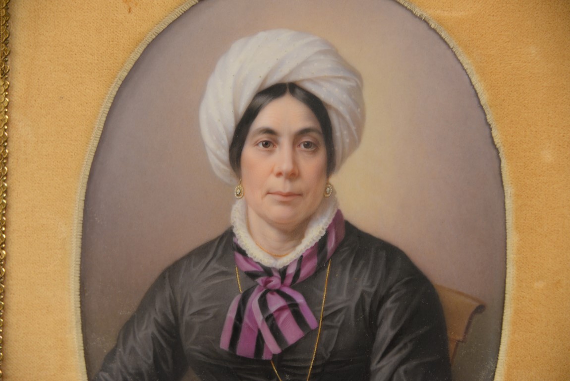 Lot 63: Oval painting on porcelain of a woman with a purple scarf and gold pocket watch chain. sight size 7 1/4 x 5 1/4