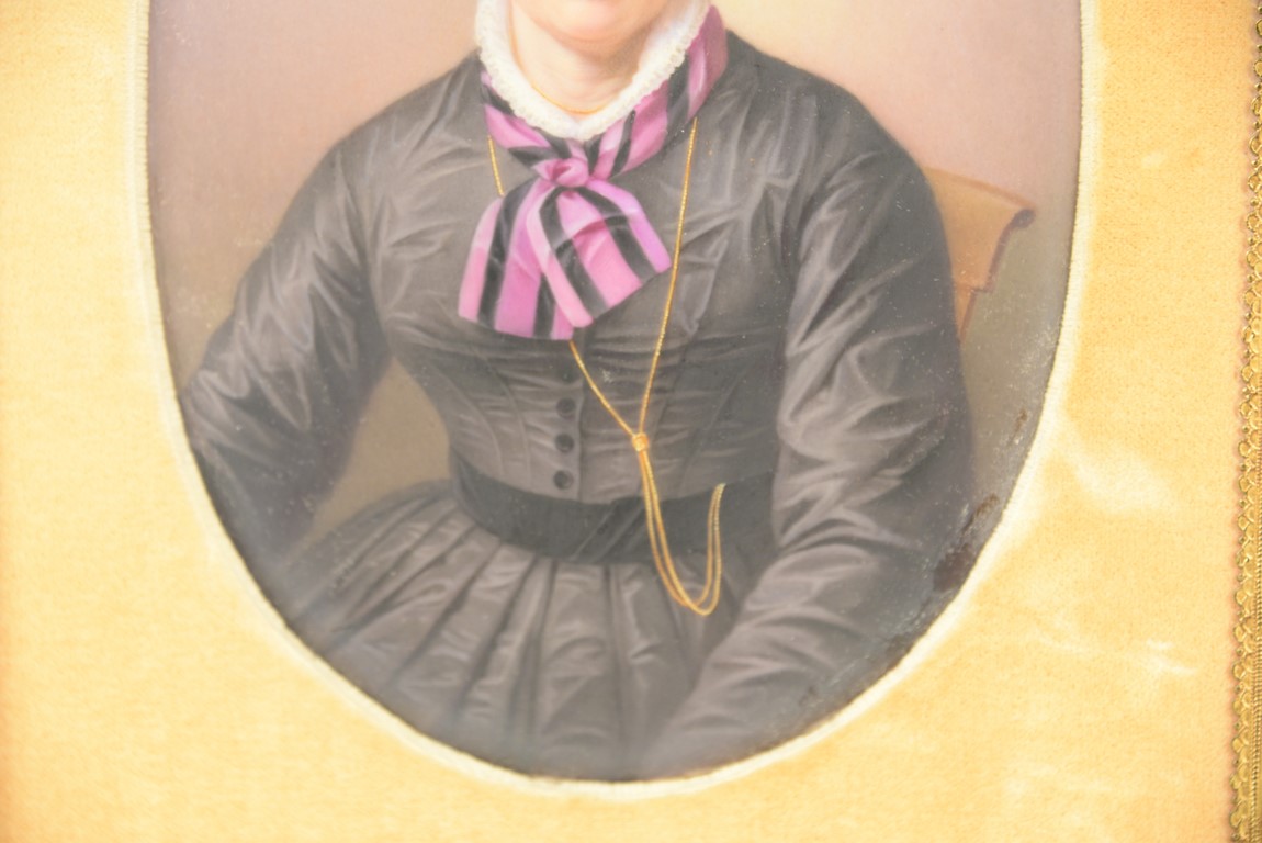 Oval painting on porcelain of a woman with a purple scarf and gold pocket watch chain. sight size 7 1/4 x 5 1/4