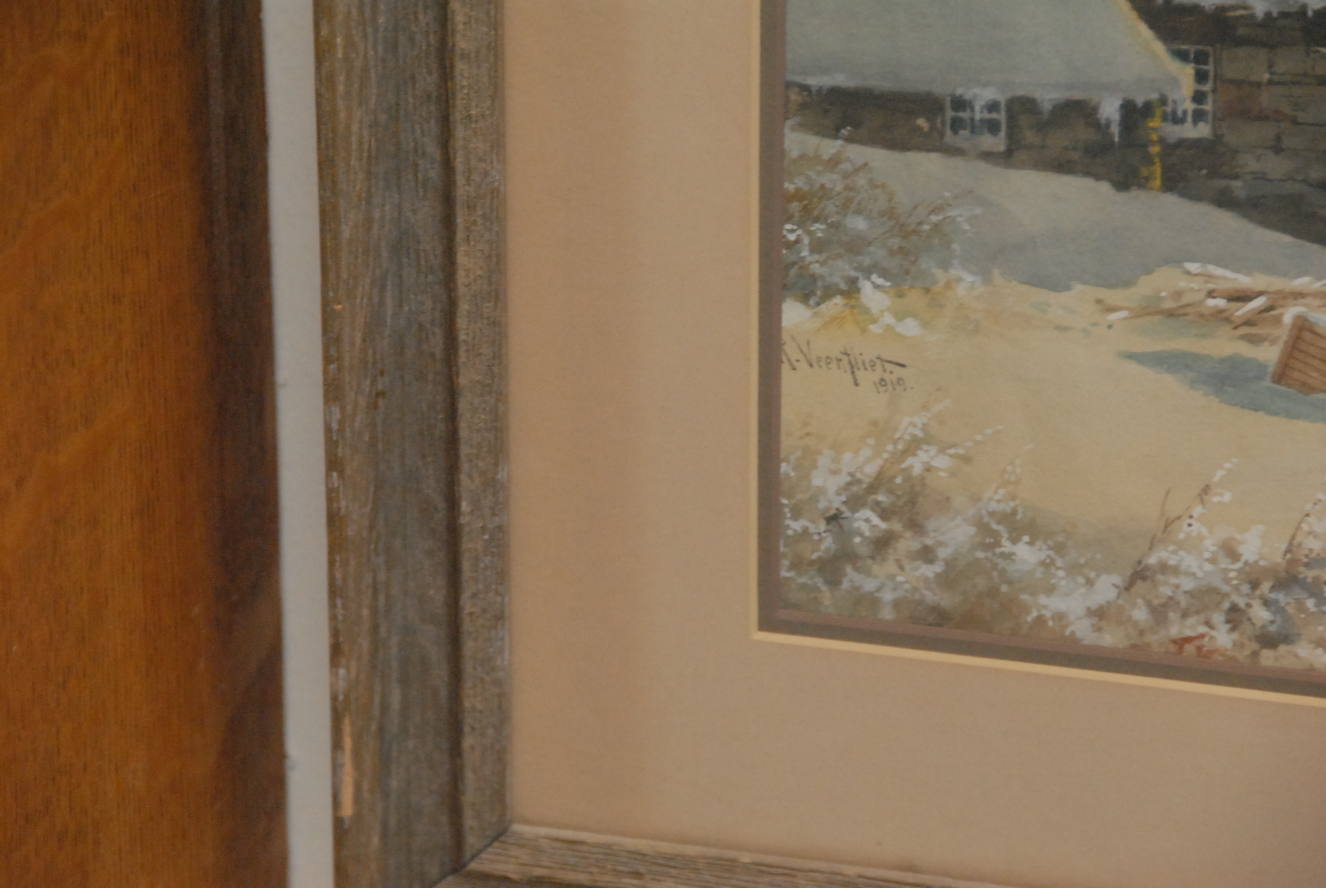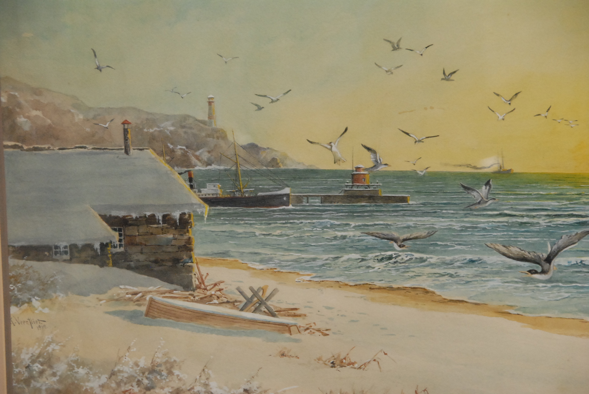 Richard Veenfliet 1843-1922 watercolor, winter sunset on oceans edge, signed lower left R. Veenfliet 1919.