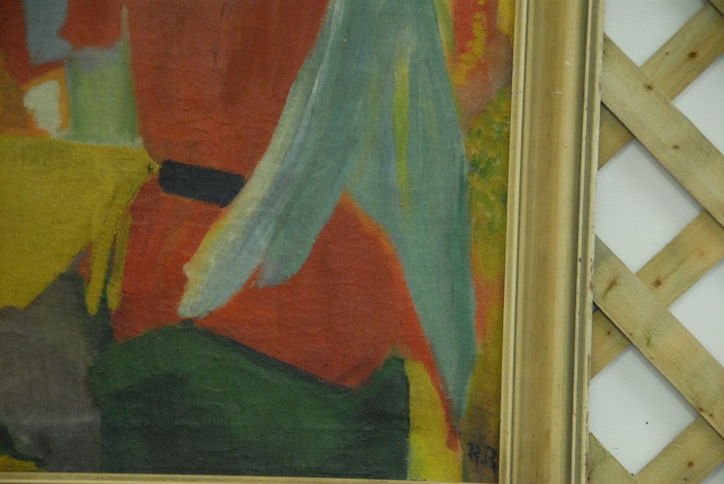 Lot 63: Robert Roberts abstract oil on canvas initialed lower right R.R. having paper label on reverse and written on reverse of canvas Nov…