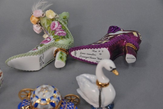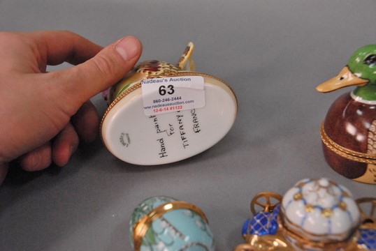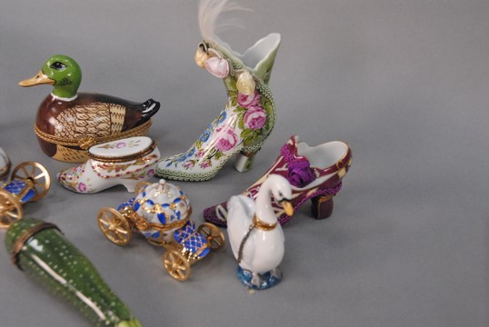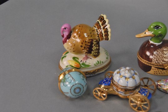 Ten trinket boxes to include Rochard Limoges France and Staffordshire, two Cinderella coach, pepper, shoe, four Limoges trinket boxes, two Tiffany & Co. duck and turkey, and two Limoges France peint main, Fiona Sanders