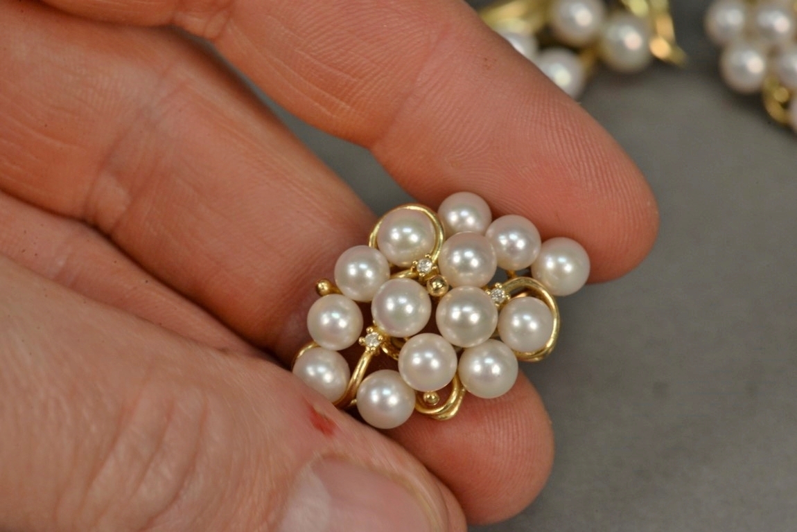 Three piece lot to include 14K gold and cultured pearl spray pin and cultured pearl and 14K cluster earrings, each set with three small diamonds.